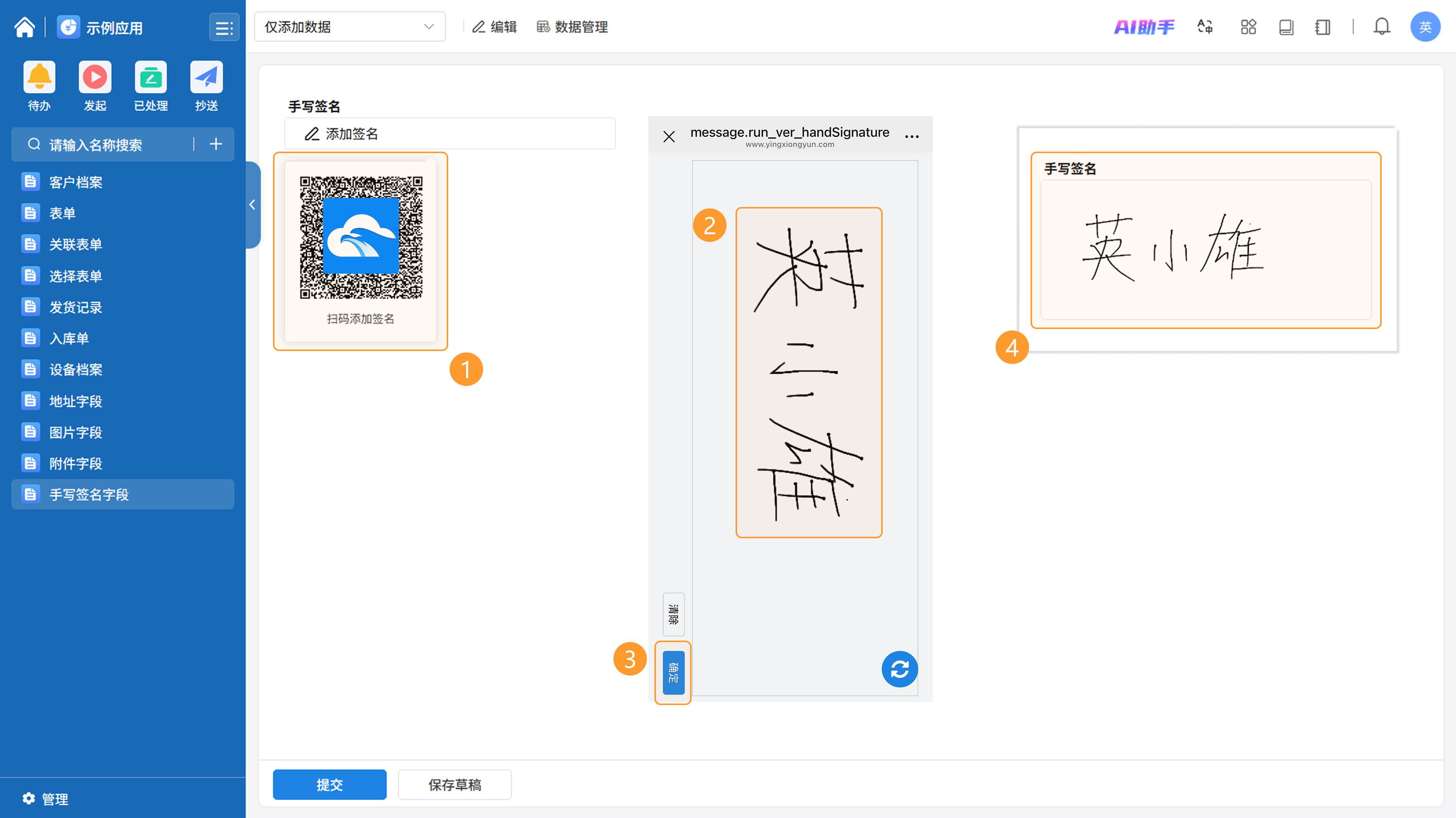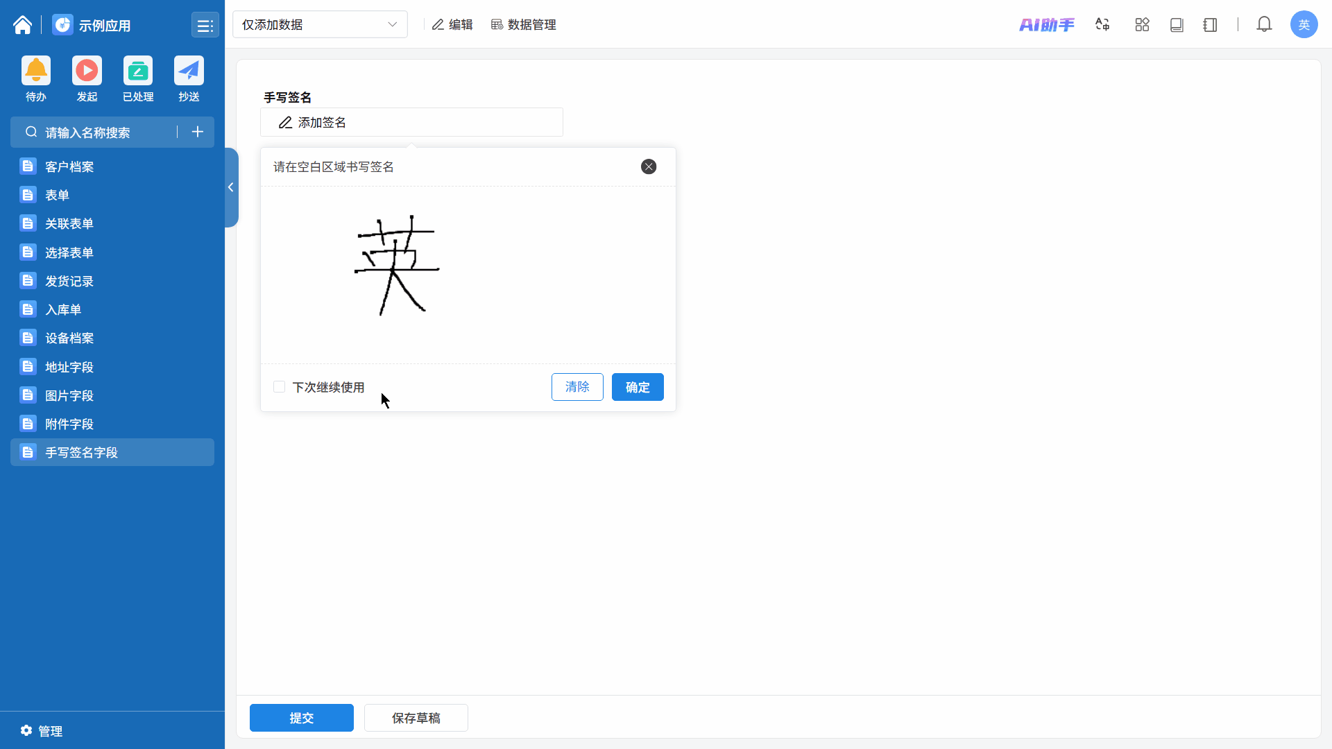 手写签名字段是在表单填写或流程审批时,支持通过采集填写人的手写笔迹并上传,以确保数据的真实性与不可抵赖性。签名完成后,系统将其作为图片格式存储在表单记录中。