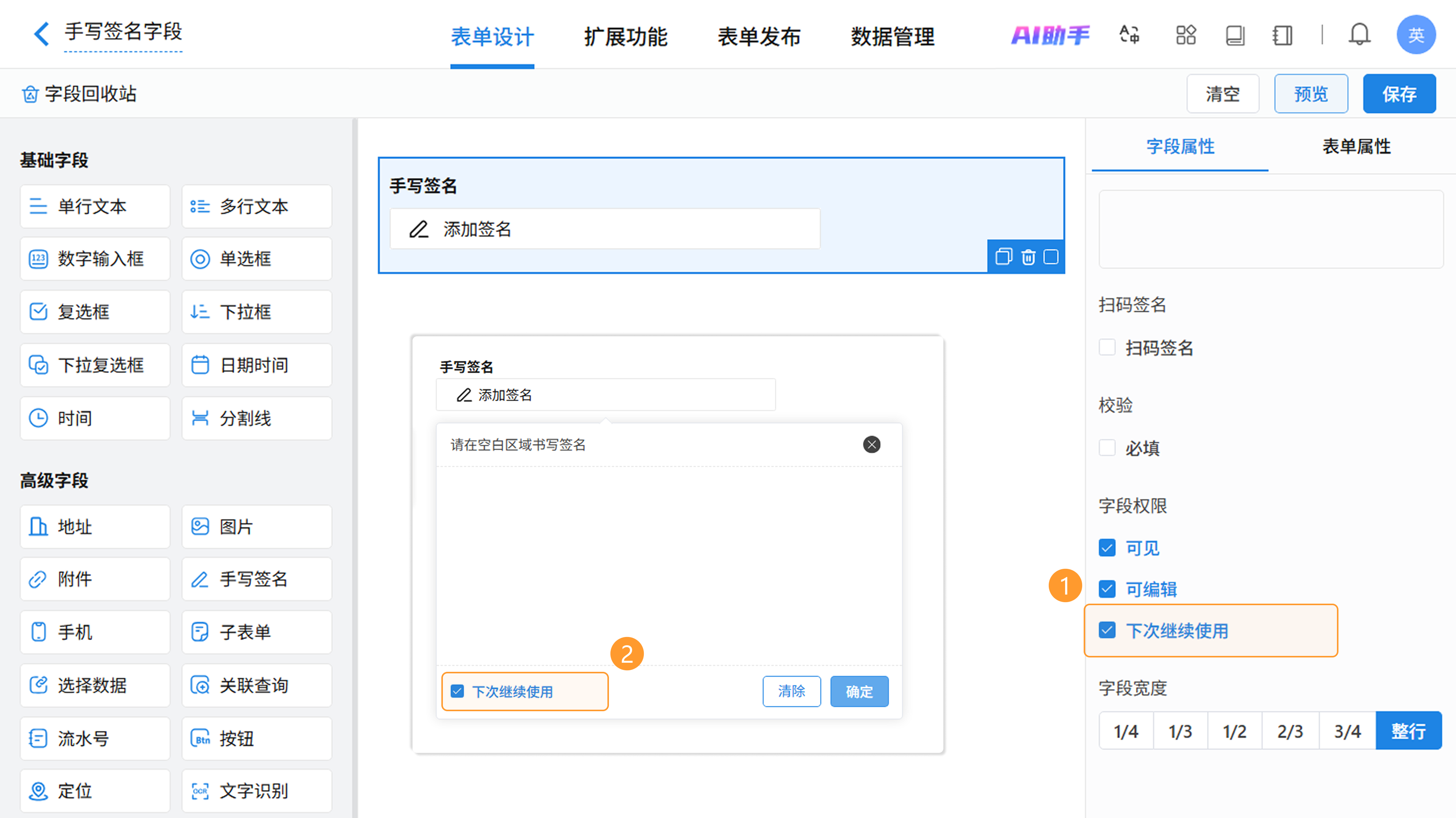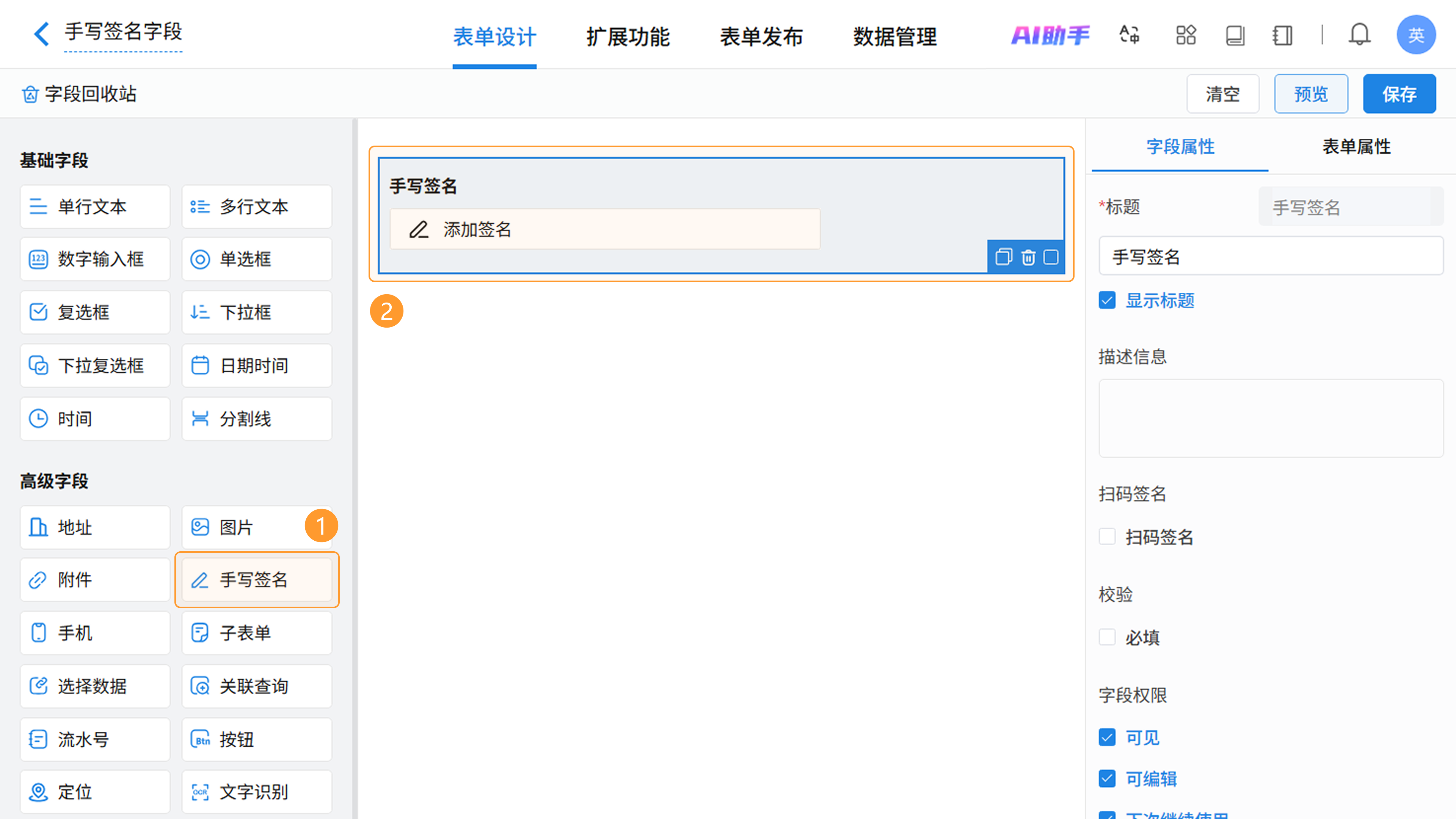 在表单设计页面,从左侧字段区拖拽或点击即可添加手写签名字段,在右侧属性区进行配置。