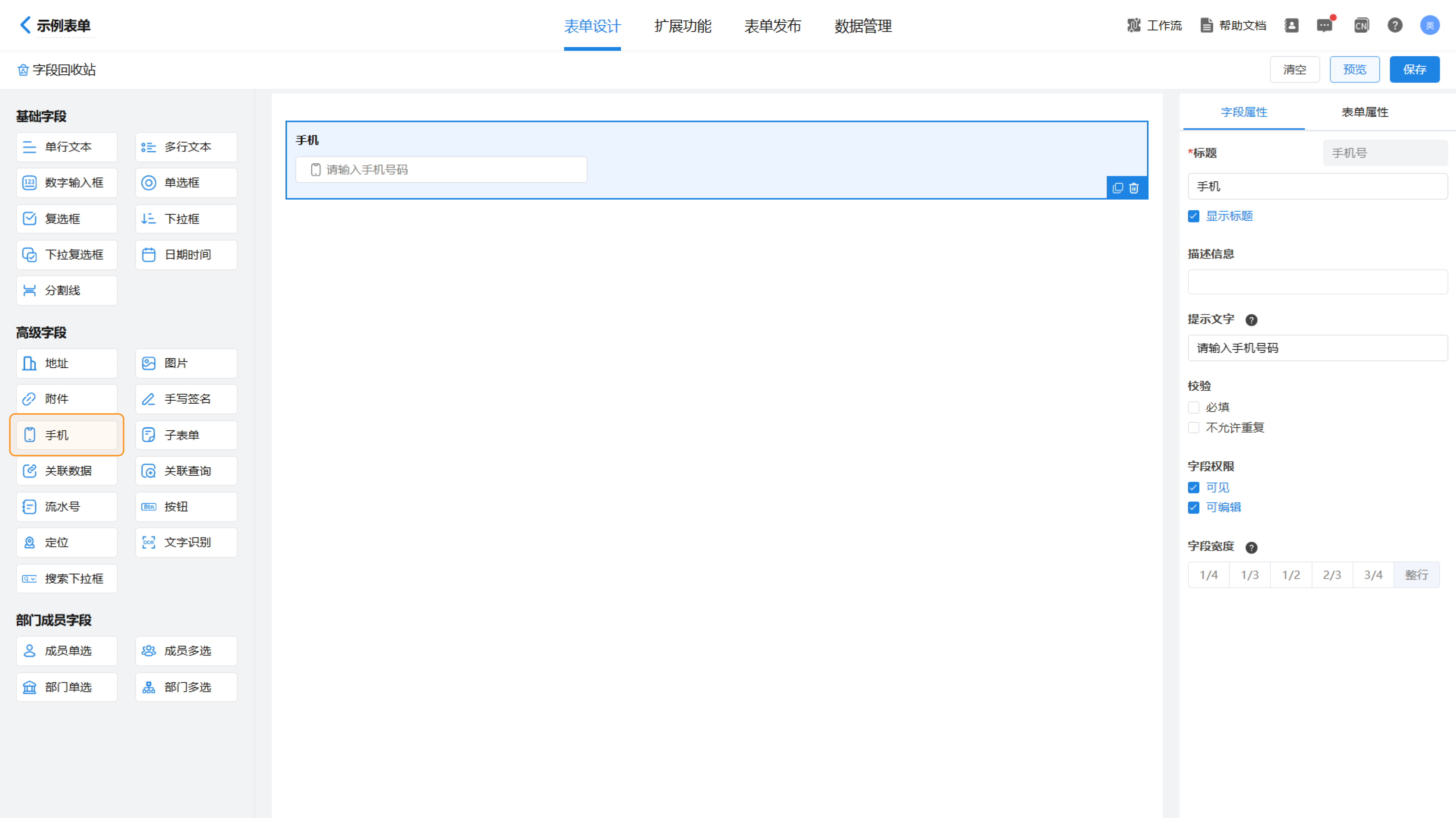 手机字段能够检验用户所输信息是否为符合大陆手机号格式(11位数),保证了当表单需要填写手机号码时填入的手机号格式的正确性和真实性,主要应用于收集客户信息、员工信息等场景。