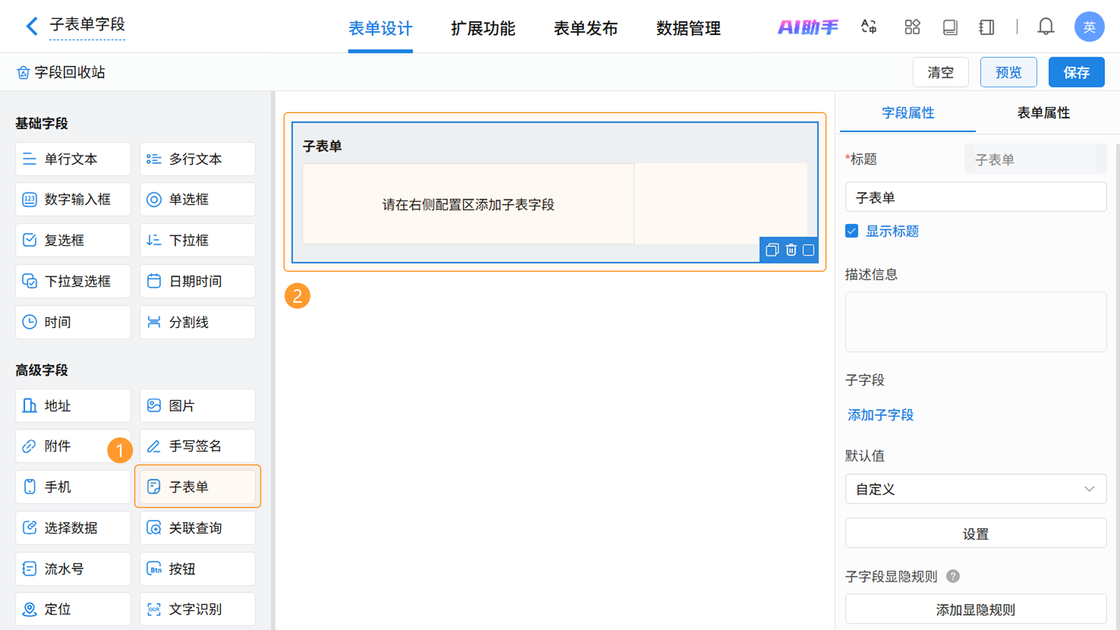 设置路径:在表单设计页面,从左侧字段区拖拽或点击即可添加子表单字段,在右侧属性区进行配置。