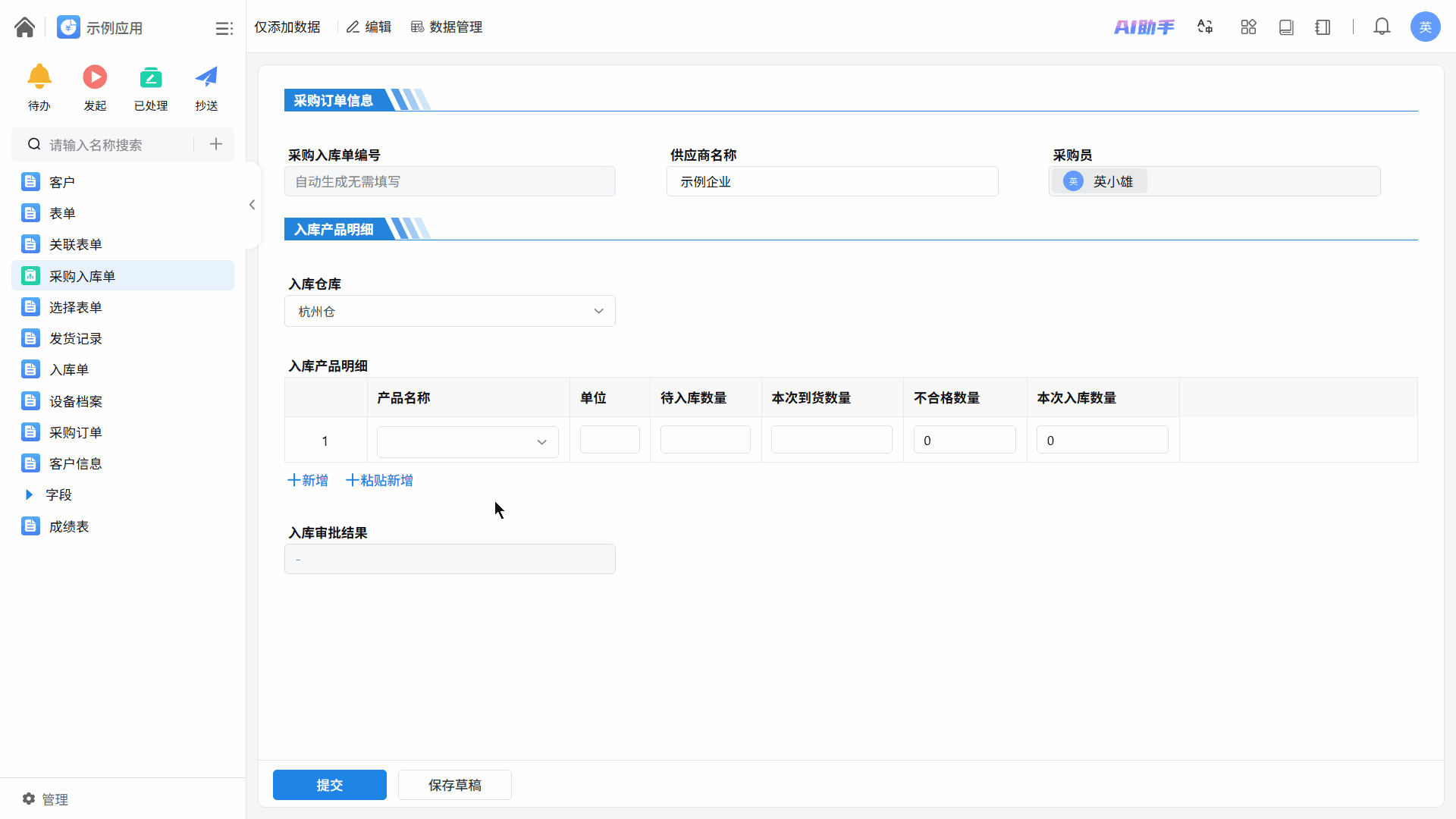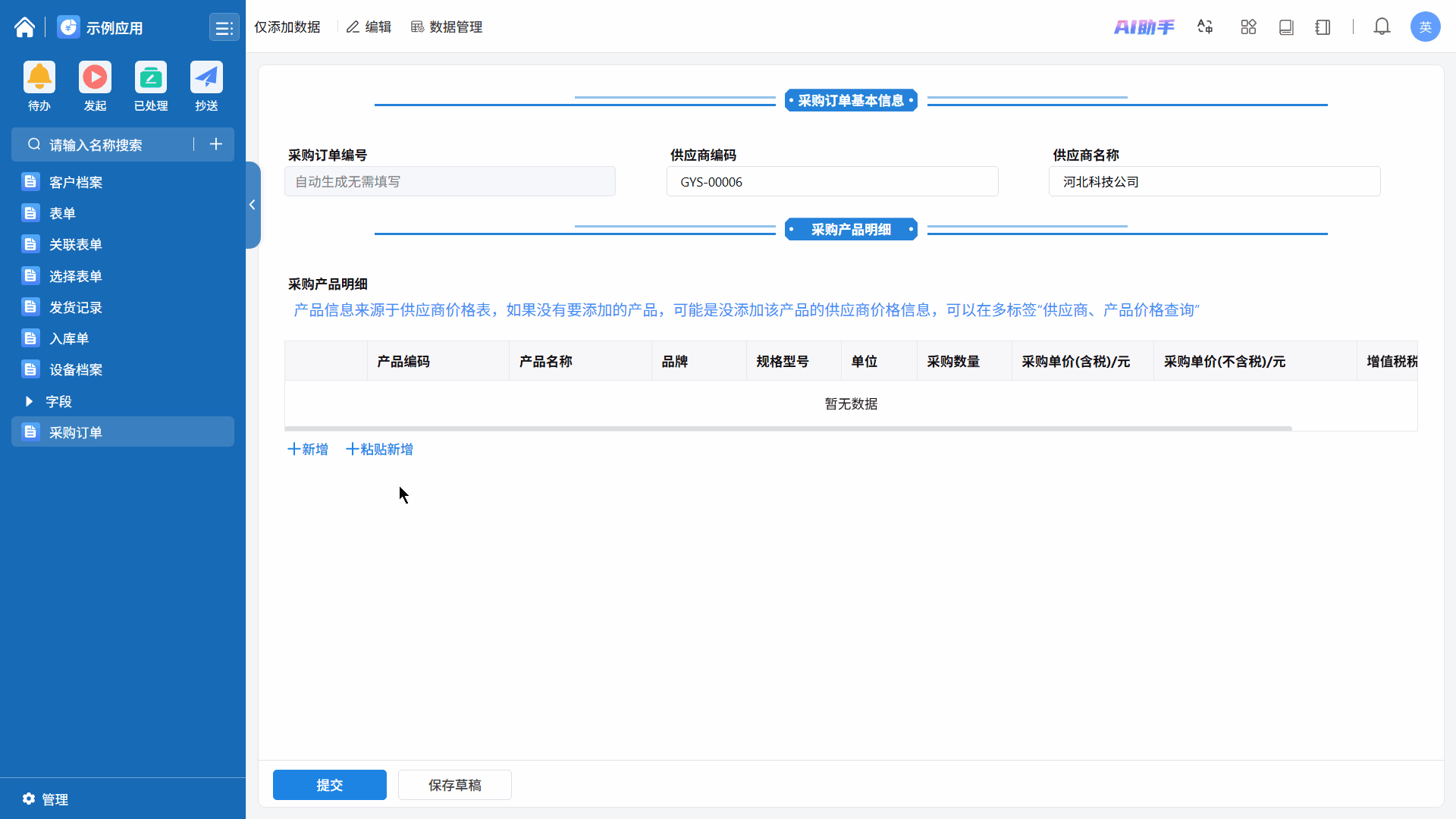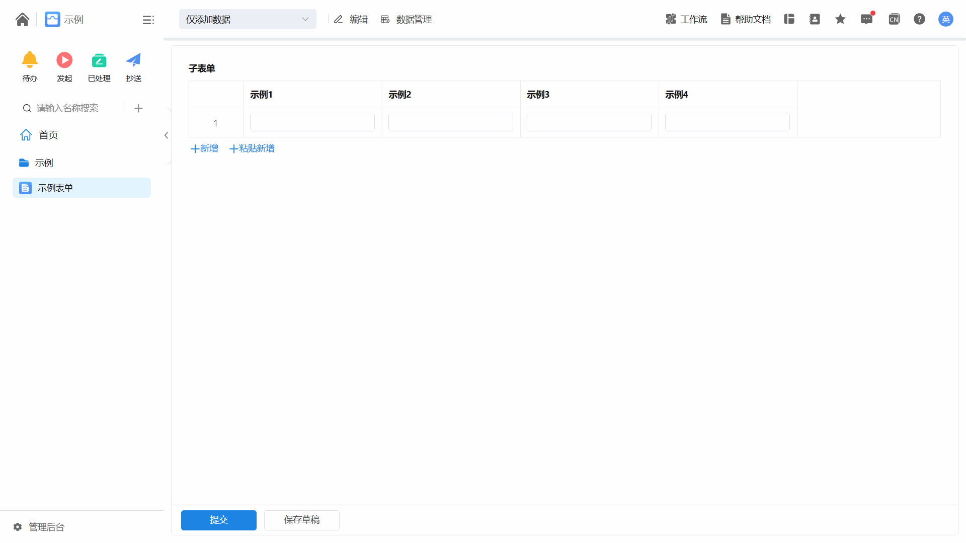 子表单是嵌套在主表单中的“明细表,用于处理单条主记录下一条或多条的关联数据。它能够实现数据间 1:1 或 1:N 的复杂结构,是构建 ERP、进销存等业务系统的核心组件。