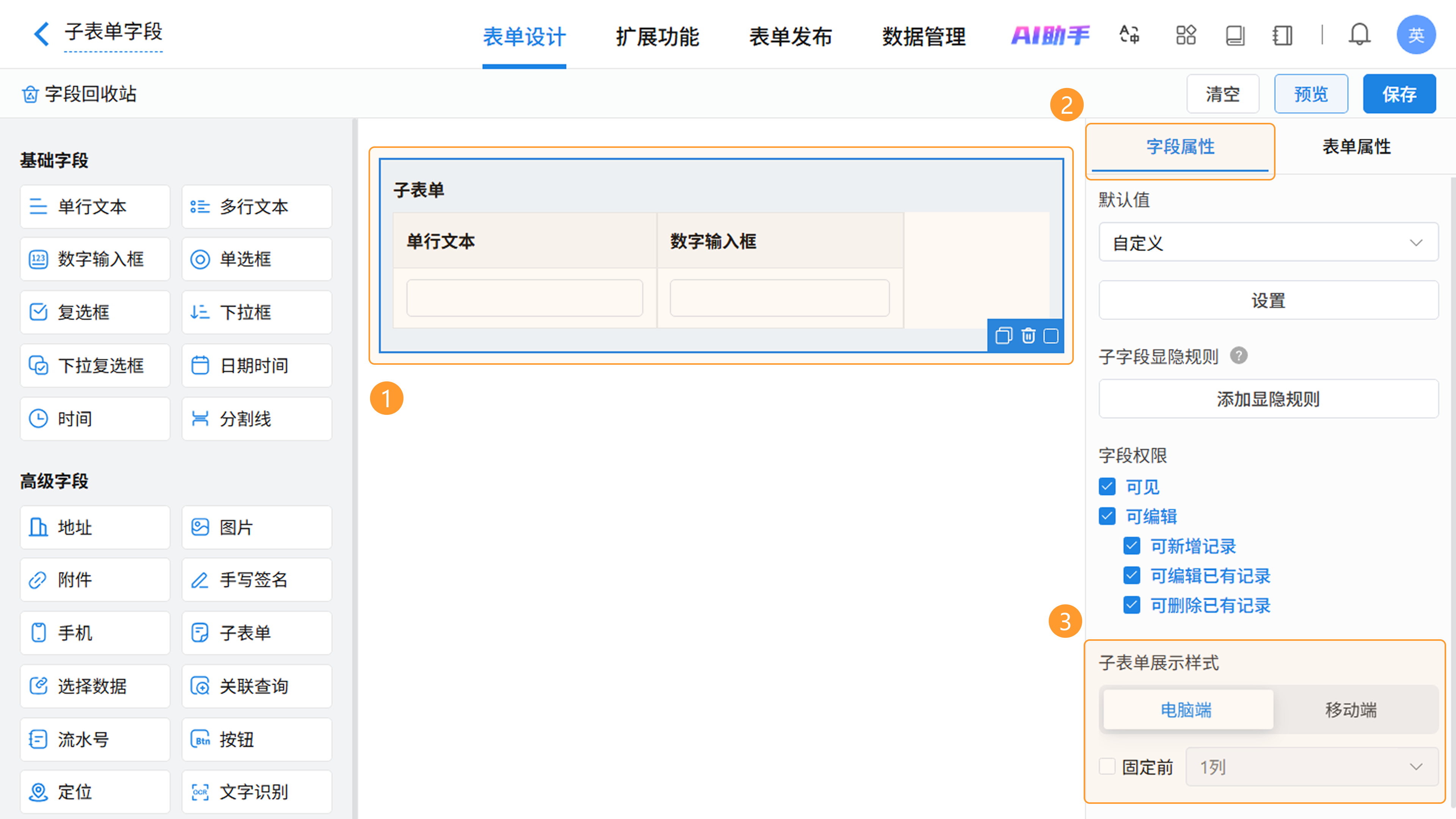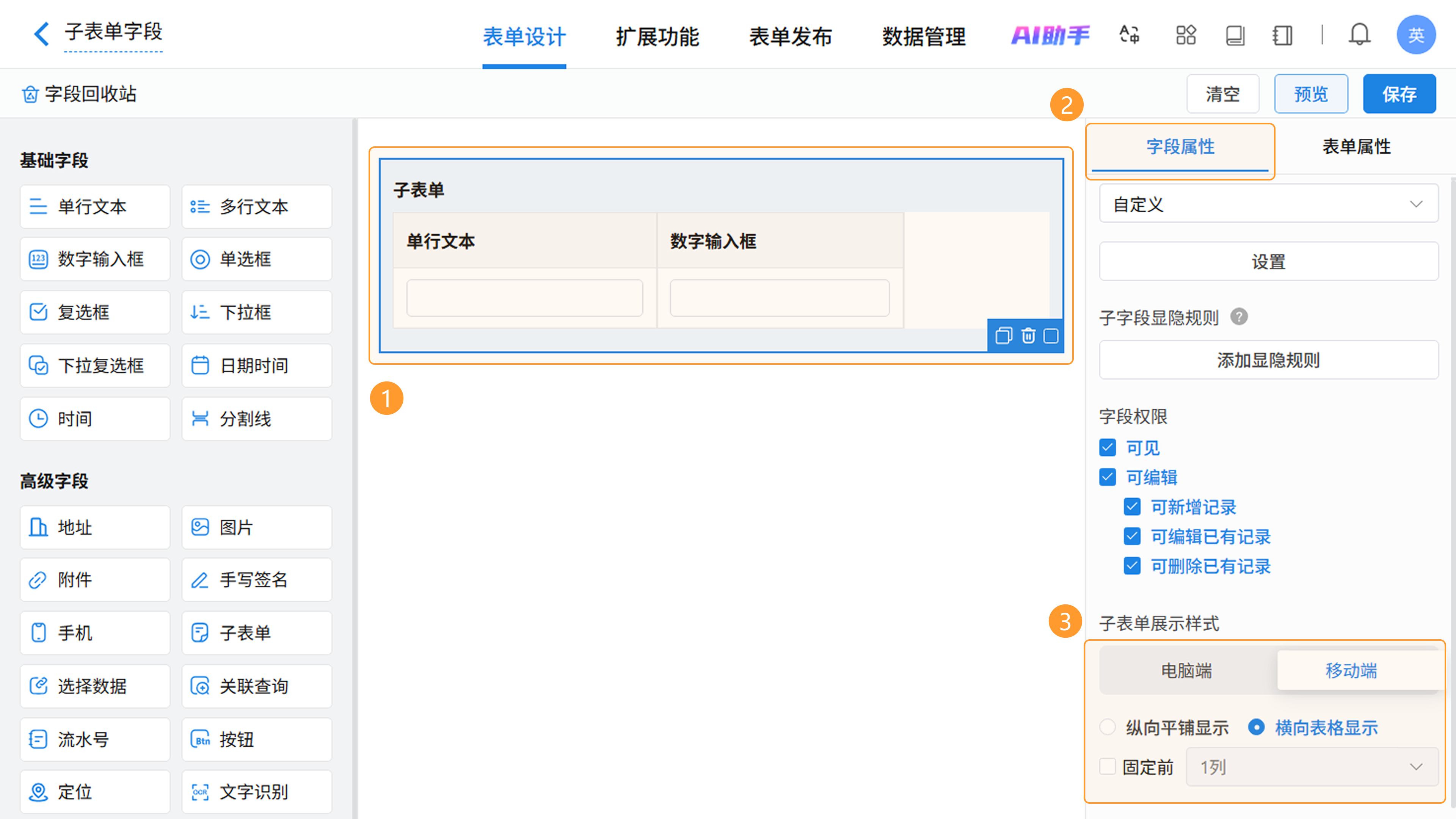 支持通过「子表单展示样式」属性,分别优化电脑端与移动端的视觉体验。