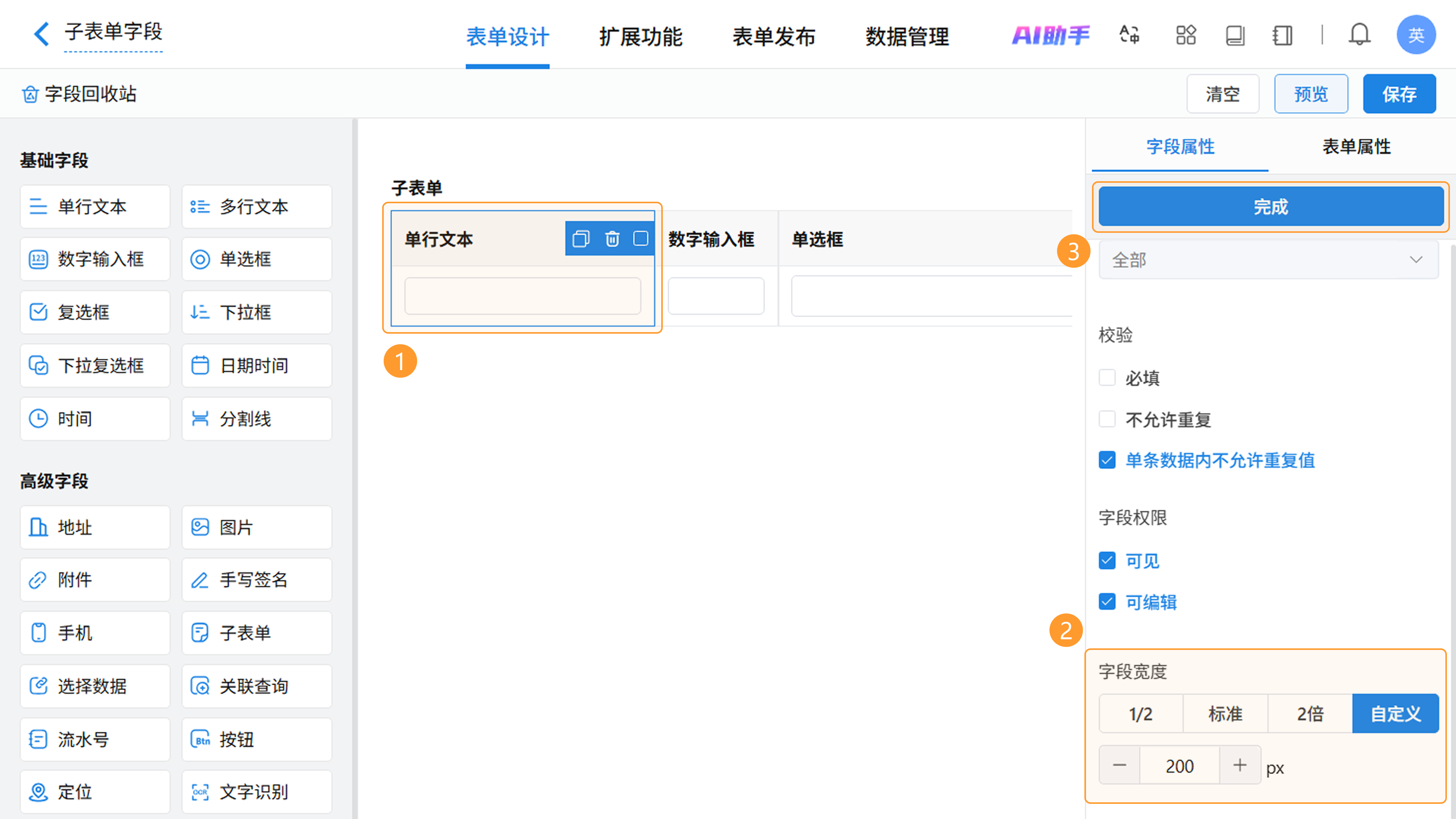 子字段宽度支持 1/2、标准、2倍、自定义 四种模式,默认宽度为标准(200px),可根据内容长度(如备注类设为2倍,数字设为1/2)灵活调整布局。