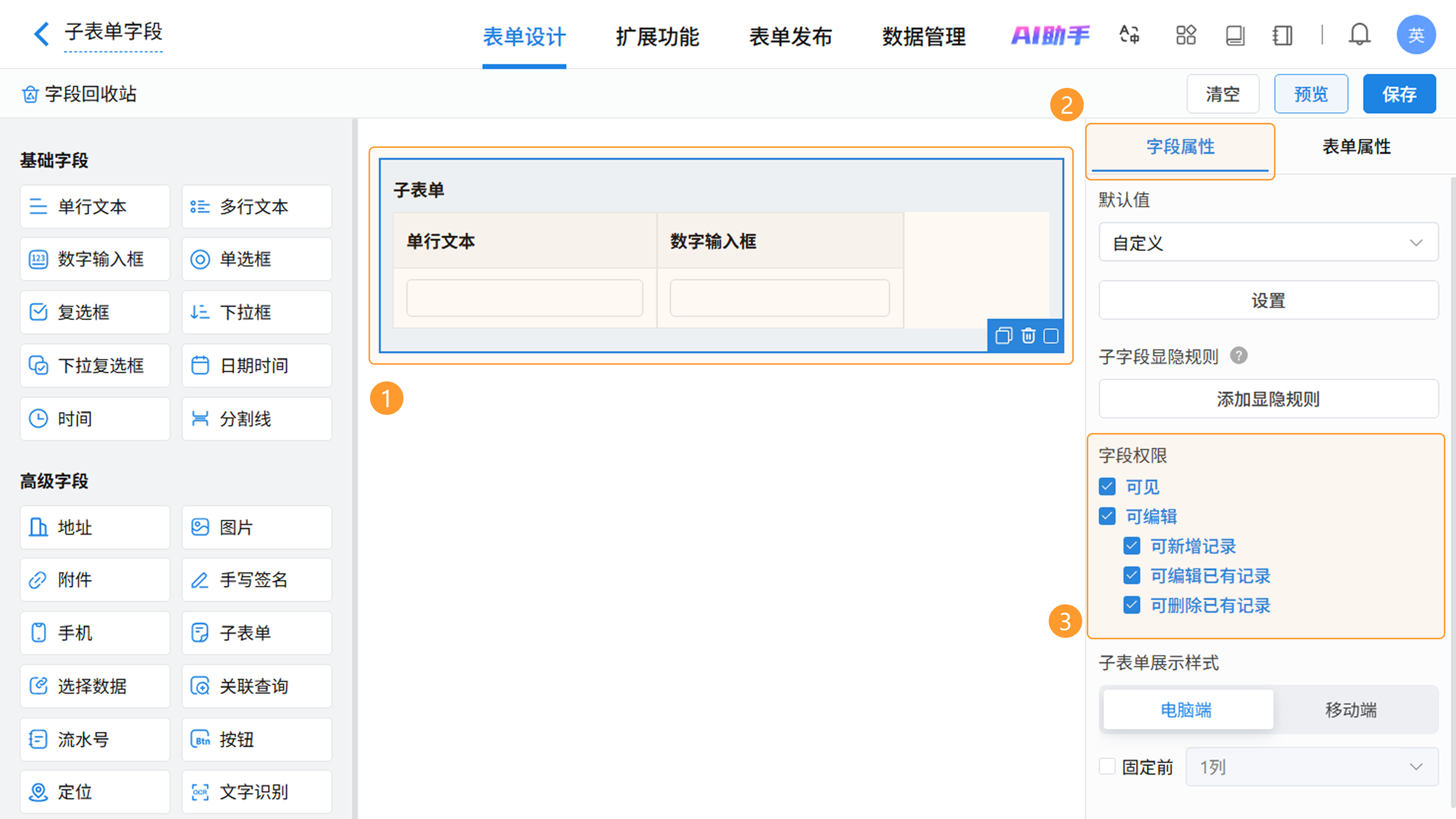 字段权限决定了填报时该字段的可见与可编辑性。子表单特有的可编辑权限包括: