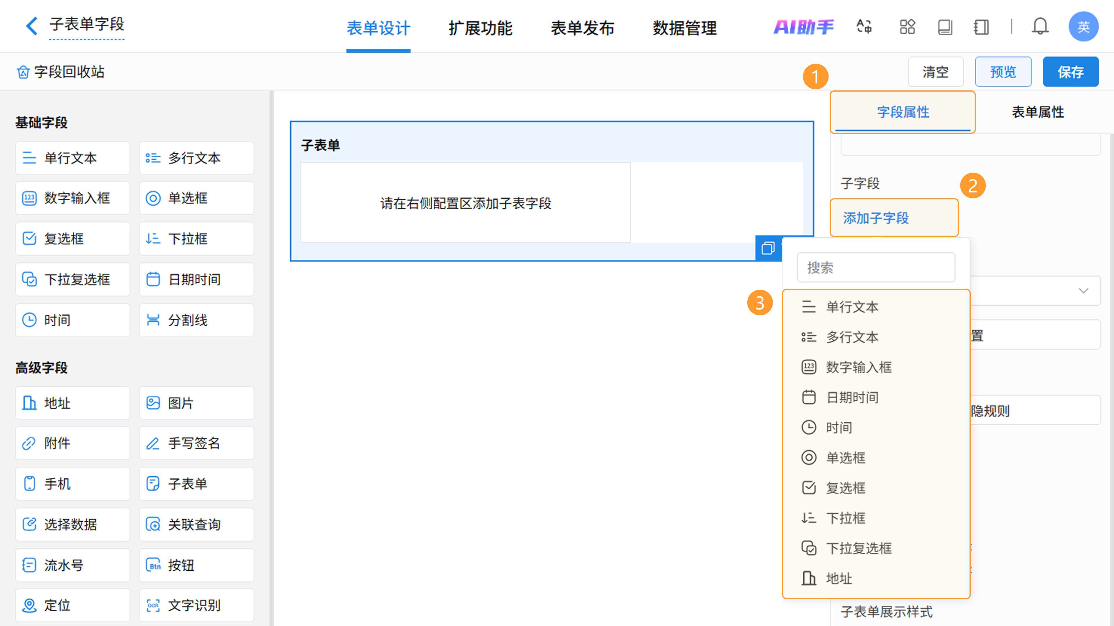 - 属性区添加:选中子表单,在右侧属性区点击「添加子字段」,从下拉菜单中选择目标类型。