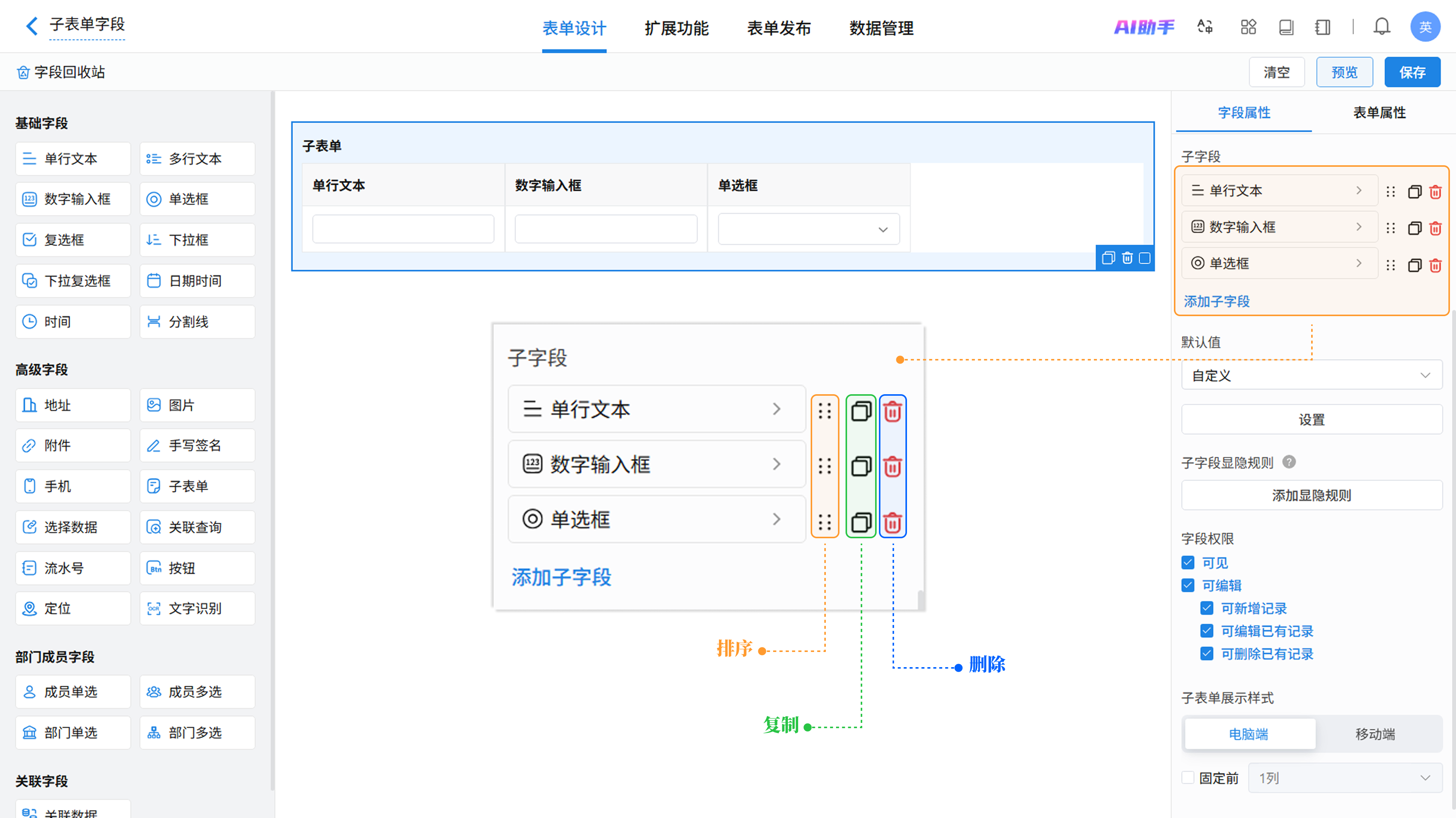 - 复制规则:复制子表单字段时,将会同步复制子表单内所有子字段的属性配置。