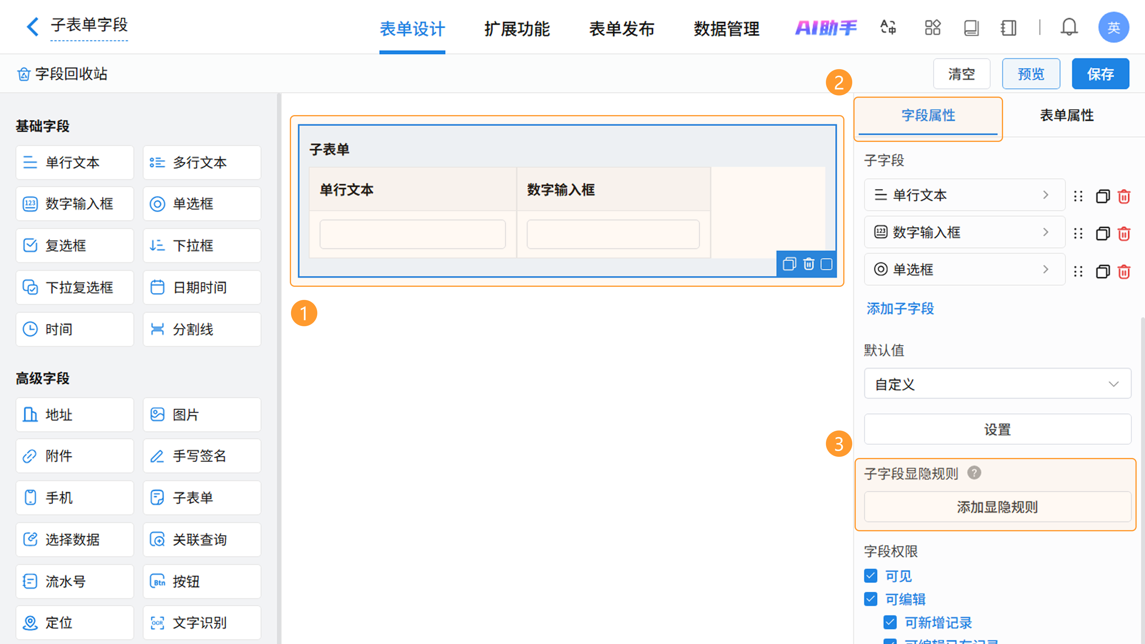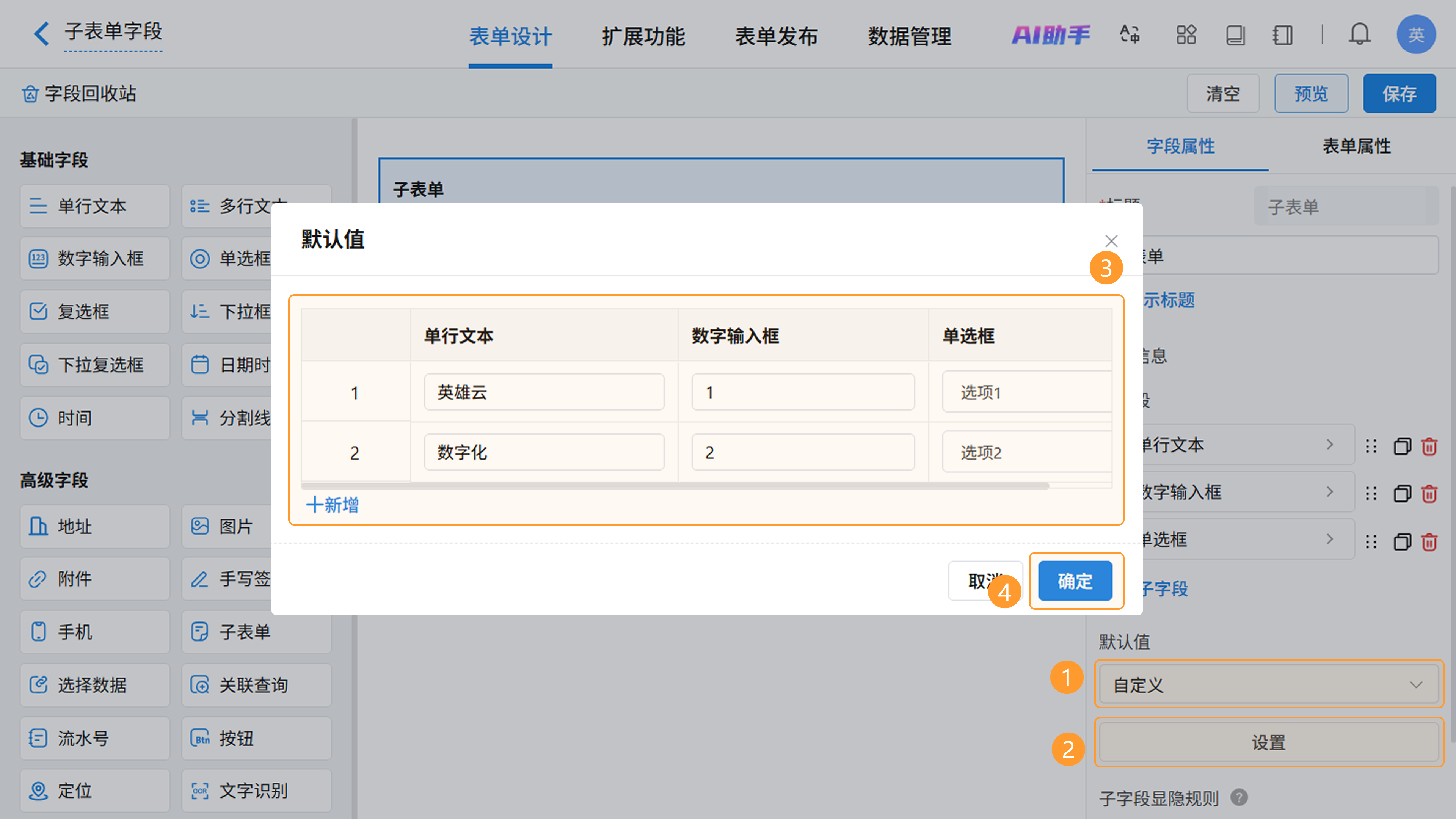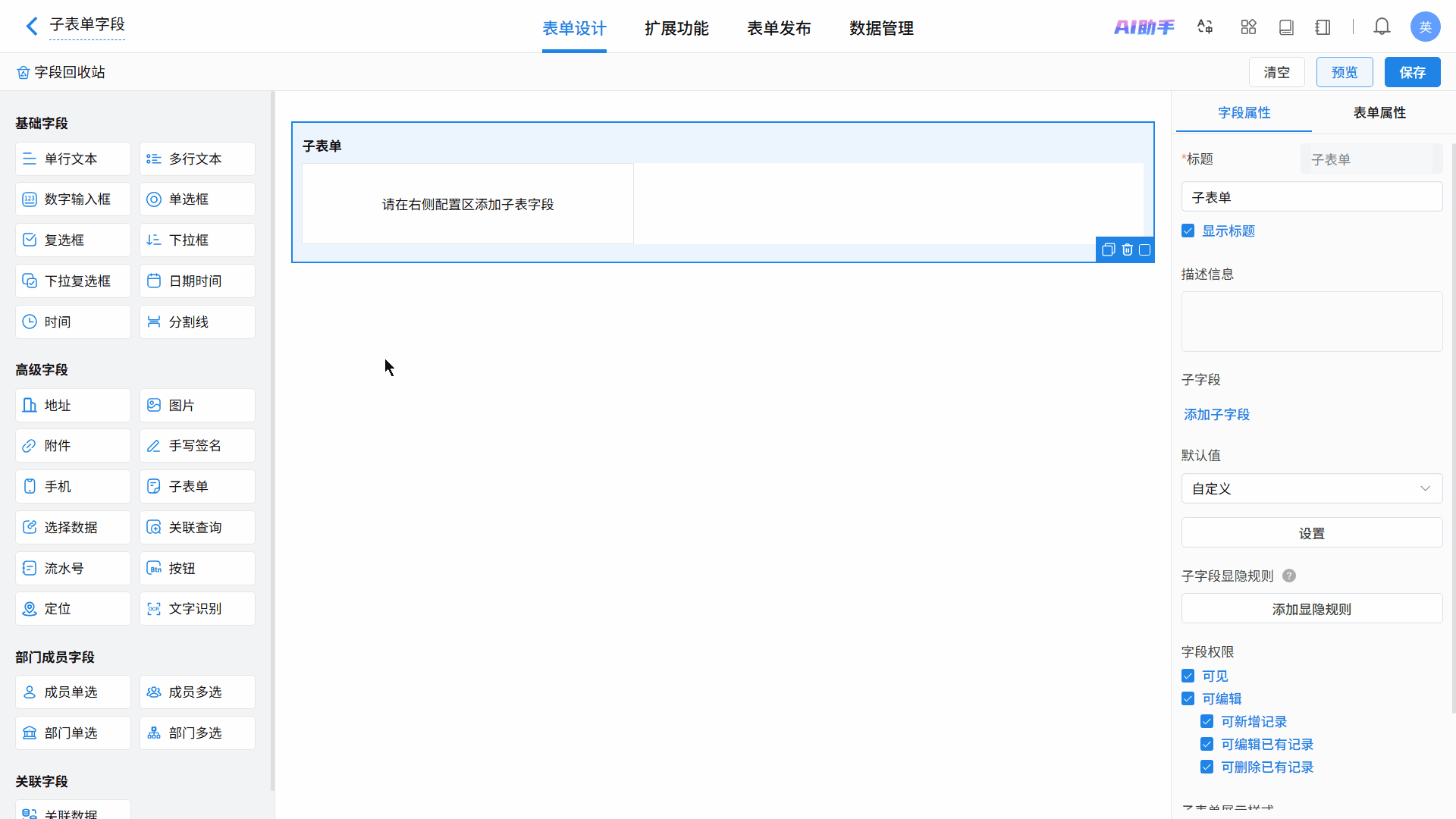 本文主要介绍子表单字段的特有属性,通用属性设置可查看:字段属性。