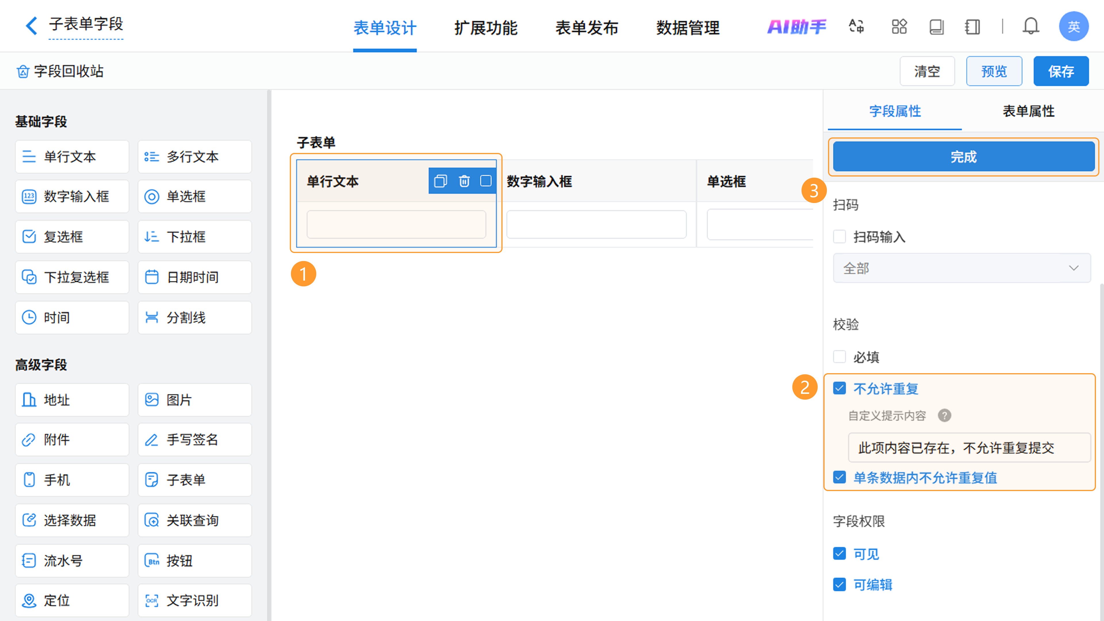 - 字段支持范围:目前仅以下子字段支持设置「单条数据内不允许重复值」:单行文本、下拉框、选择数据、成员单选、部门单选。