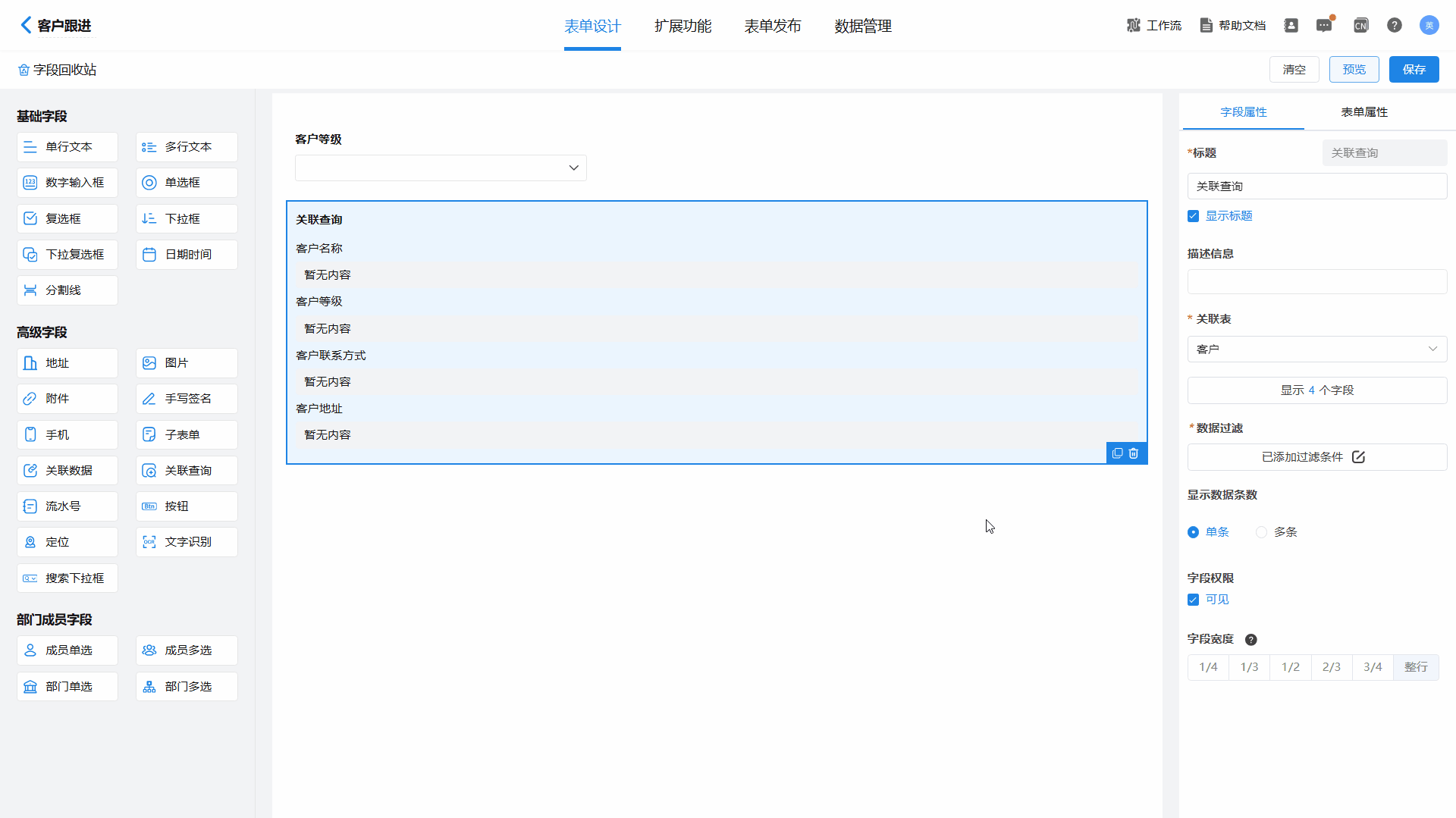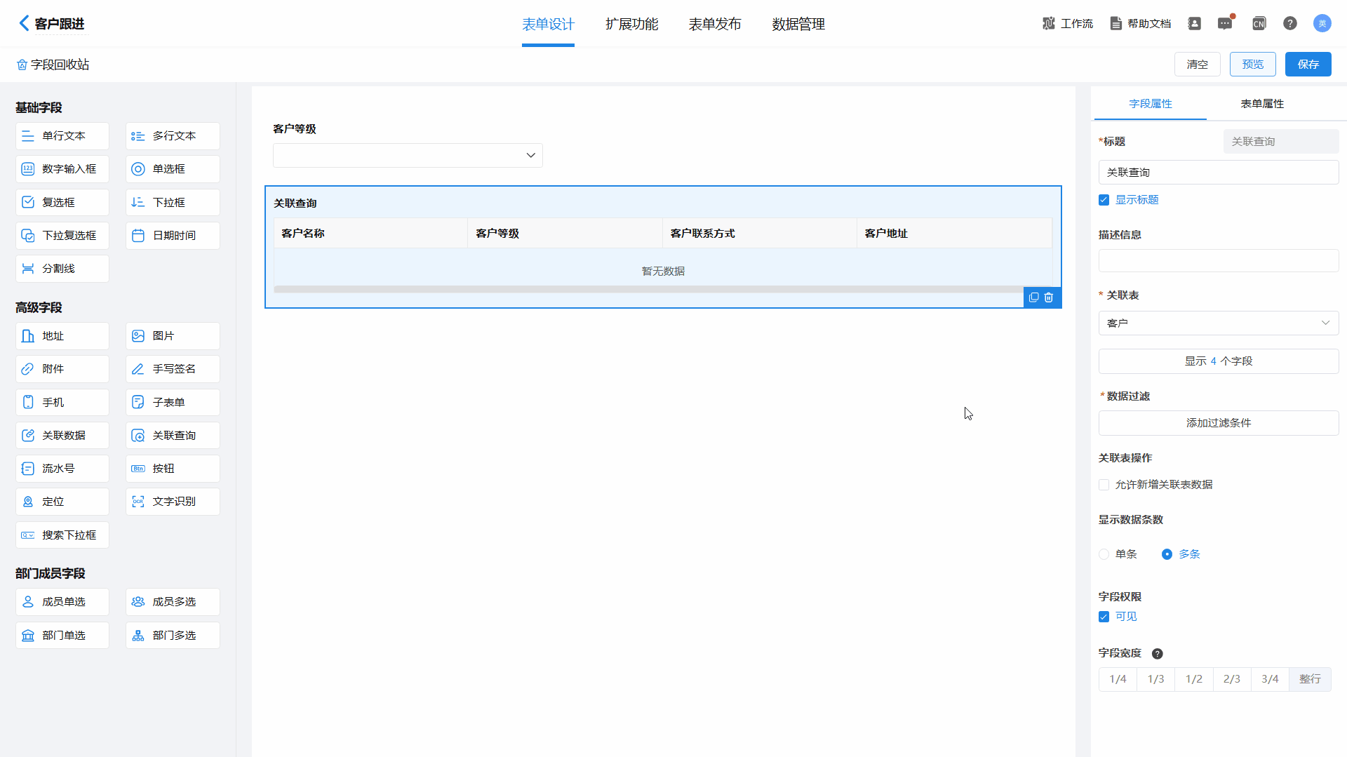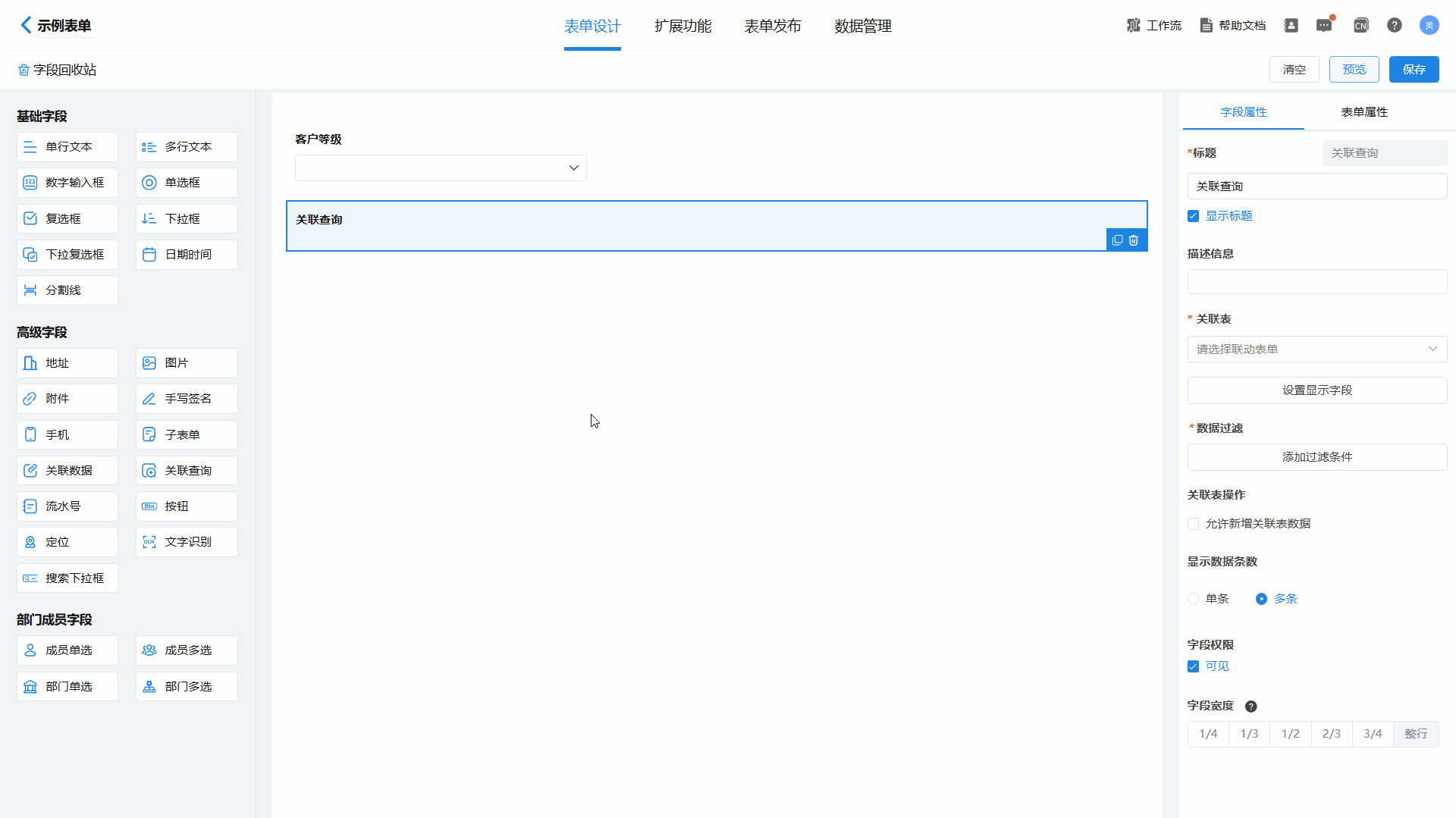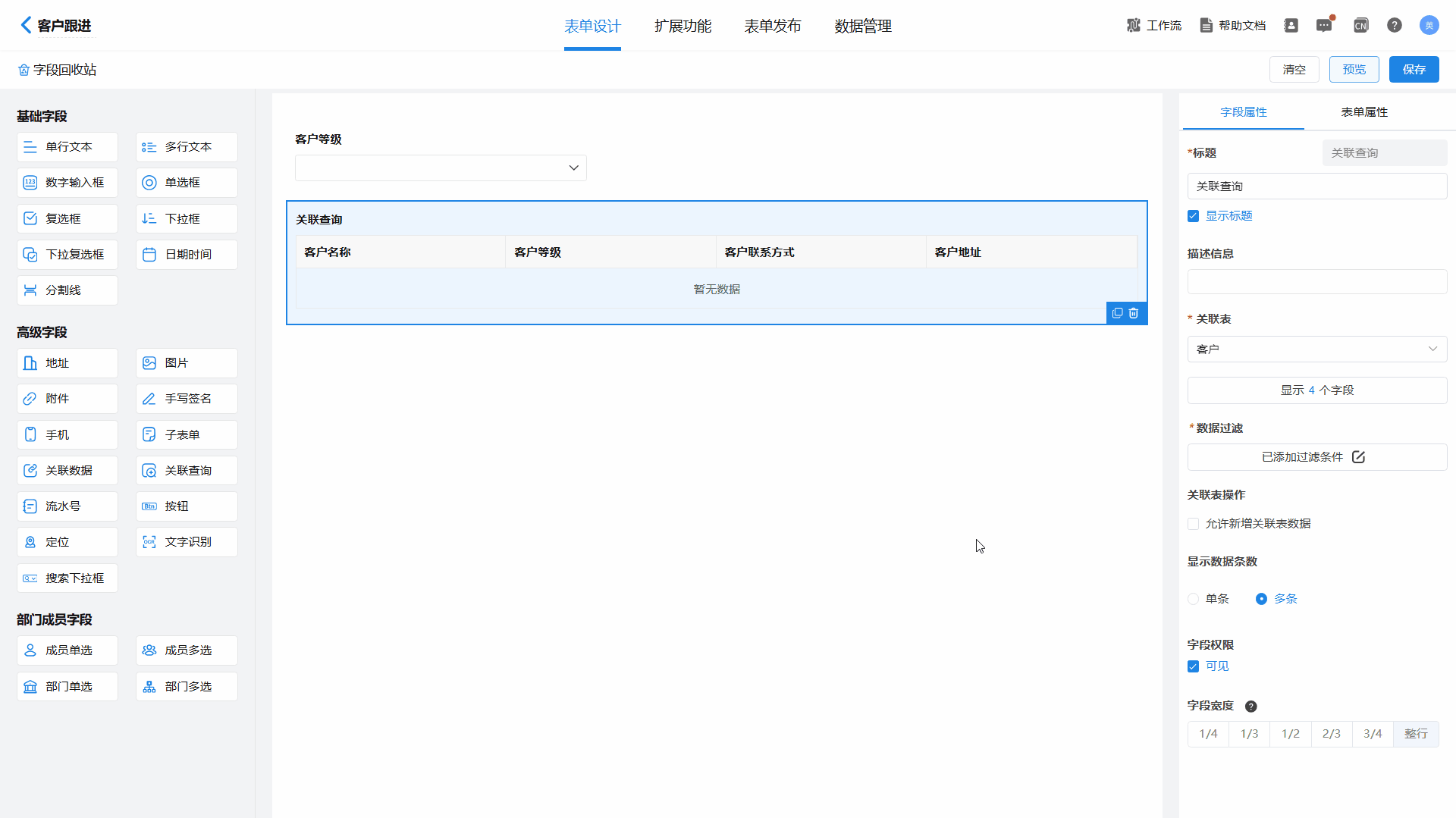 注意,关联表字段类型需要和当前表单字段类型相同,否则无法过滤;设置完成好需要点击保存才能预览实际效果。