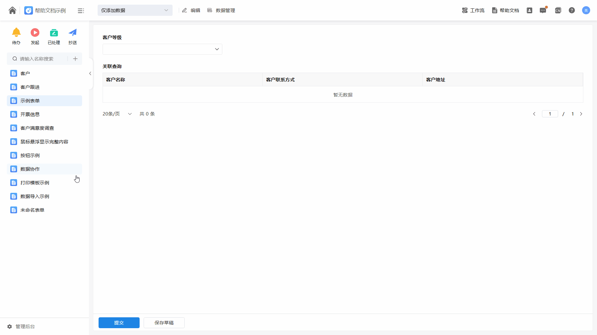 关联查询用于从当前表单通过关联关系查询到其他表单的数据,并将数据显示在当前表单上,只做展示不做入库处理。