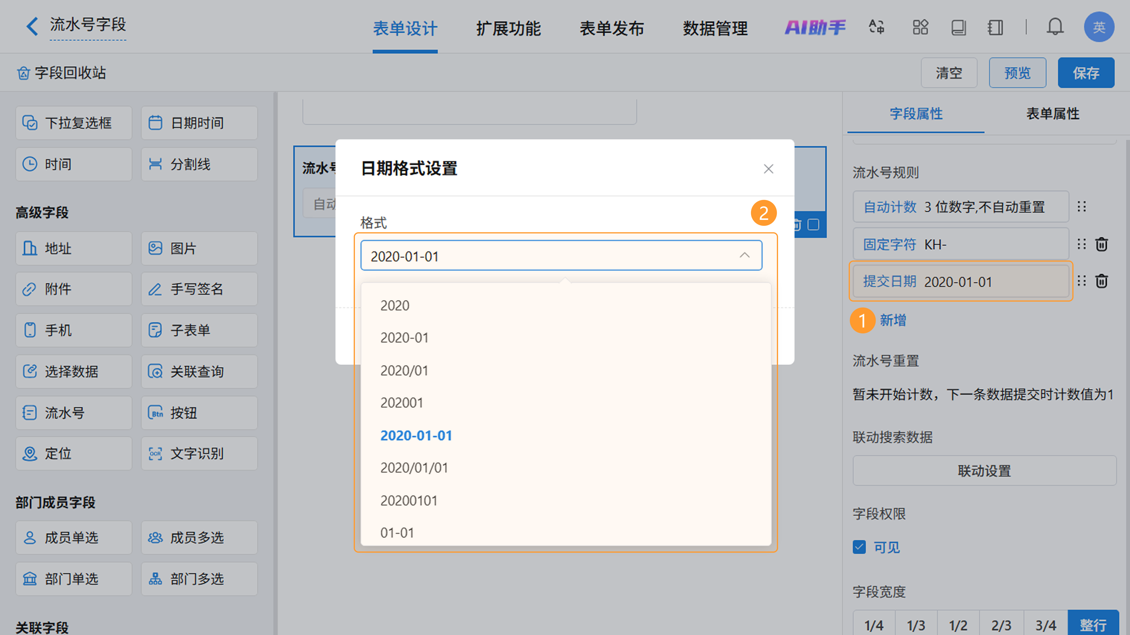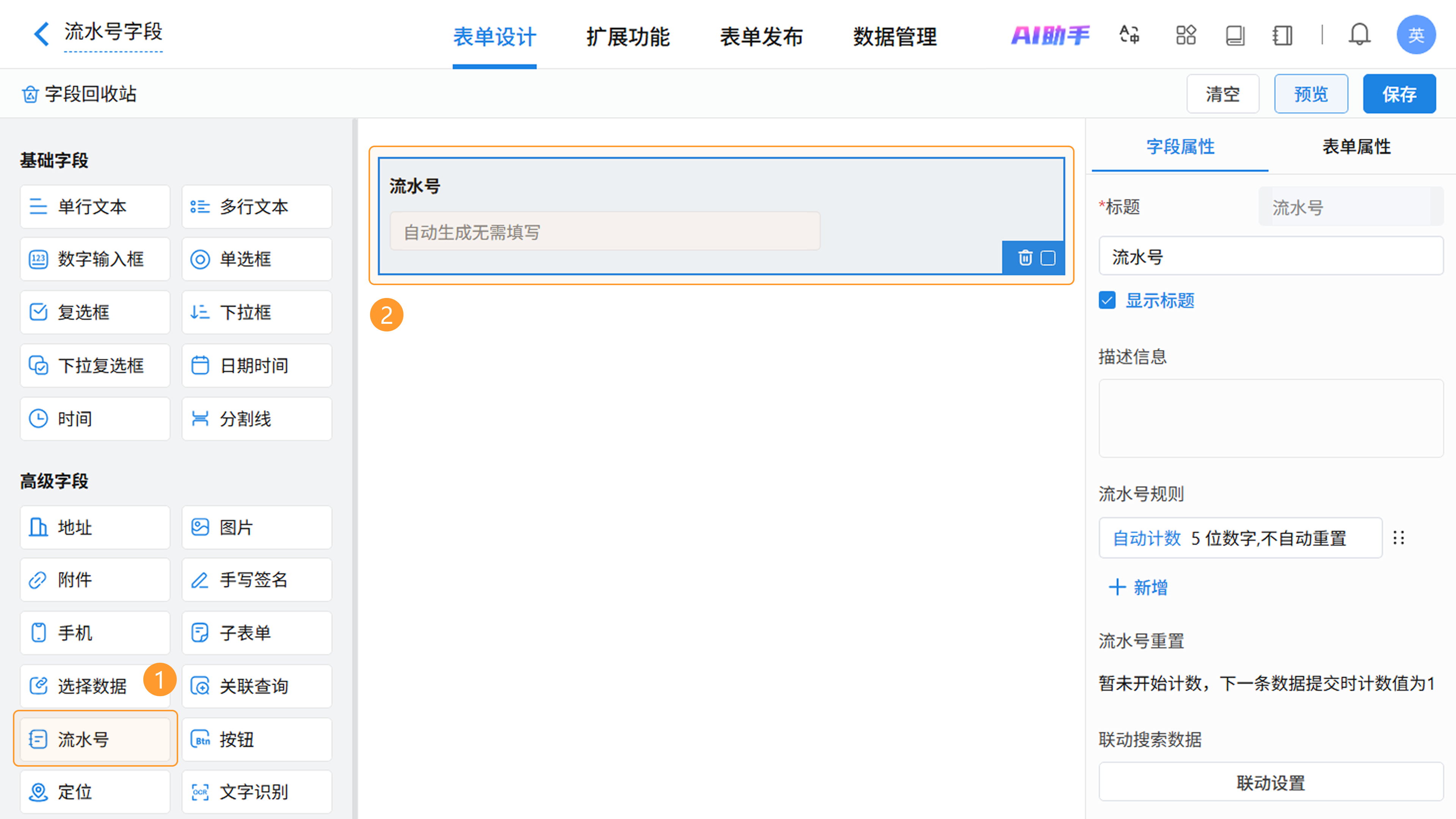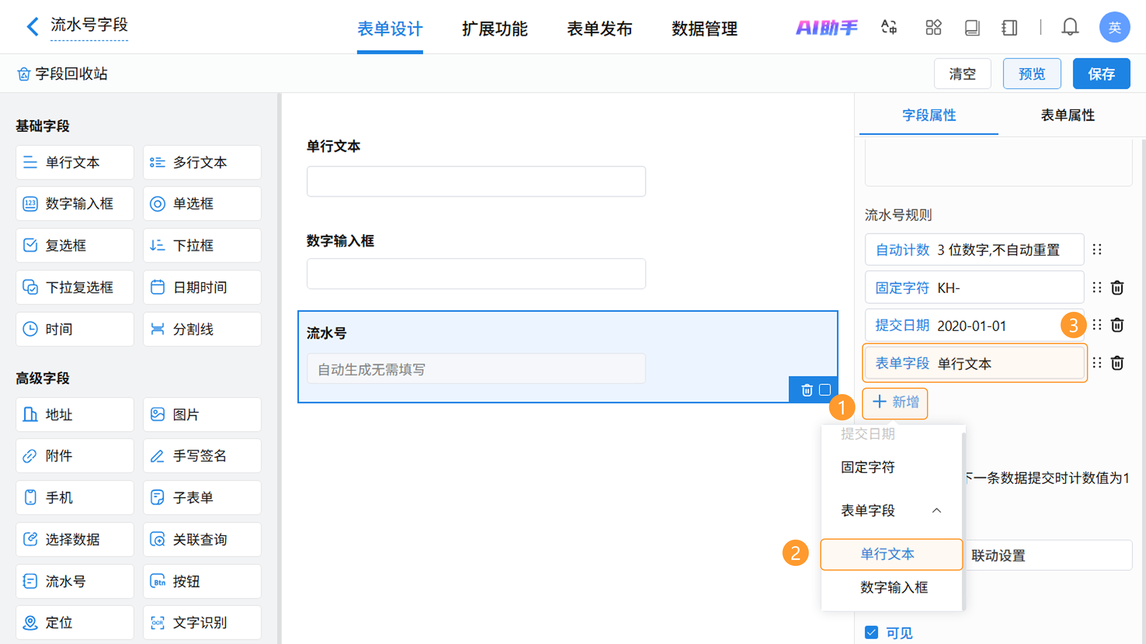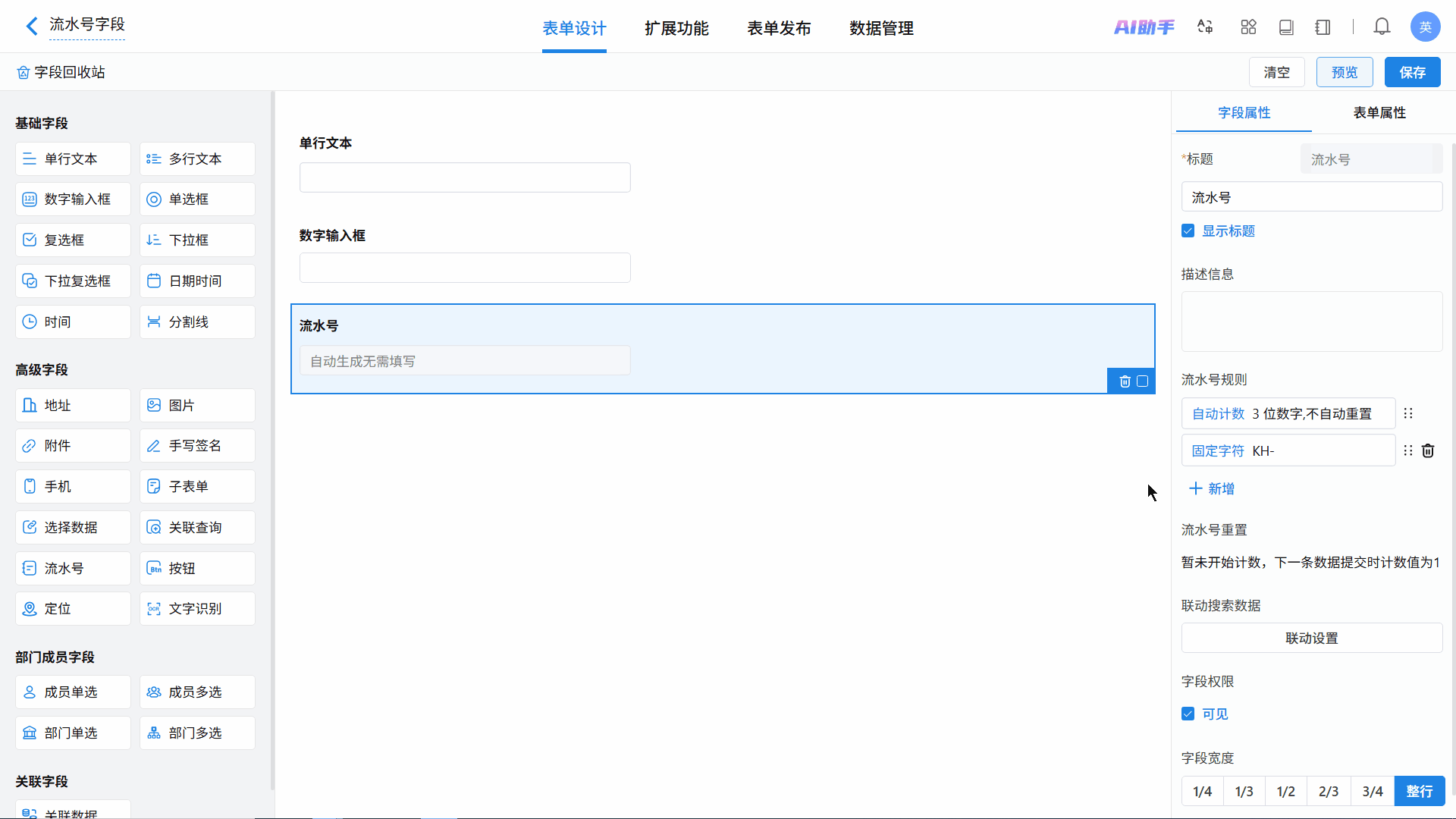 - 唯一性:一个表单仅支持添加一个流水号字段,用于生成全局唯一的业务编号