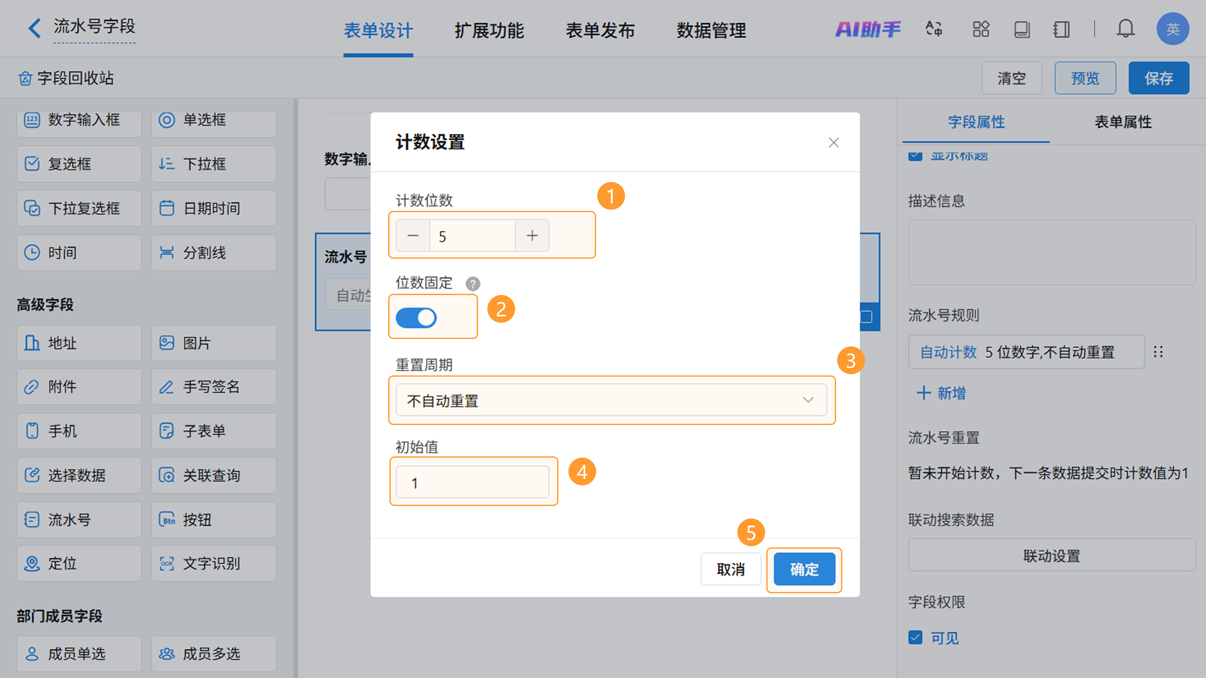 本文主要介绍流水号字段的特有属性,通用属性设置可查看:字段属性。