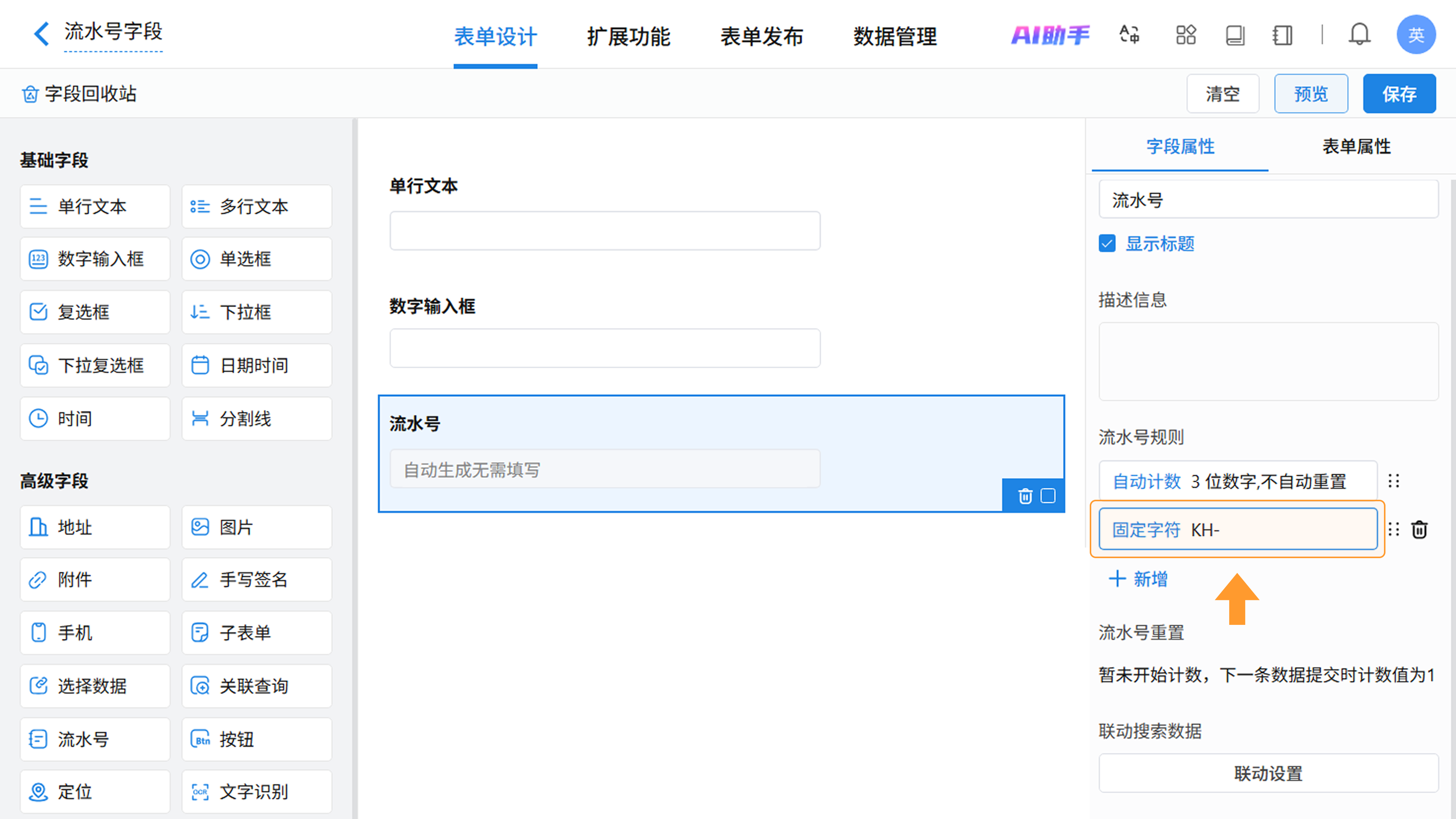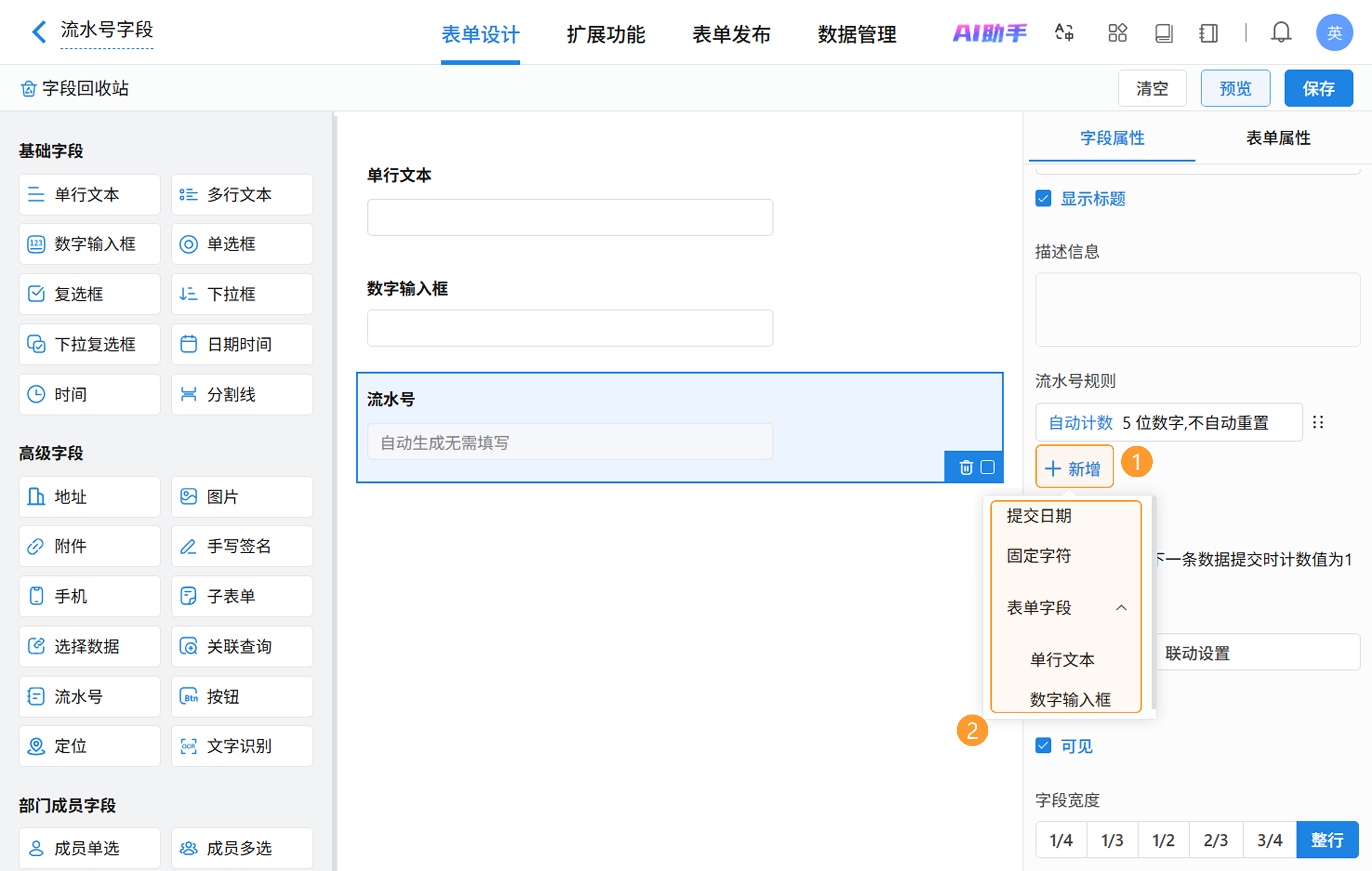 在表单设计页面,从左侧字段区拖拽或点击即可添加流水号字段,在右侧属性区进行配置。