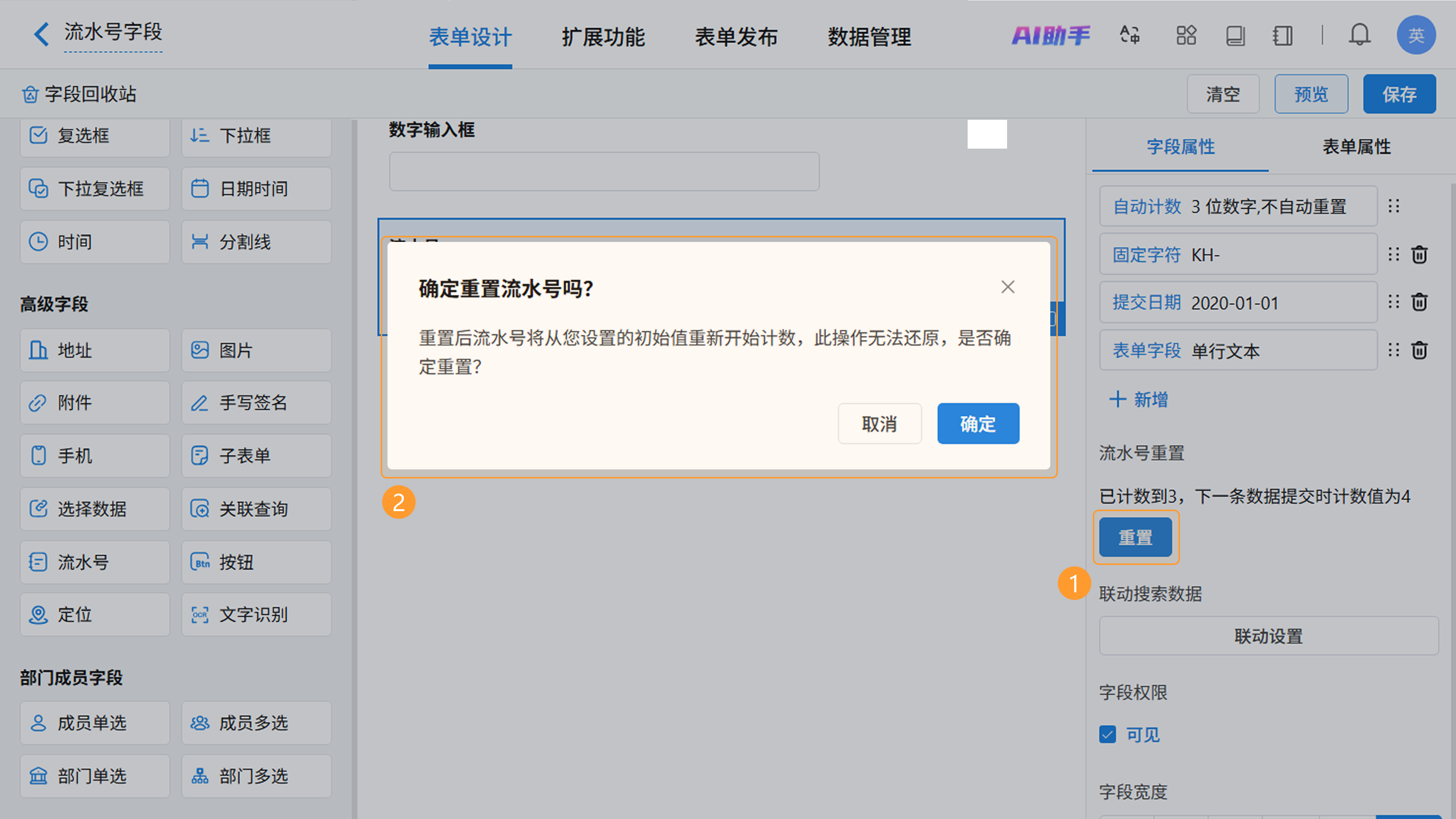 当表单中已经被录入数据时,如果想要让自动计数规则重新计数,可点击属性区的「重置」按钮,让之后录入的流水号数据按照设定的「初始值」重新开始累加。