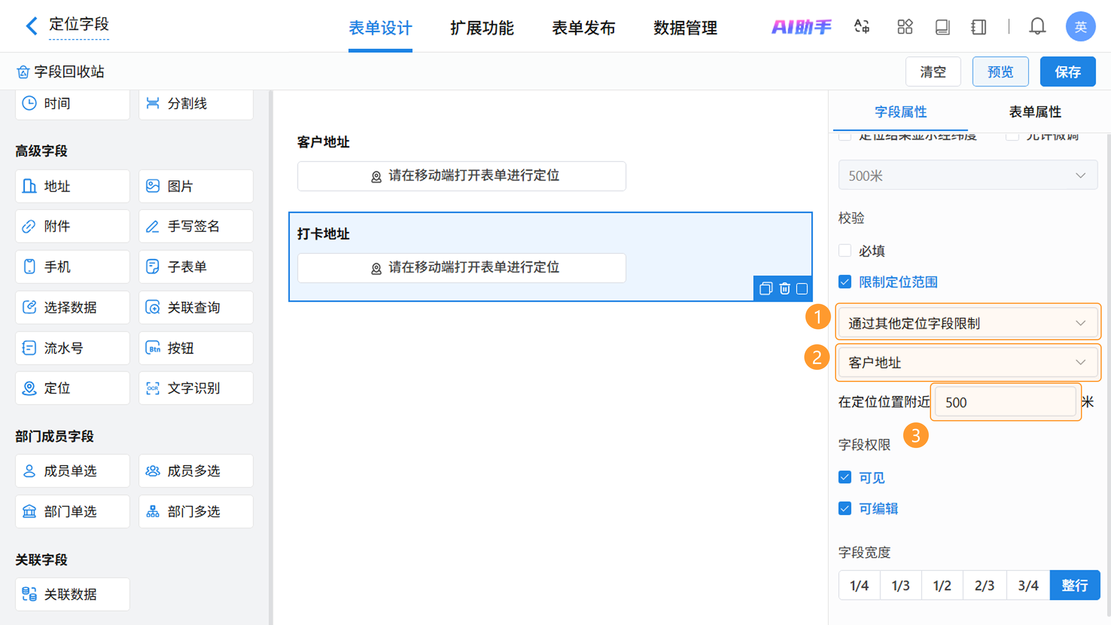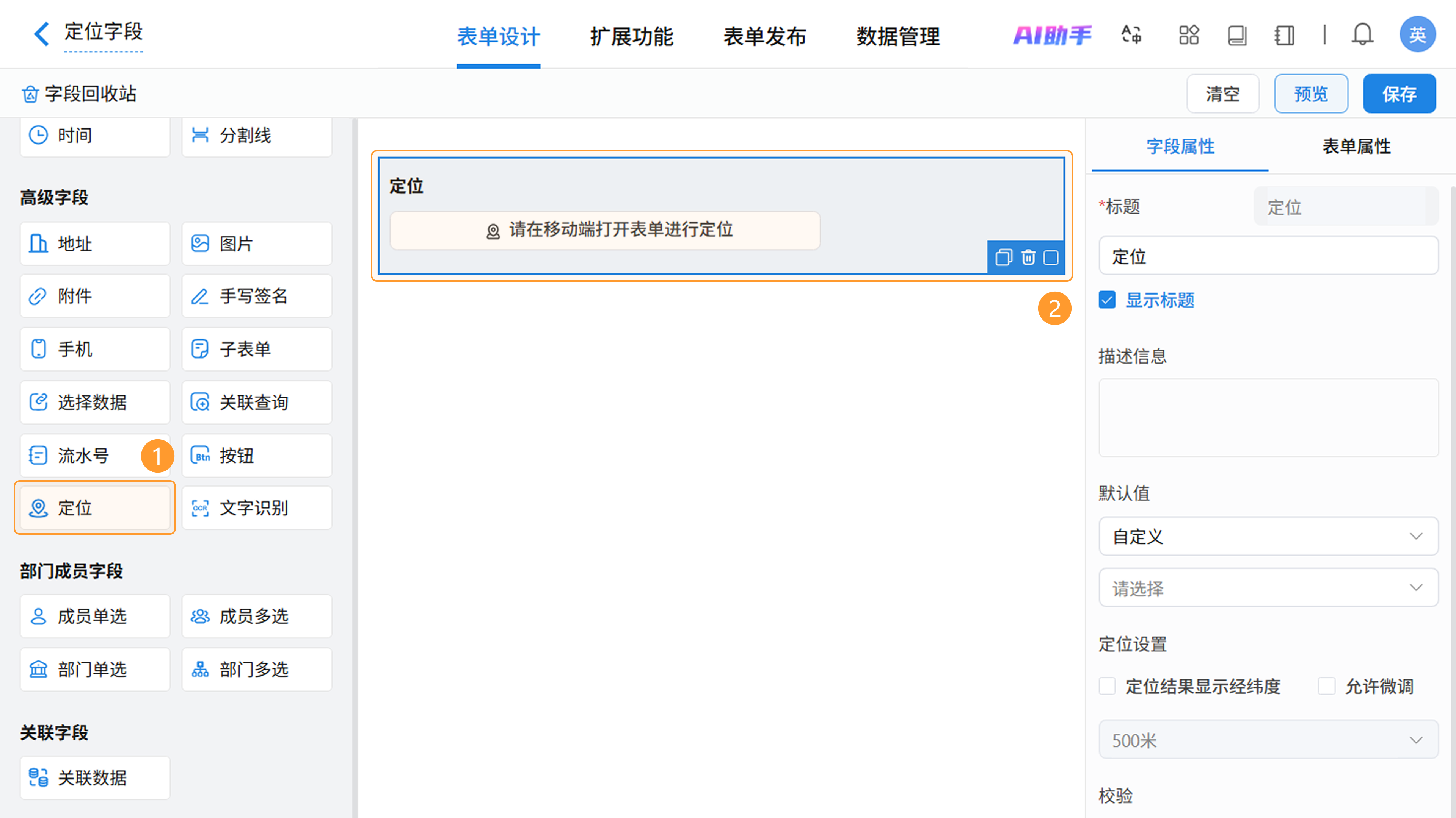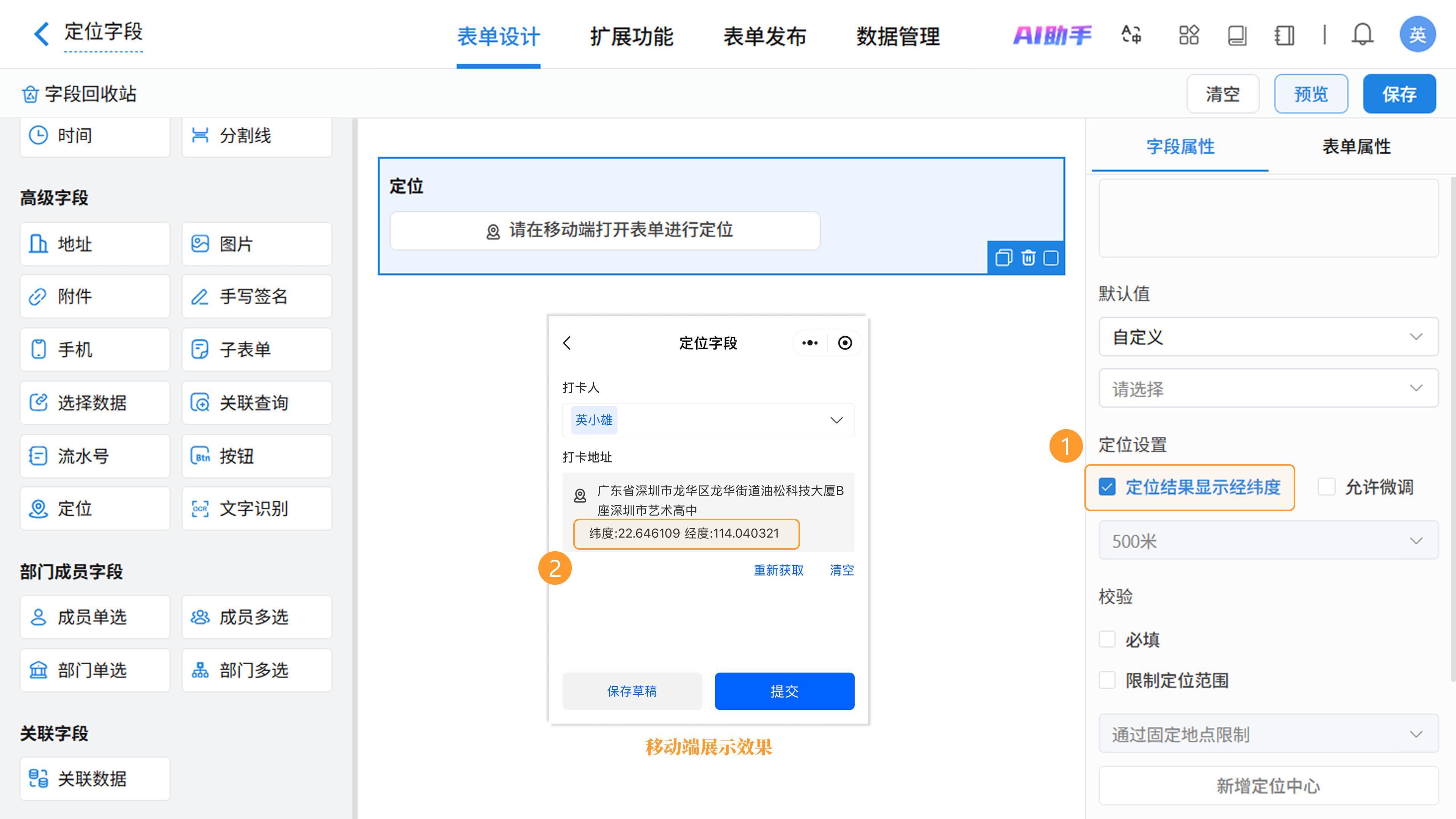 在表单设计页面,从左侧字段区拖拽或点击即可添加定位字段,在右侧属性区进行配置。