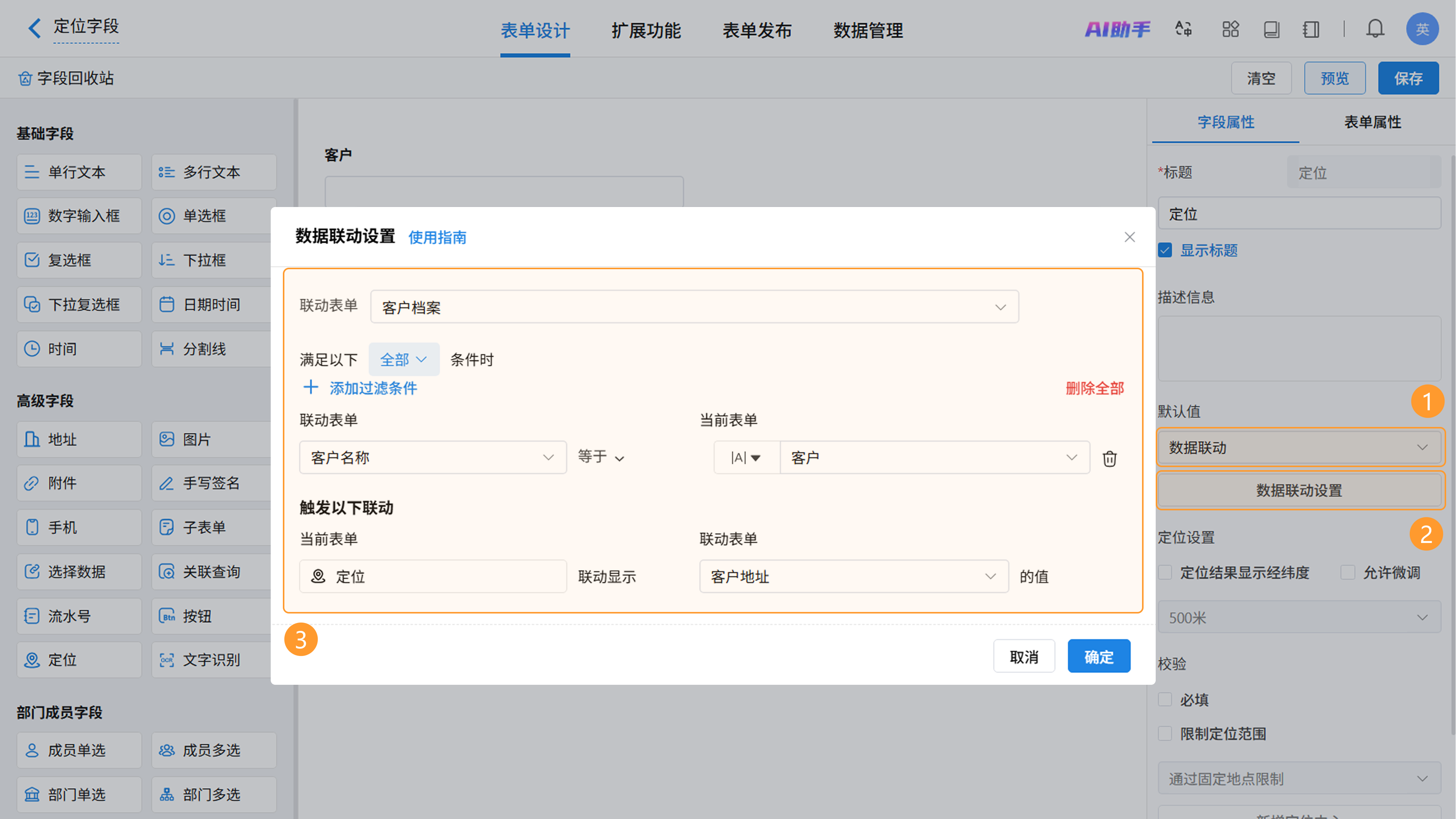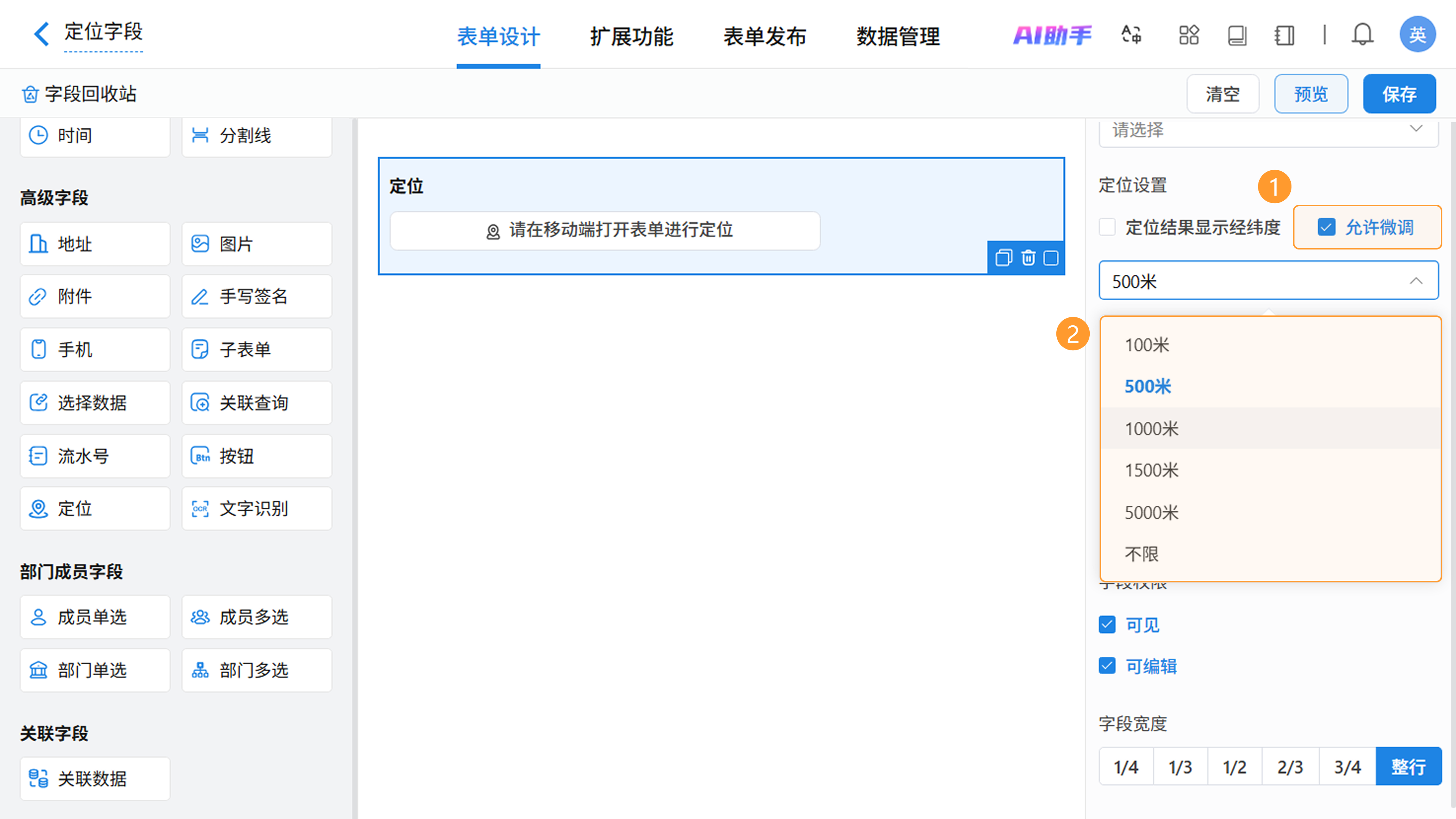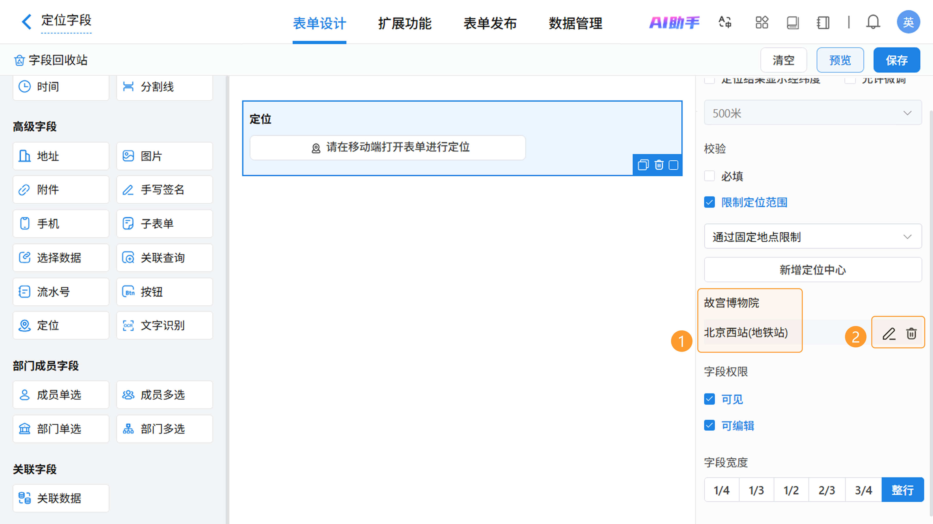 在表单设计页面,从左侧字段区拖拽或点击即可添加定位字段,在右侧属性区进行配置。