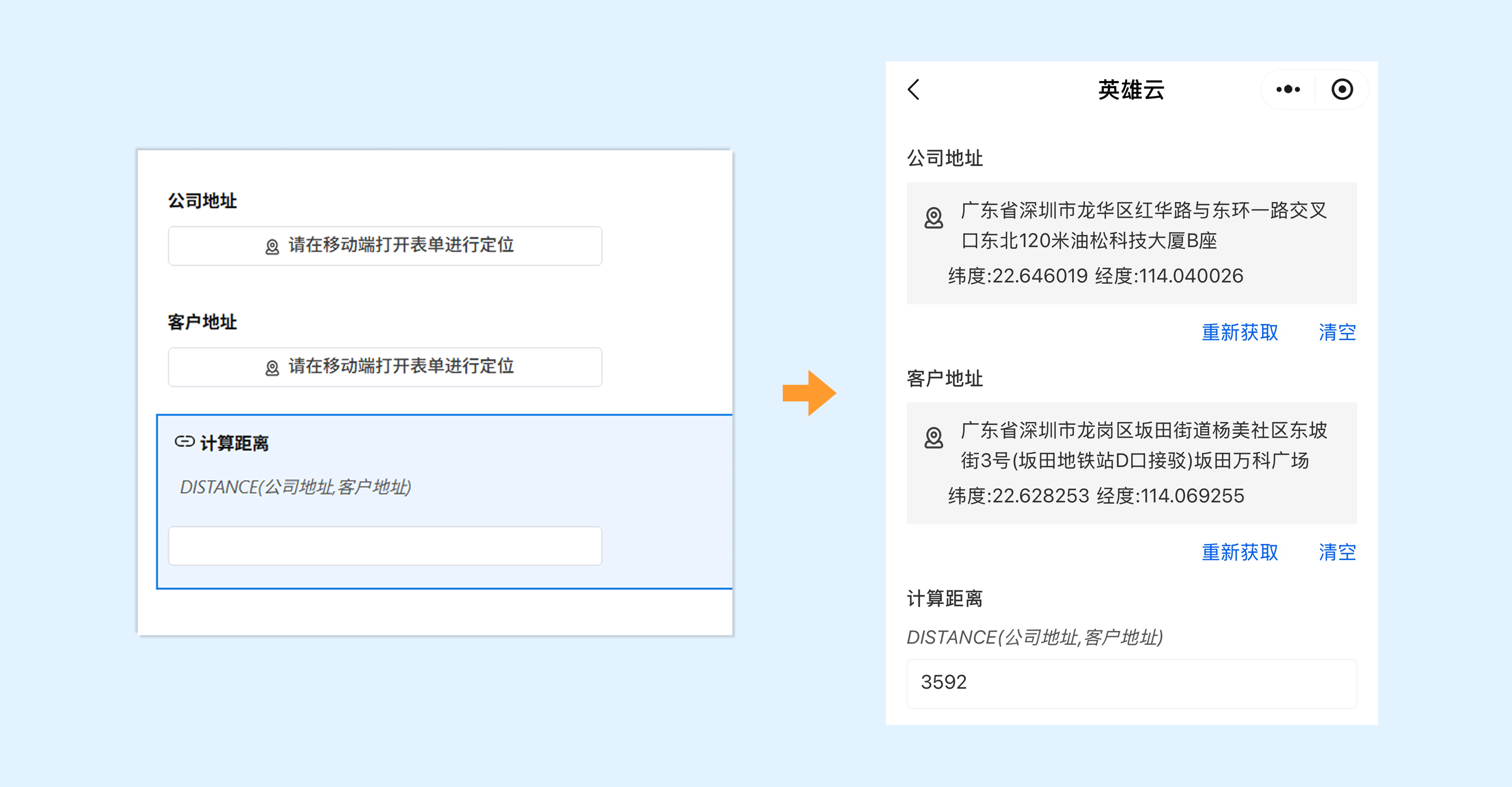 使用示例:DISTANCE(客户1地址, 客户2地址),计算两个客户之间的距离,优化拜访路径规划。