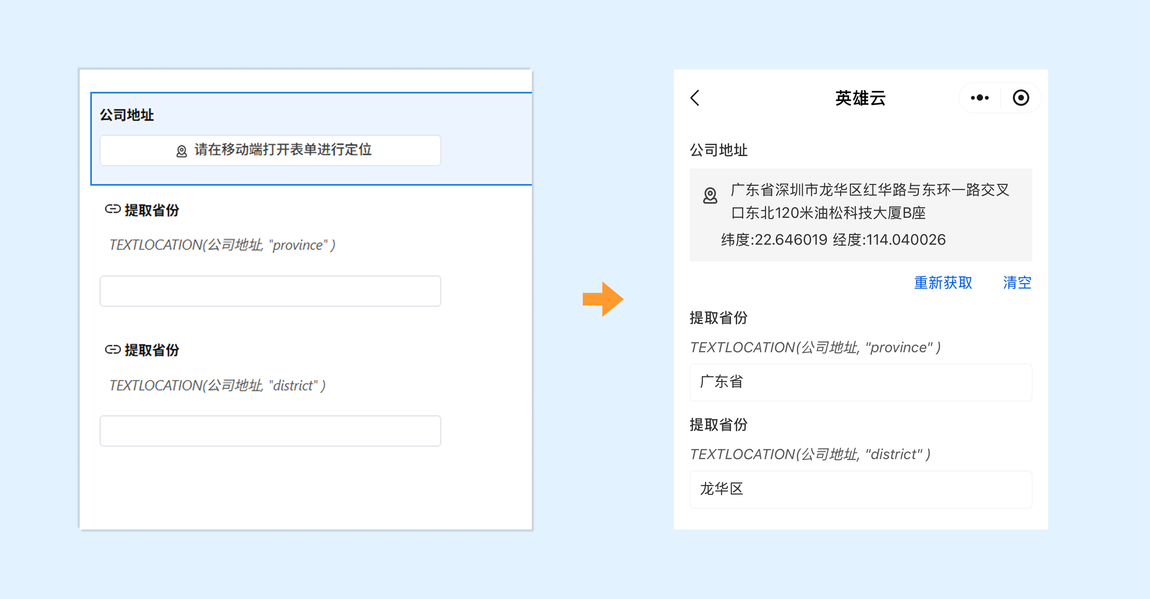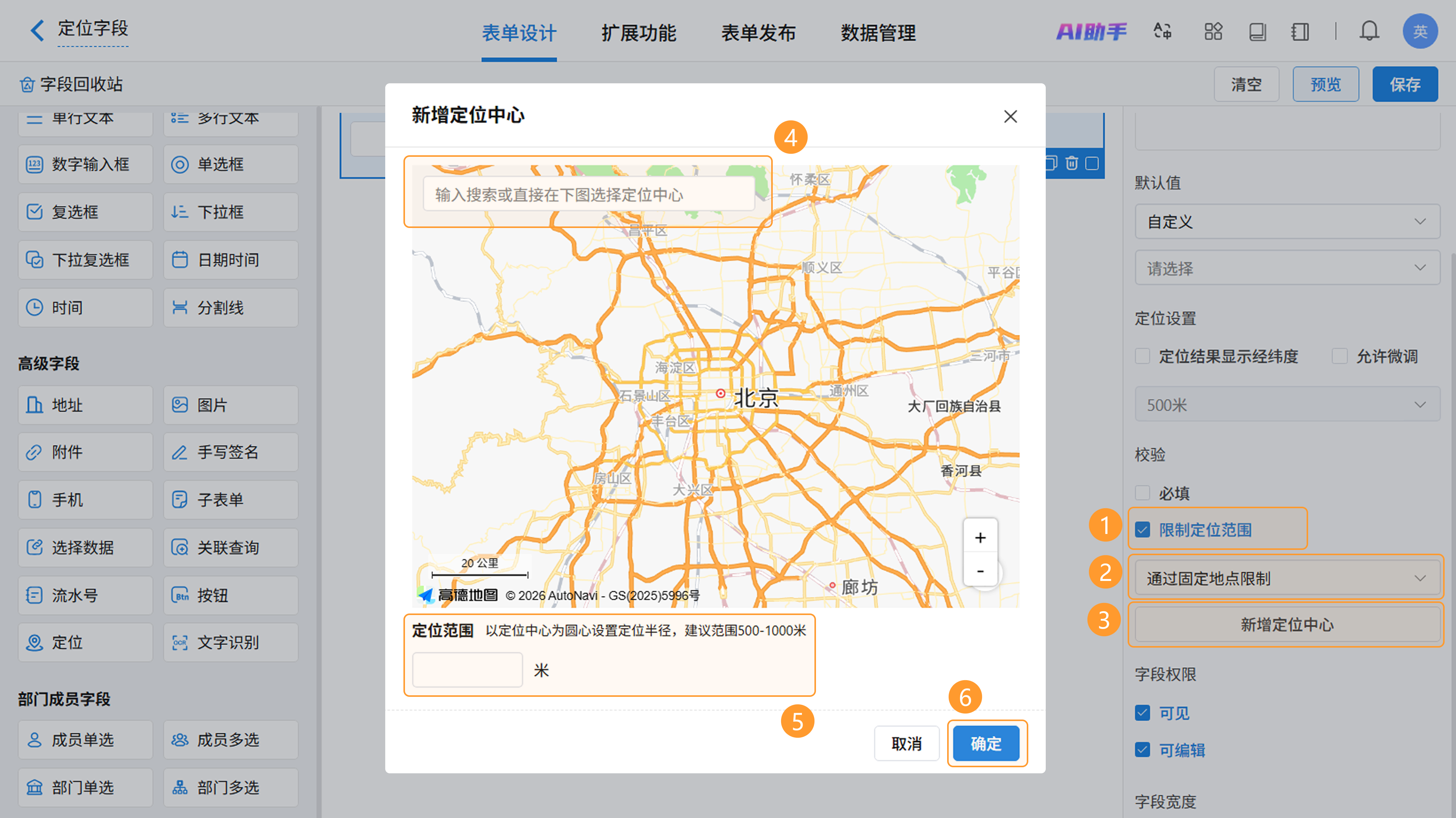 定位字段主要应用于移动端,用于实时获取并记录用户当前的地理位置。该字段还支持限制定位设备类型、限制定位范围和微调等功能。