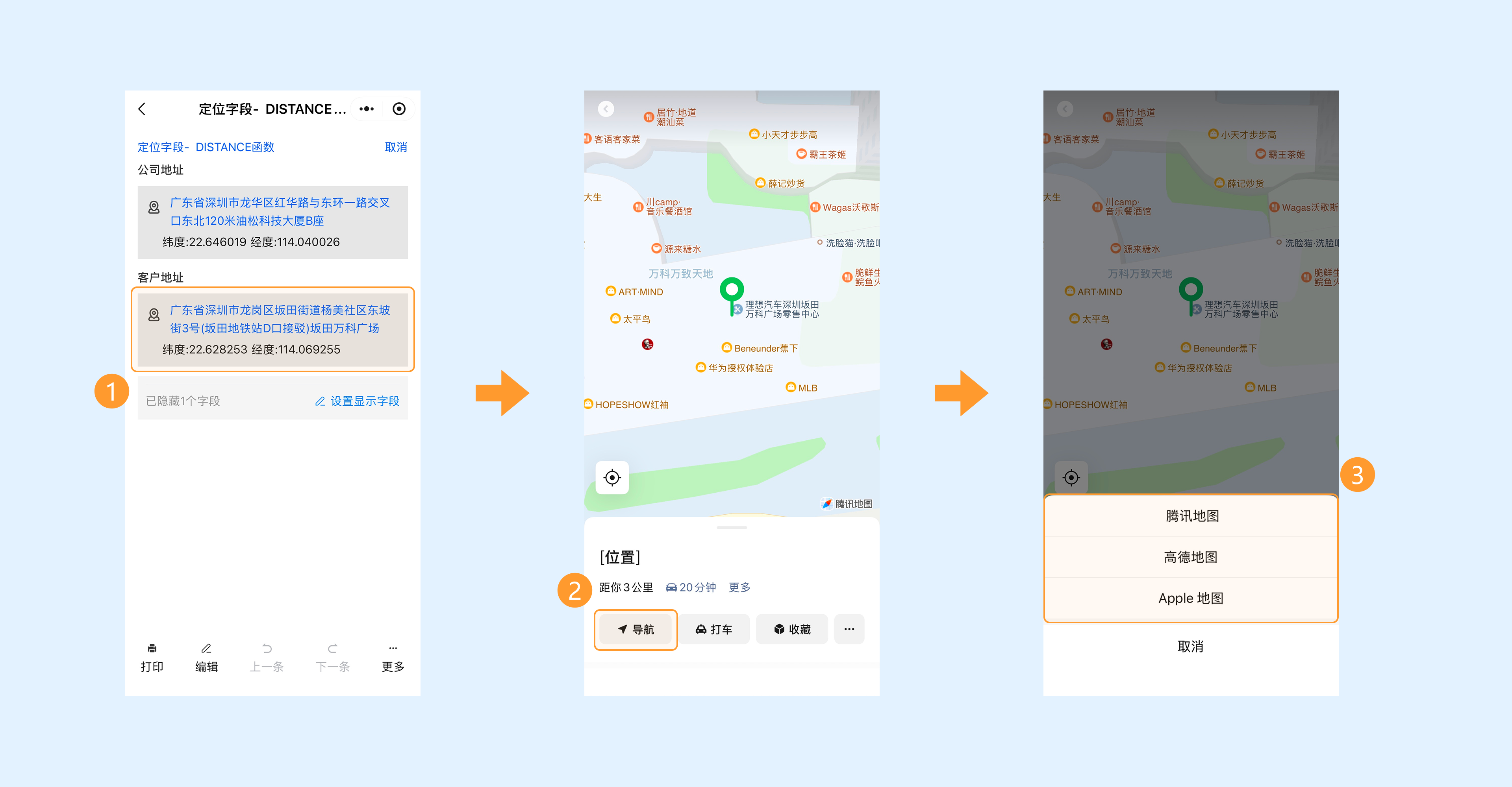 示例:在客户拜访场景下,外勤人员可直接点击客户位置发起导航,无需手动复制地址。