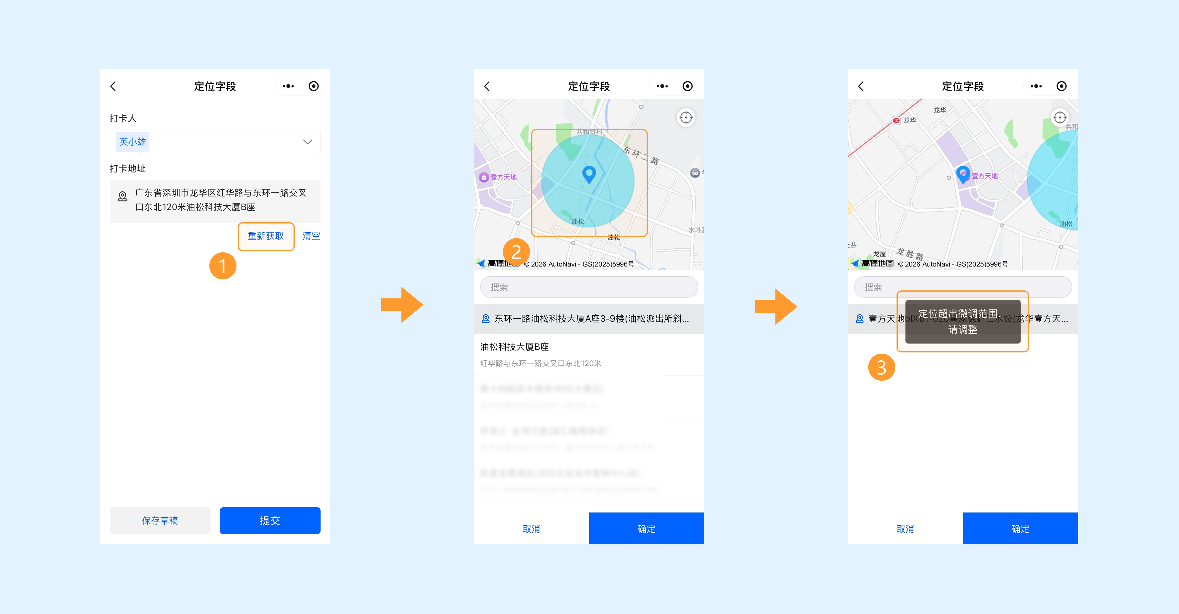 效果演示:填写时点击“重新获取”进入地图,可在规定范围内手动进行精确修正。若超出设定范围,系统将提示“定位超出微调范围,请调整”。