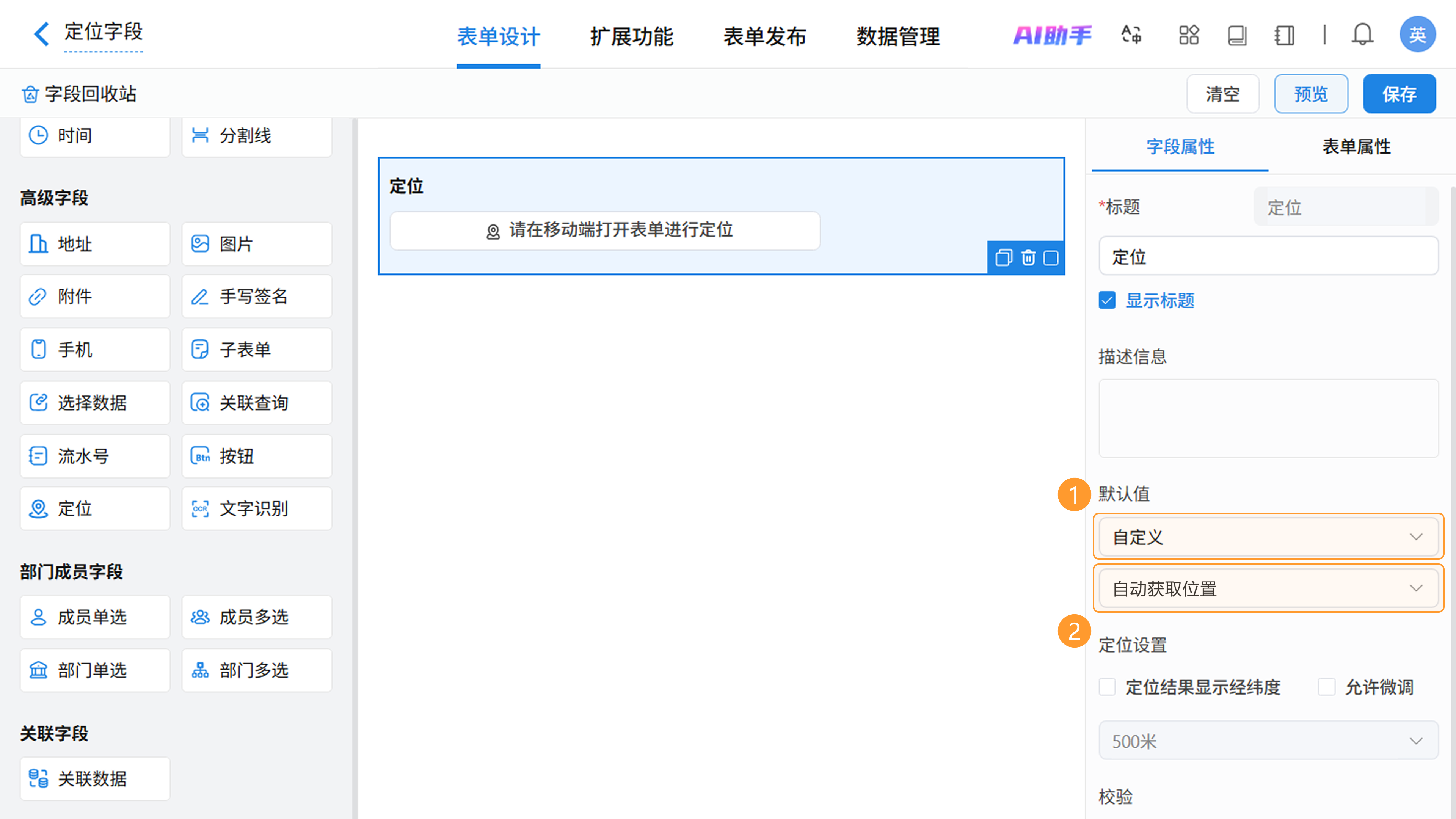 选中定位字段,设置默认值为「自定义 >> 自动获取位置」。当成员填写表单时,系统将自动获取该成员的当前位置信息,无需手动检索,提升填报效率。