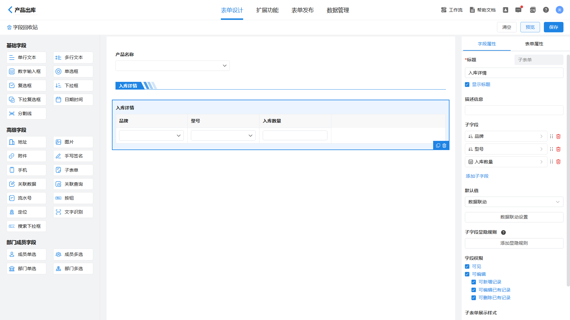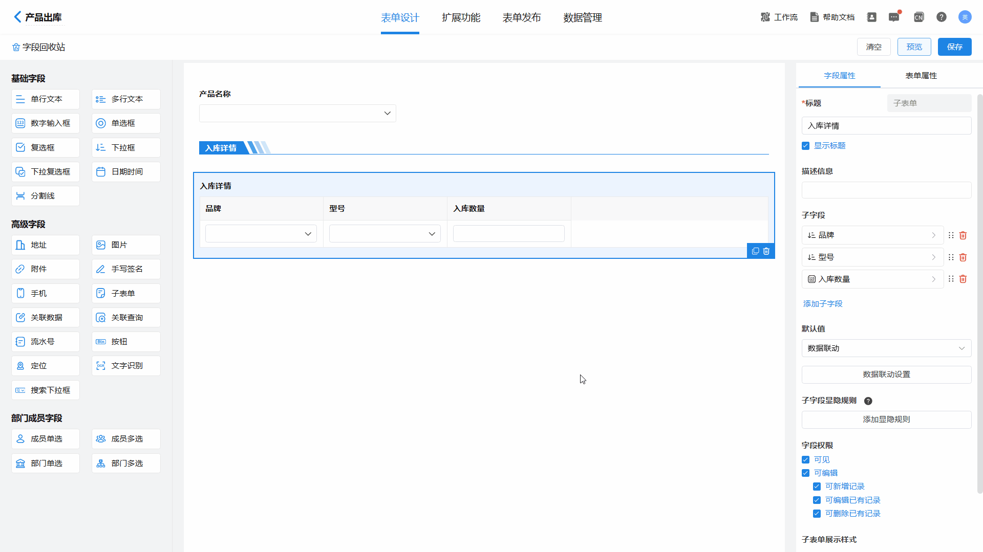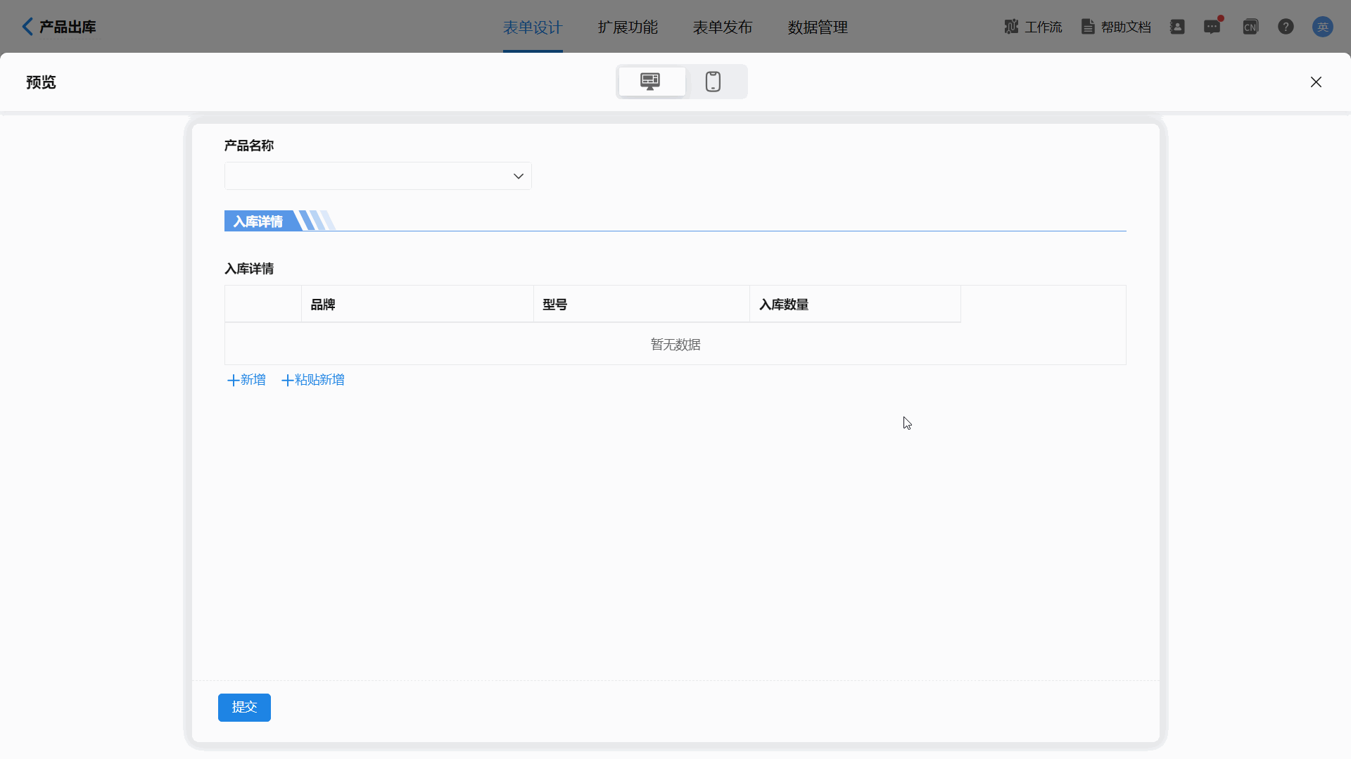 2)创建【产品出库】表单,表单包括产品名称和入库详情子表单,子表单包括品牌、型号、入库数量字段。