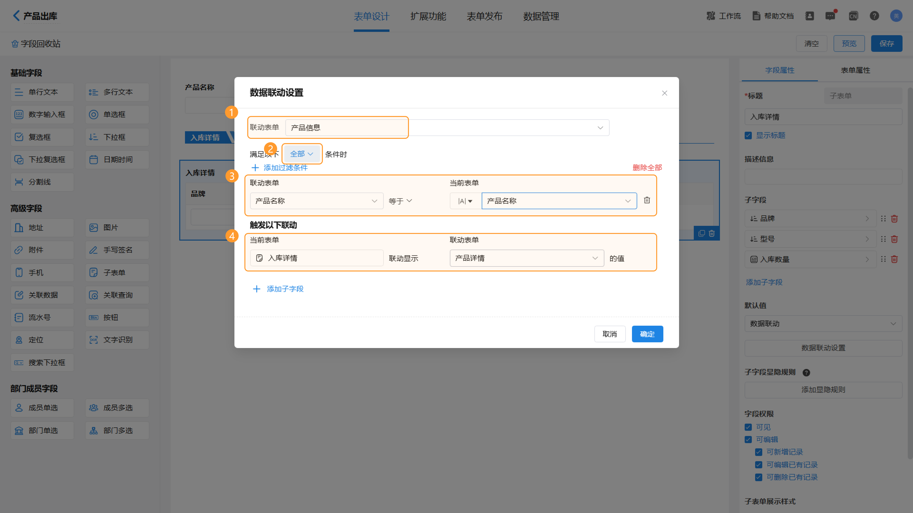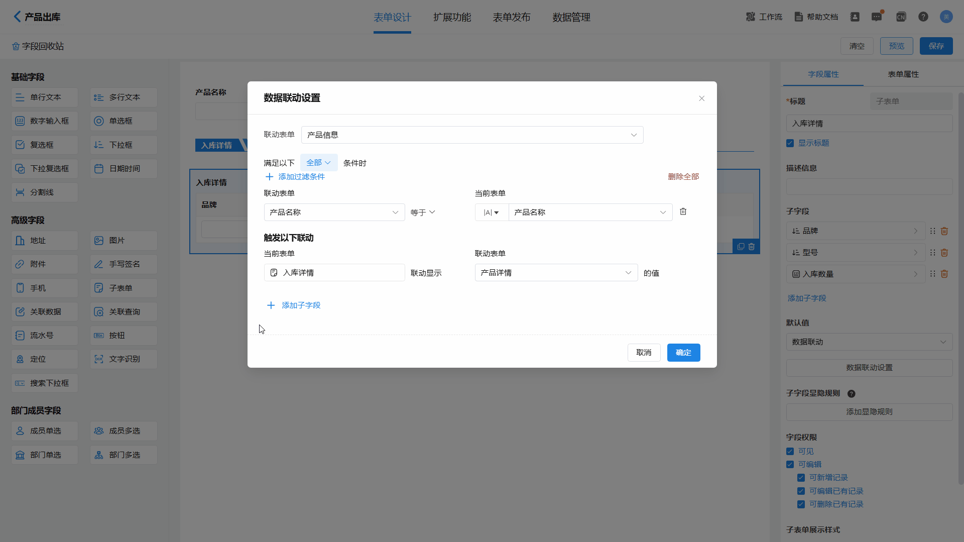 联动条件为:联动表单【产品信息】中“产品名称”字段等于当前表单(【产品出库】)中“产品名称”字段; - 触发联动为:当前表单(【产品出库】)中“入库详情”子表单联动显示为联动表单【产品信息】中“产品详情”子表单字段。