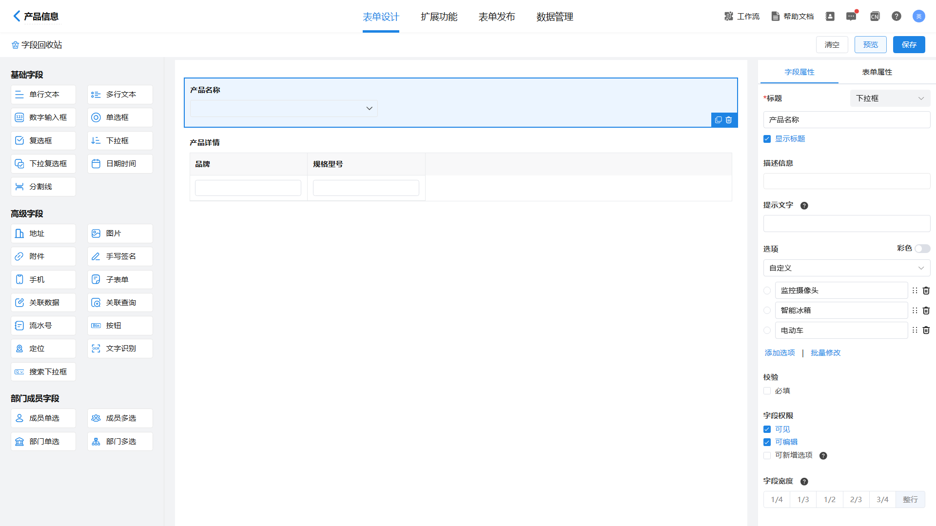 1)选择“产品名称”字段,在“字段属性”中“选项”处,设置为“关联其他表单数据”,与【产品信息】表单中“产品名称”字段关联。