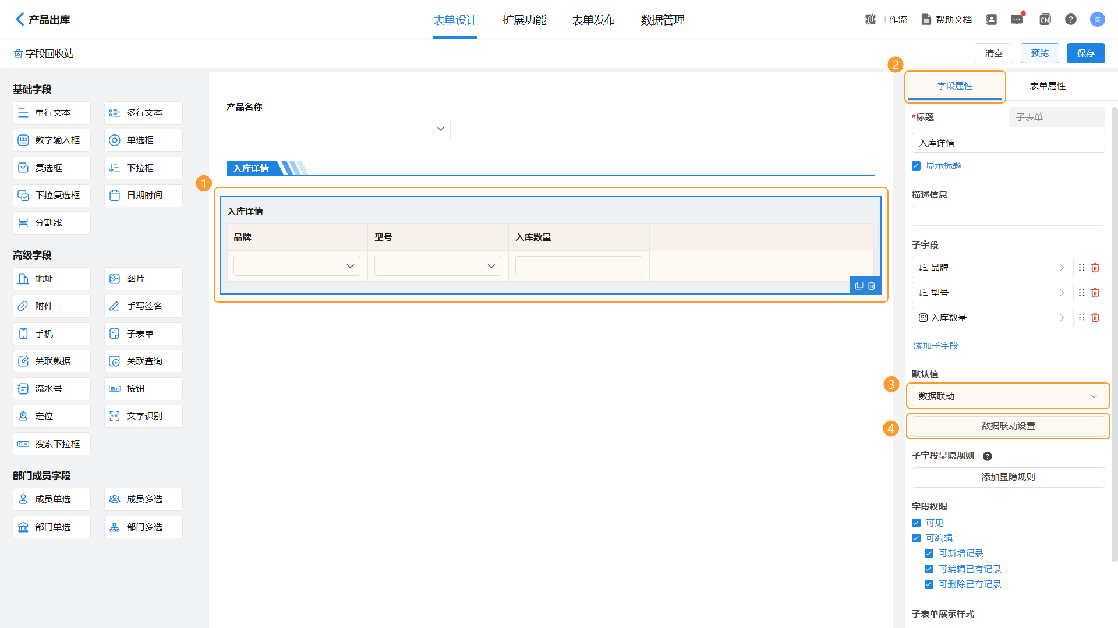 2)选择“入库详情”子表单字段,在“字段属性”中“默认值”处,设置为“数据联动”,点击“数据联动设置”。