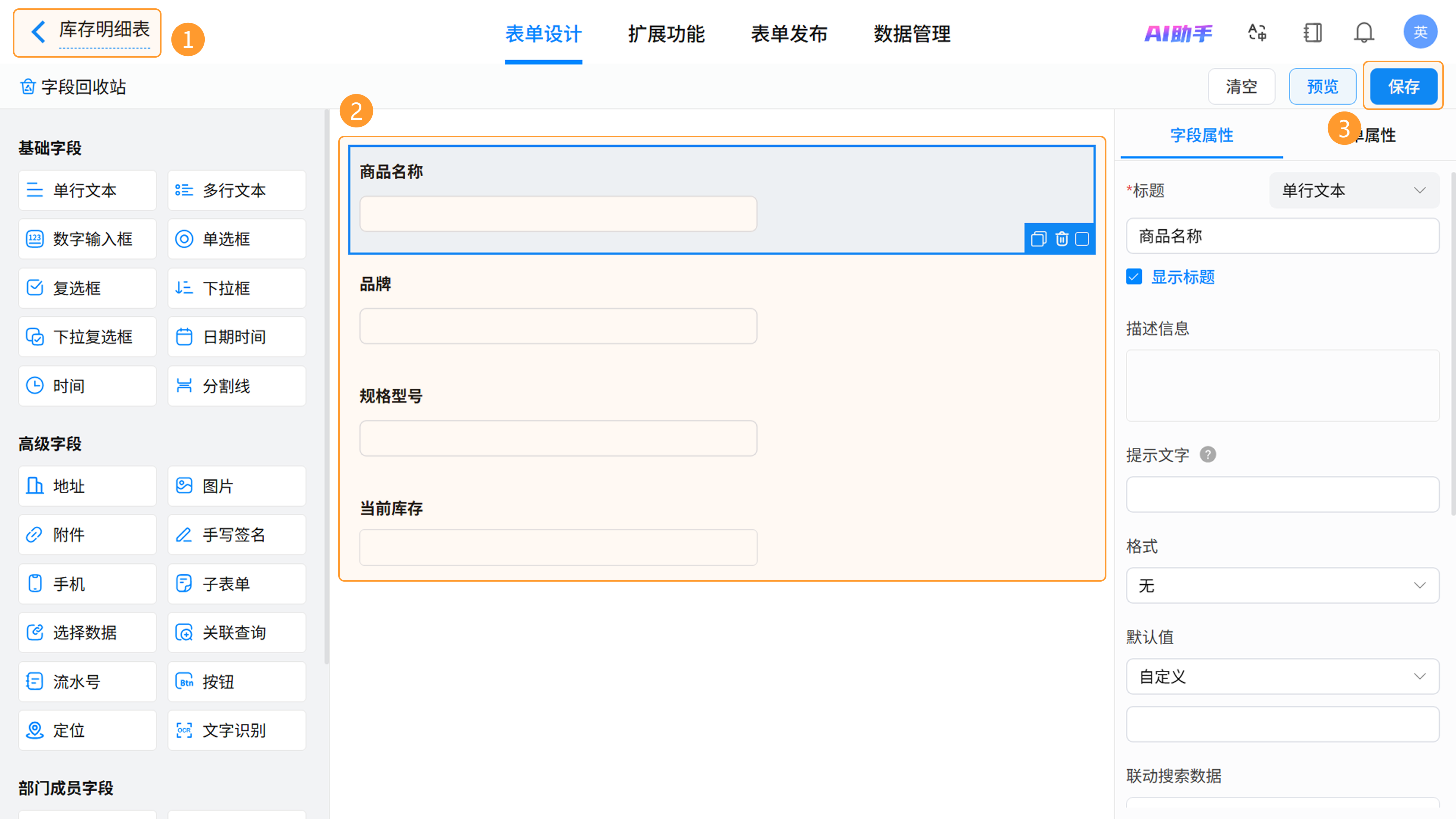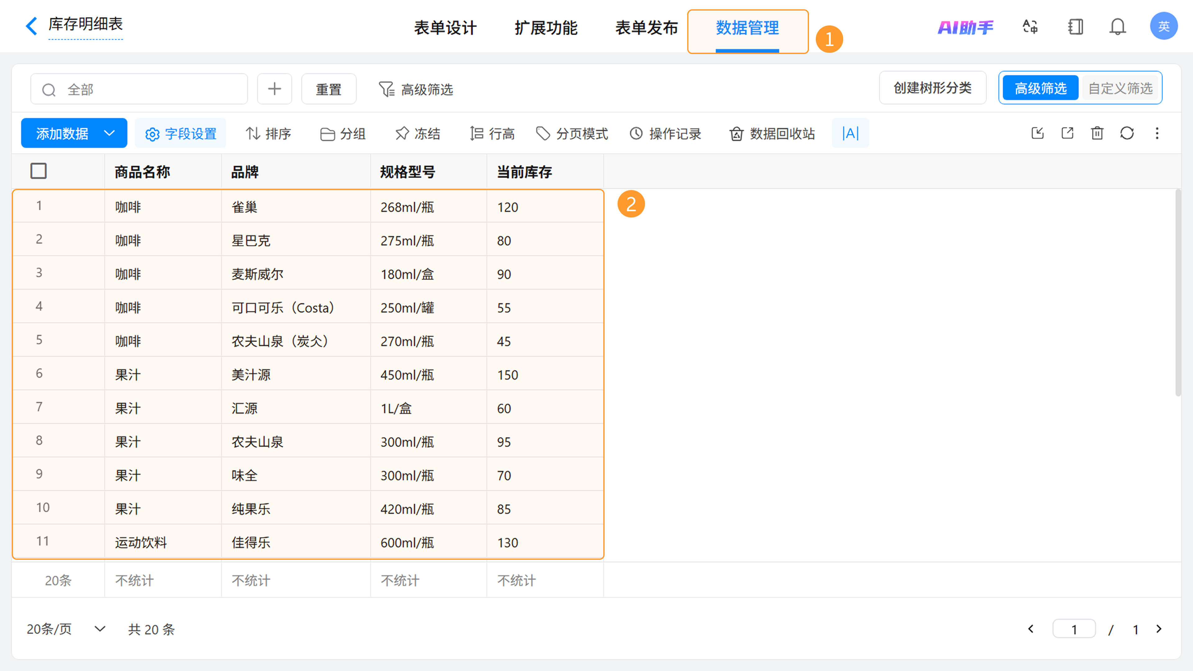 1)数据源表单:新建一个「库存明细表」表单,其中包含“商品名称”、“品牌”、“规格型号”以及“当前库存”等字段,并录入基础数据。