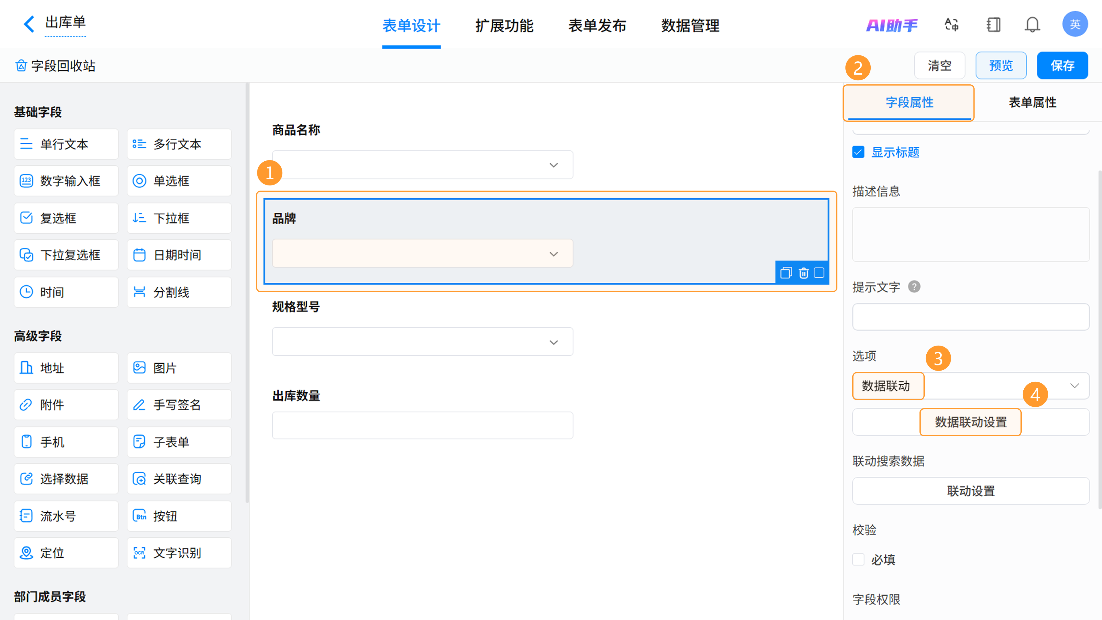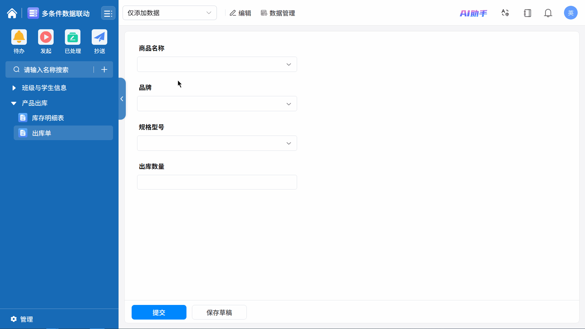 2)当前表单:新建一个「出库单」表单,包含“商品名称”、“品牌”、“规格型号”及“出库数量”等字段。