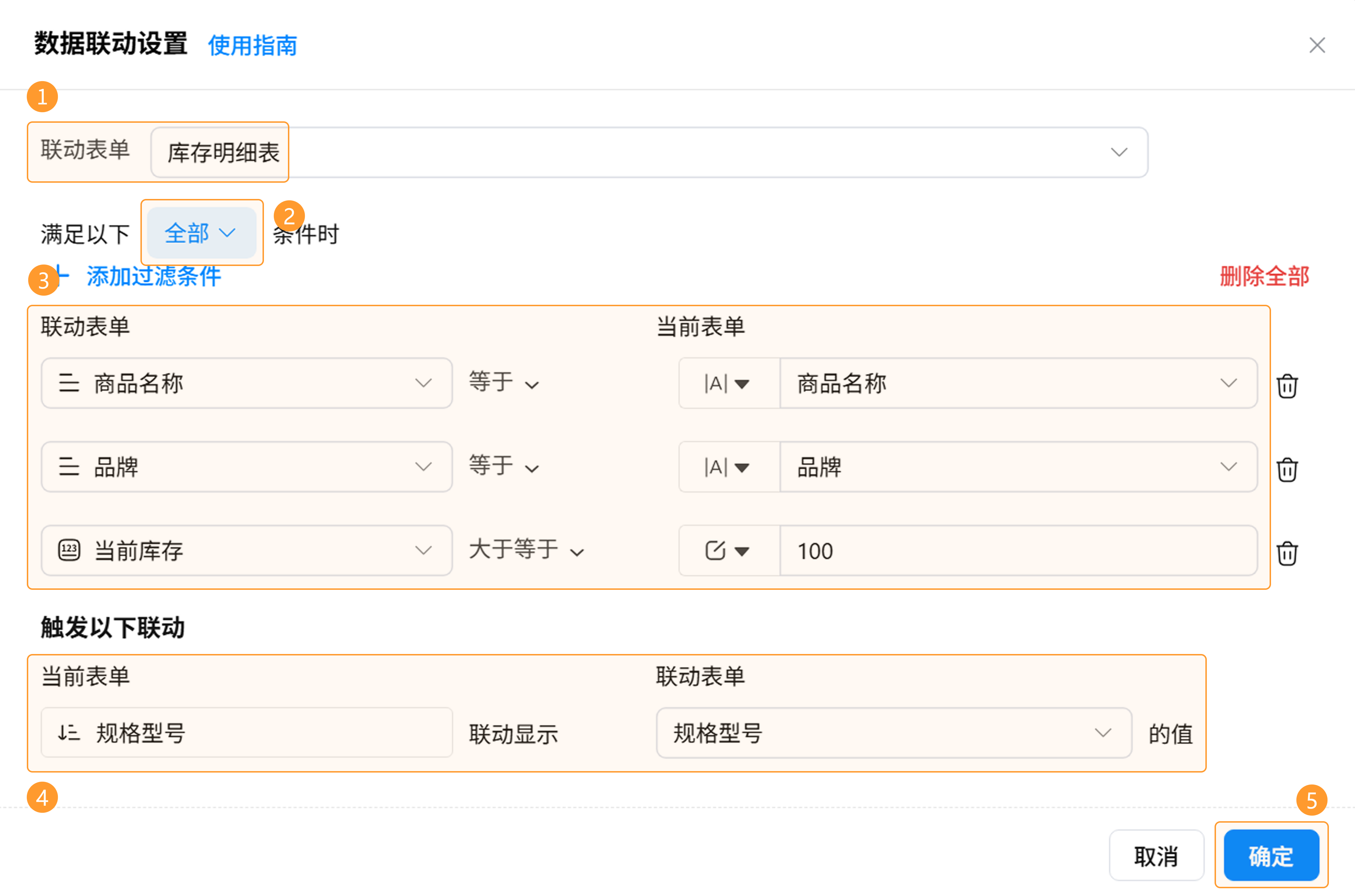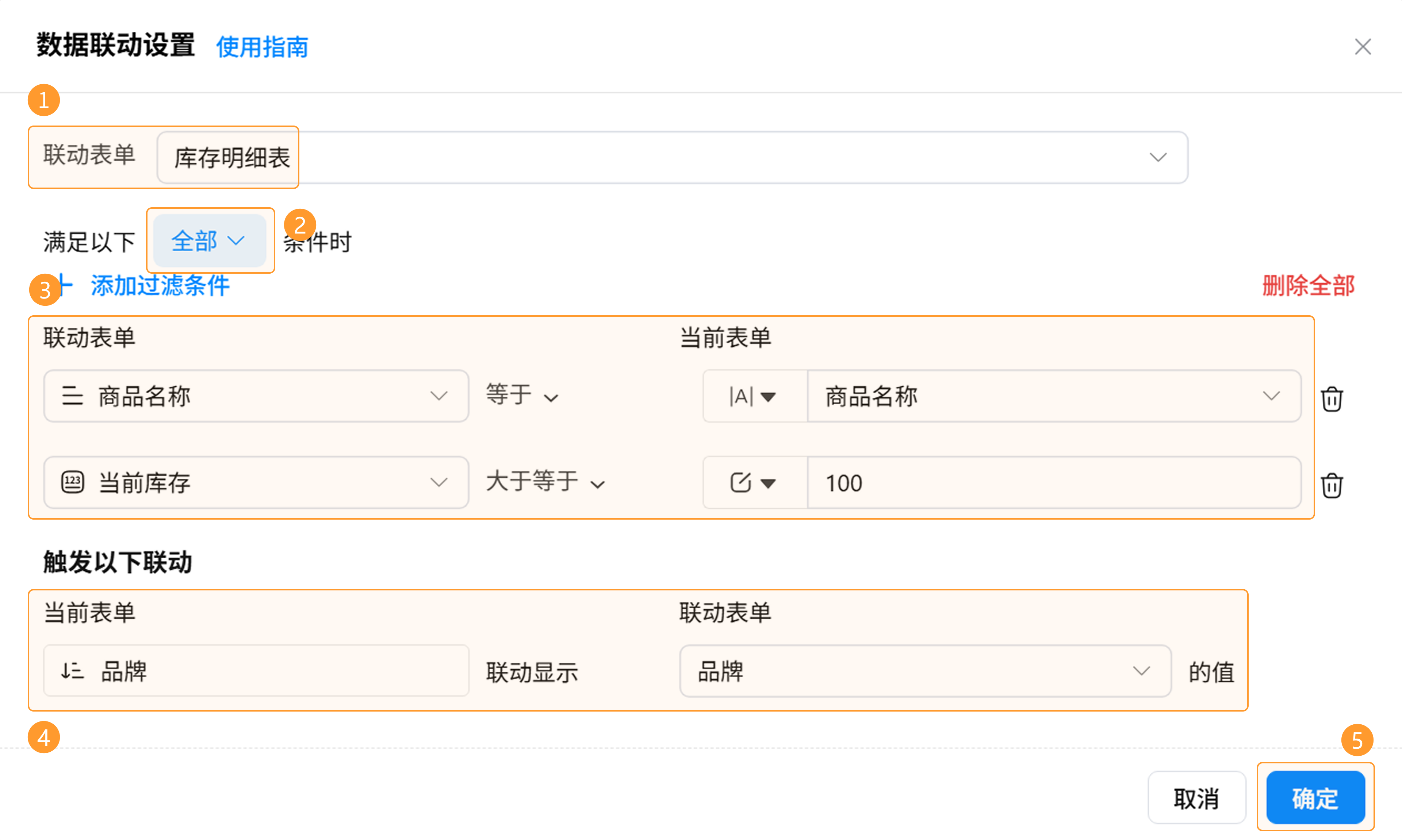 - 条件 2:联动表单“库存明细表”中的“品牌” 等于 当前表单中的“品牌”。