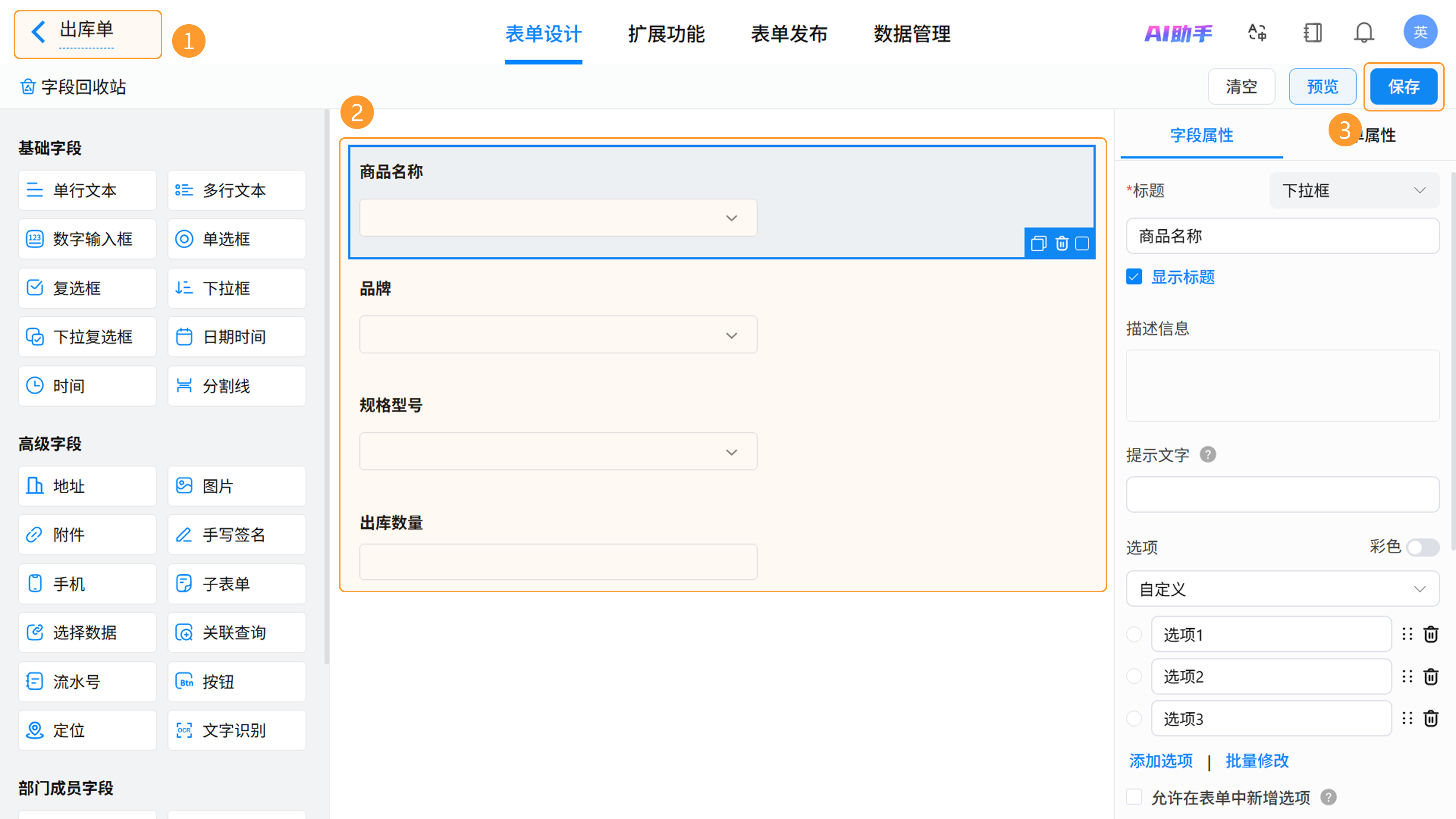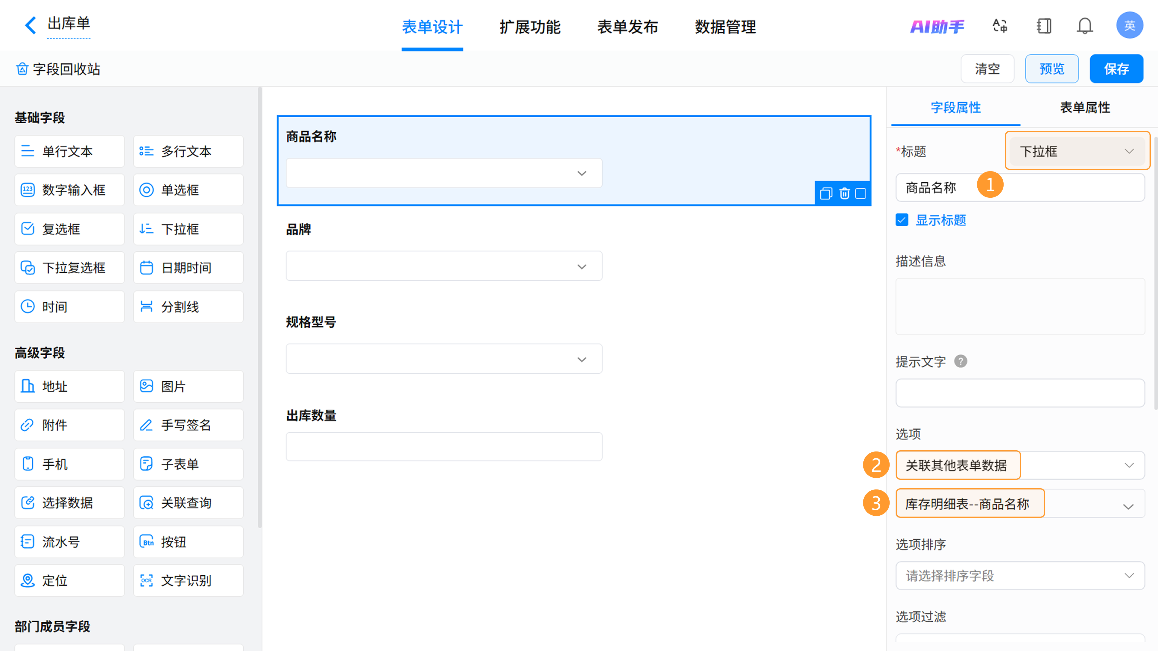 提示:此处将“商品名称(下拉框)”设置为「关联其他表单数据」,可以直接调用「库存明细表」的“商品名称”作为下拉选项,方便用户快速选择,无需手动输入。