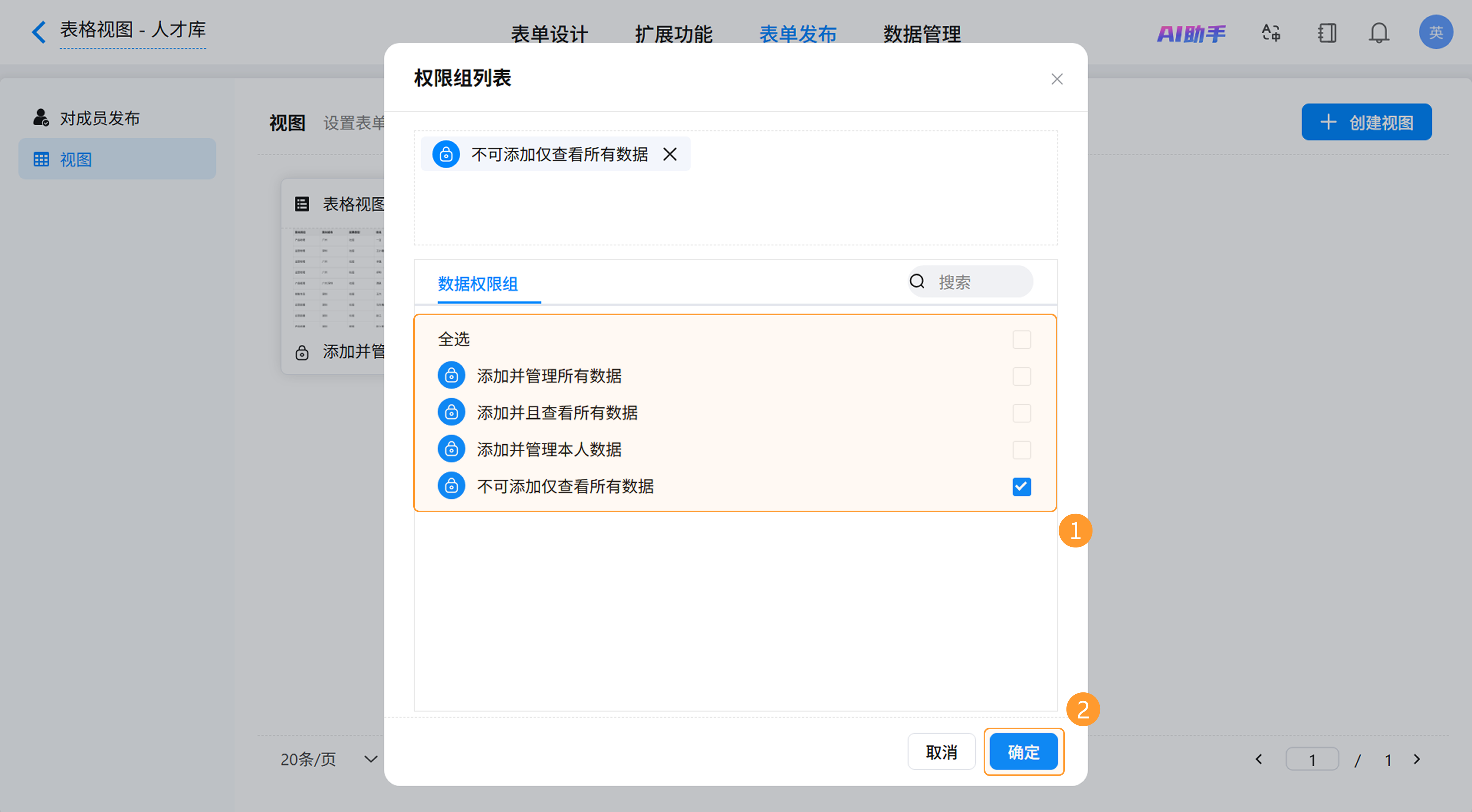 2)点击 「+ 表单权限」进行权限组配置(具体操作可选择查看:对成员发布)。
