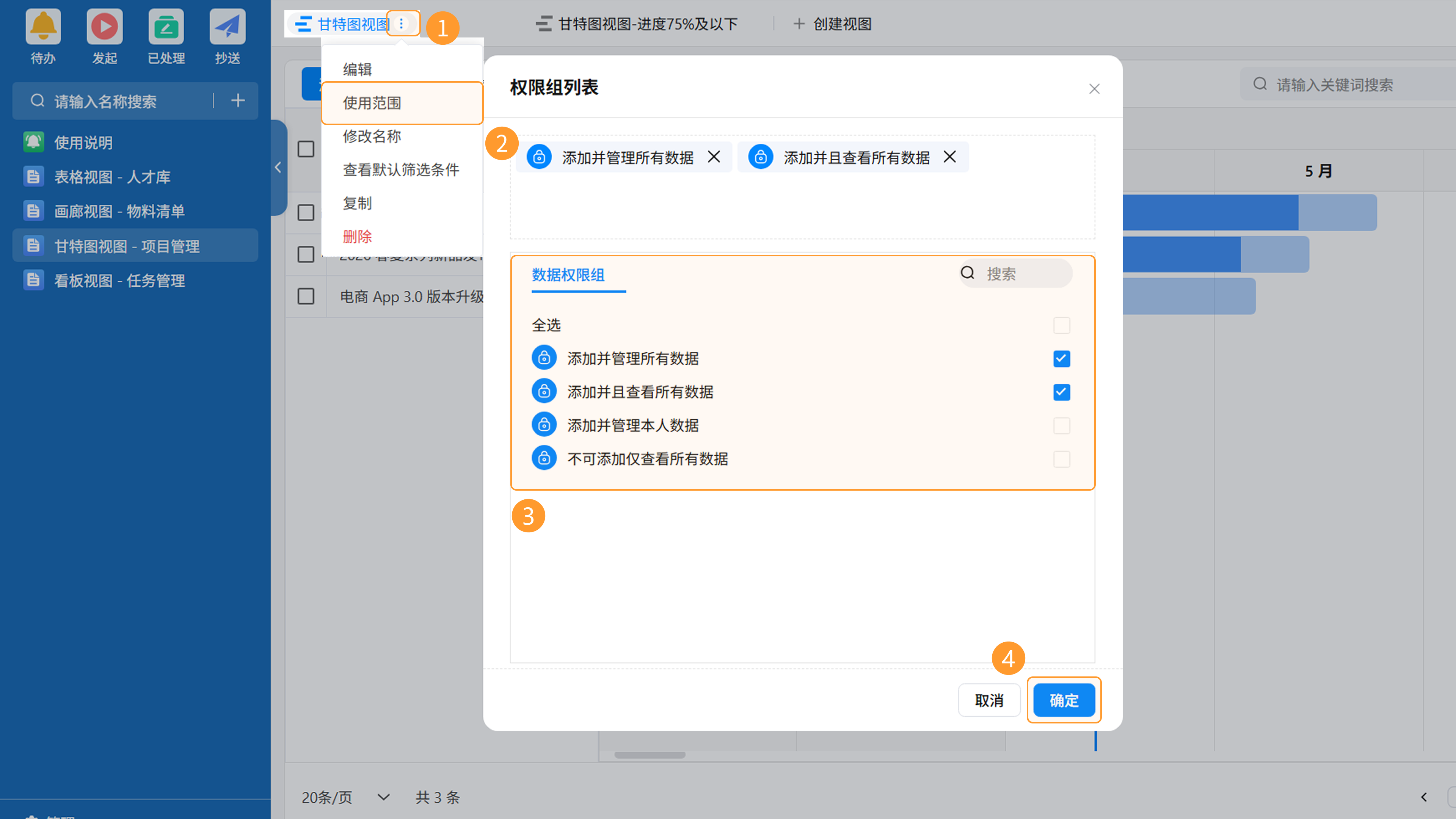 首次保存视图时,系统将自动弹出“使用范围”设置弹窗。您可以指定哪些部门、角色或成员(即您设置的权限组)具备查看该视图的权限。