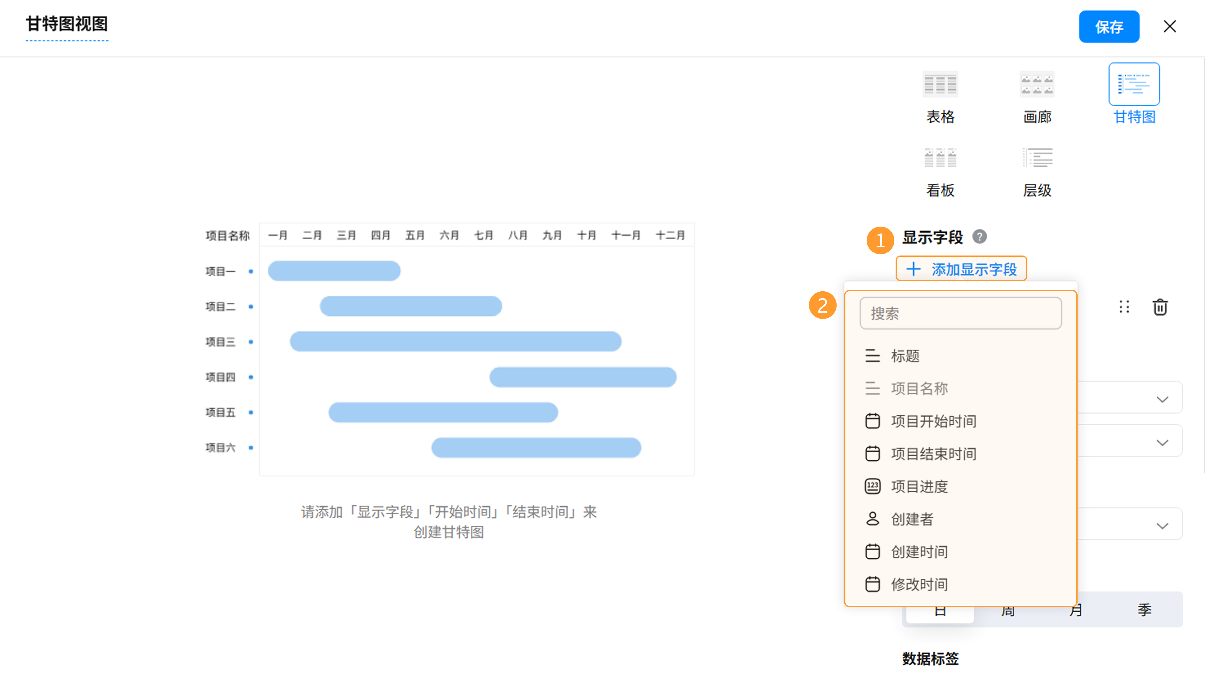 - 字段选择:点击「+添加显示字段」,支持添加需要展示的字段。甘特图不支持显示「关联查询」与「选择数据」字段。