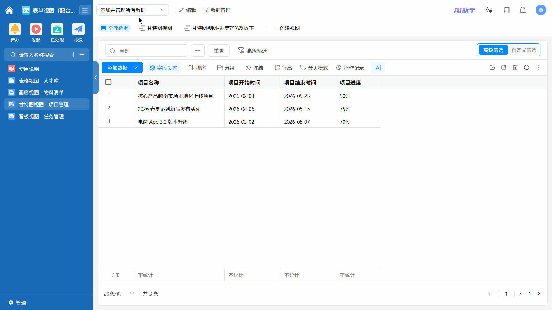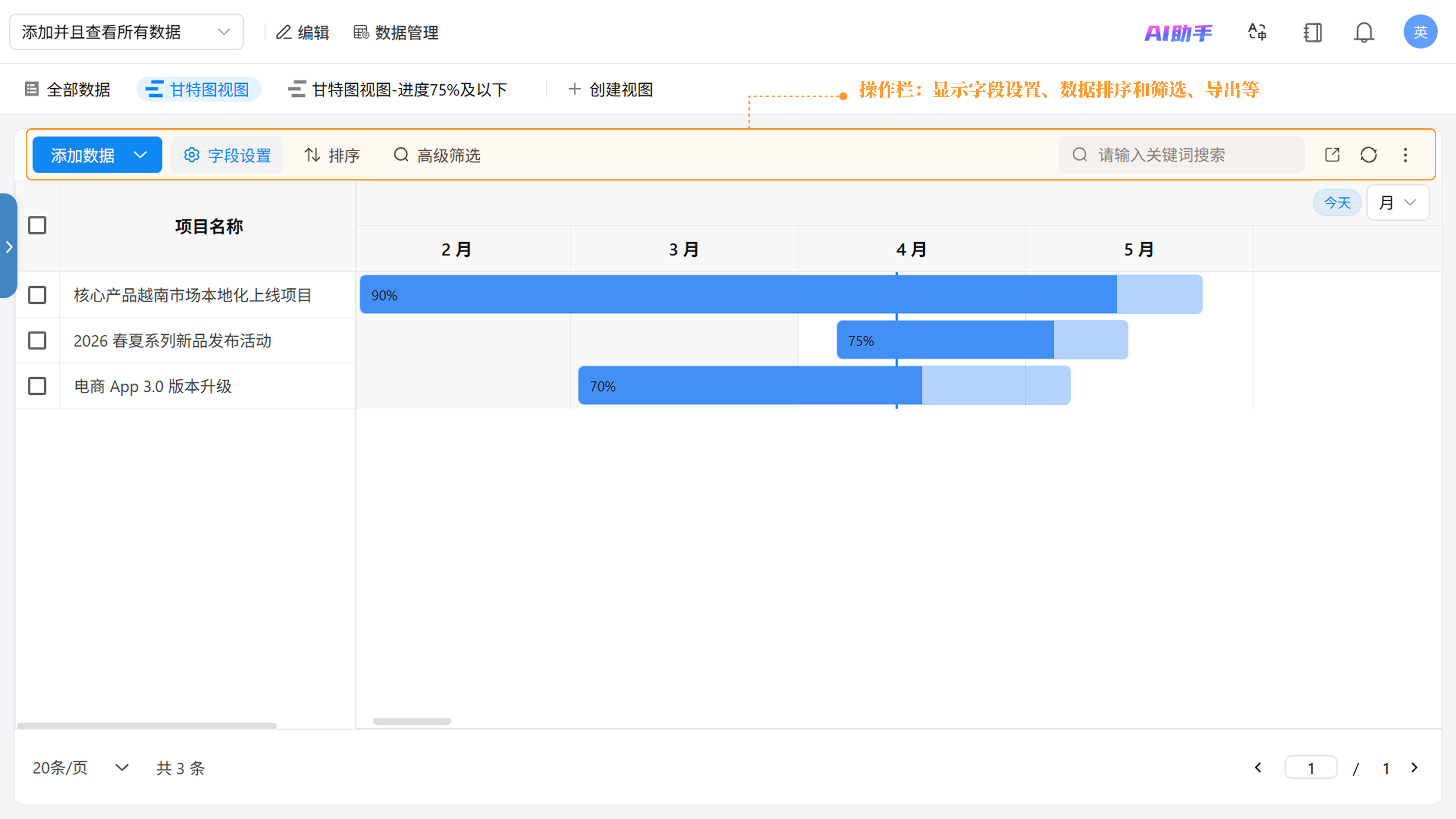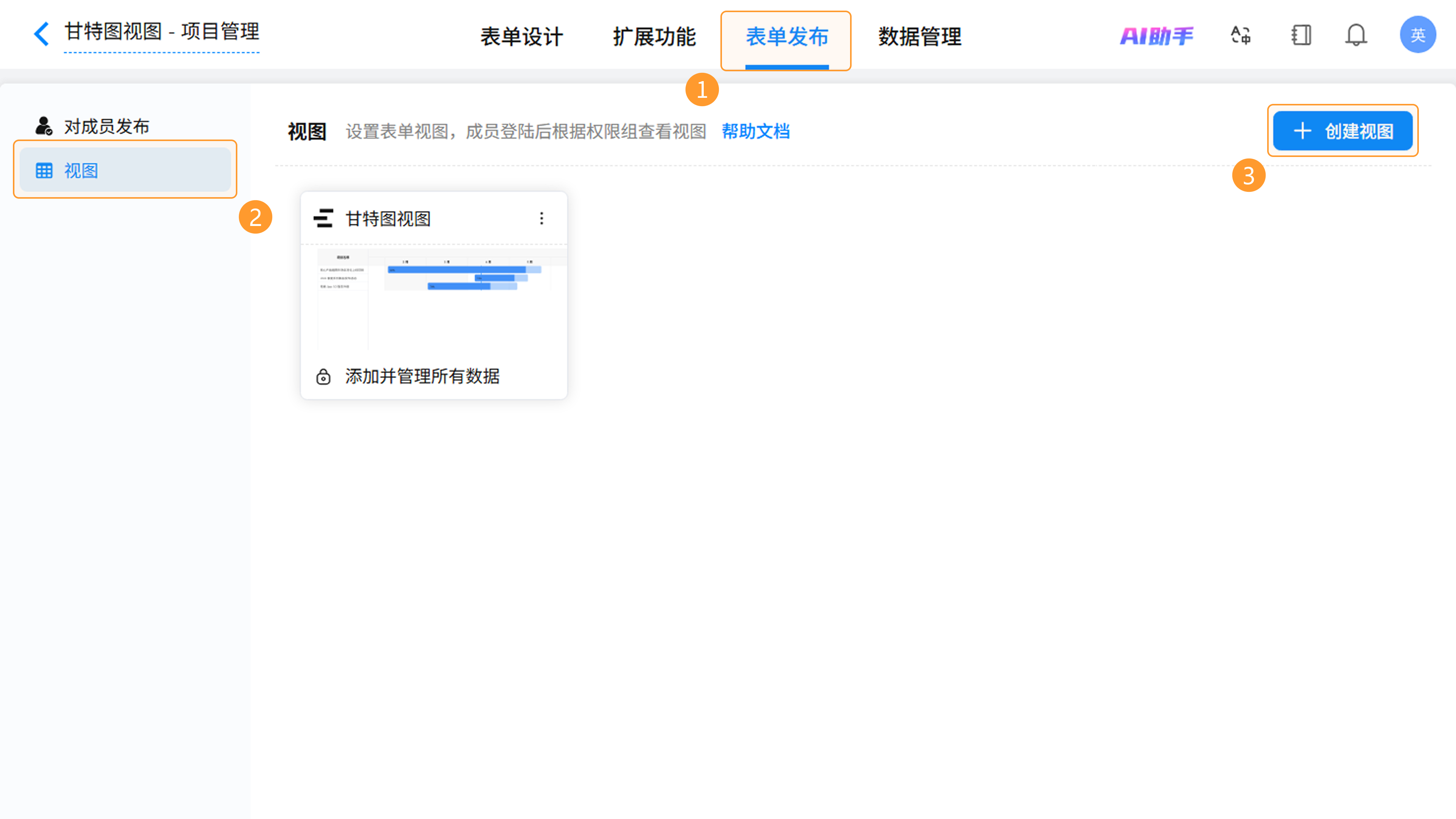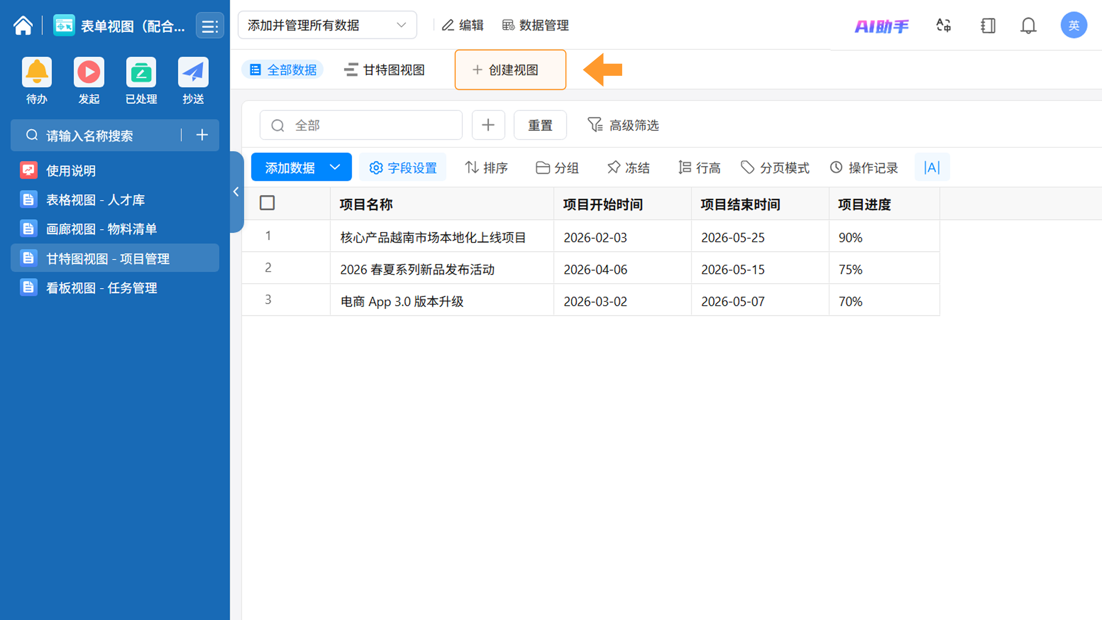 - 视图名称:在页面左上角可修改视图名称。(如:“甘特图视图”)。