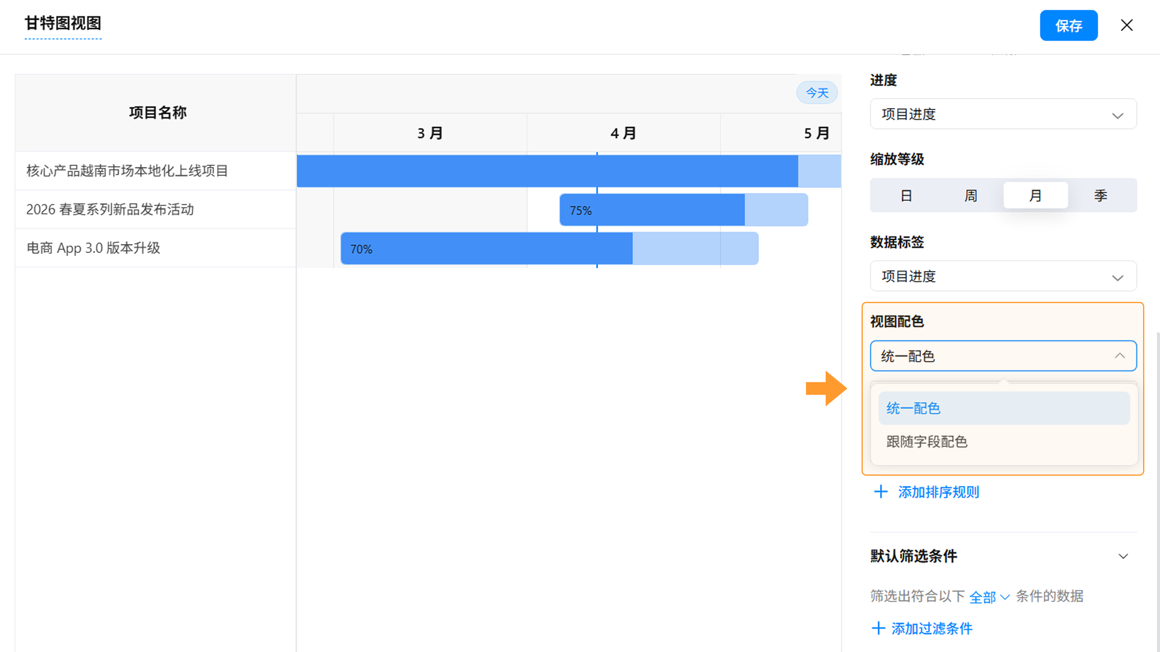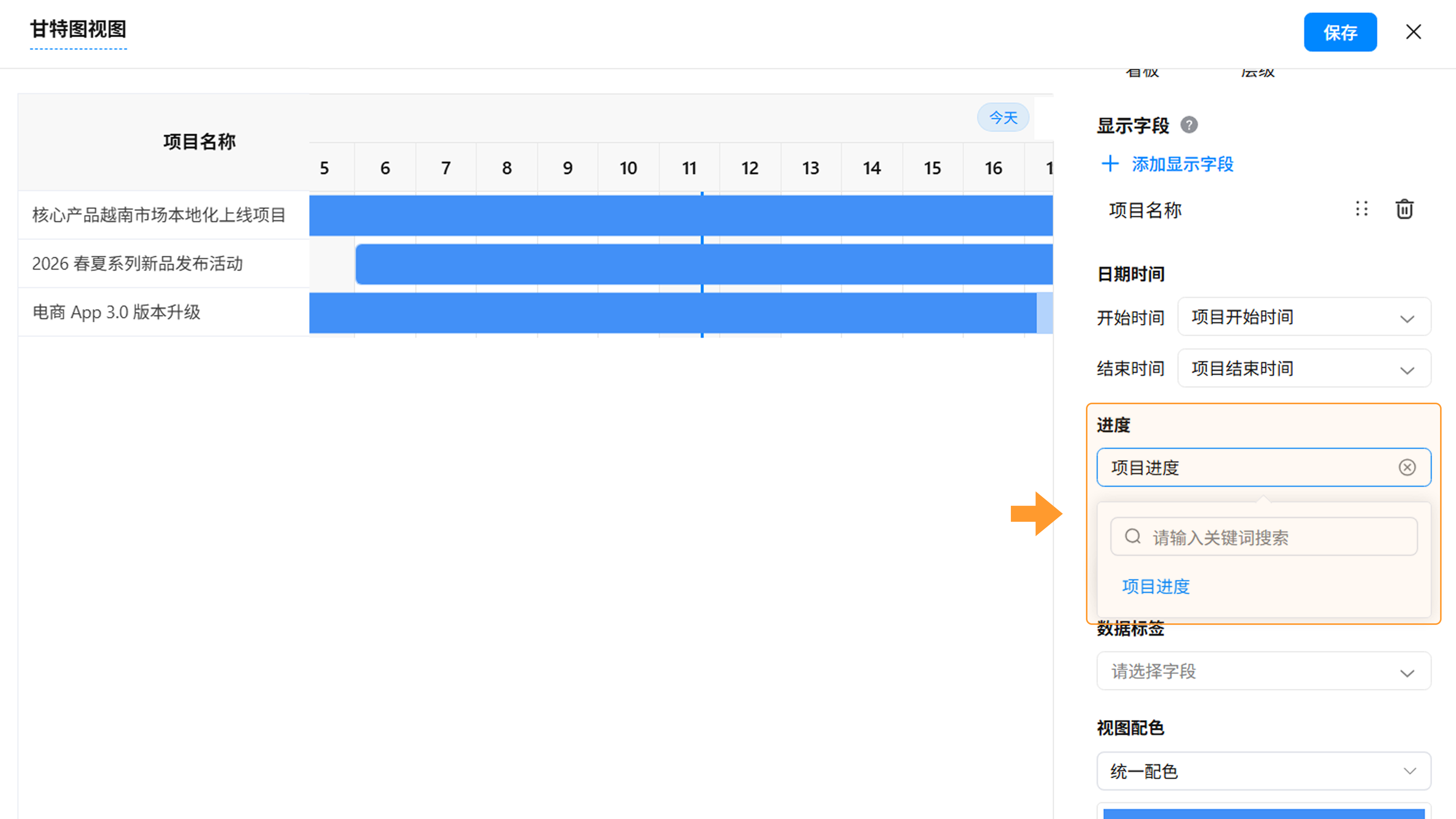 - 跟随字段配色:根据所选字段如“任务状态”)的选项颜色,自动为不同的任务进度显示对应配色。