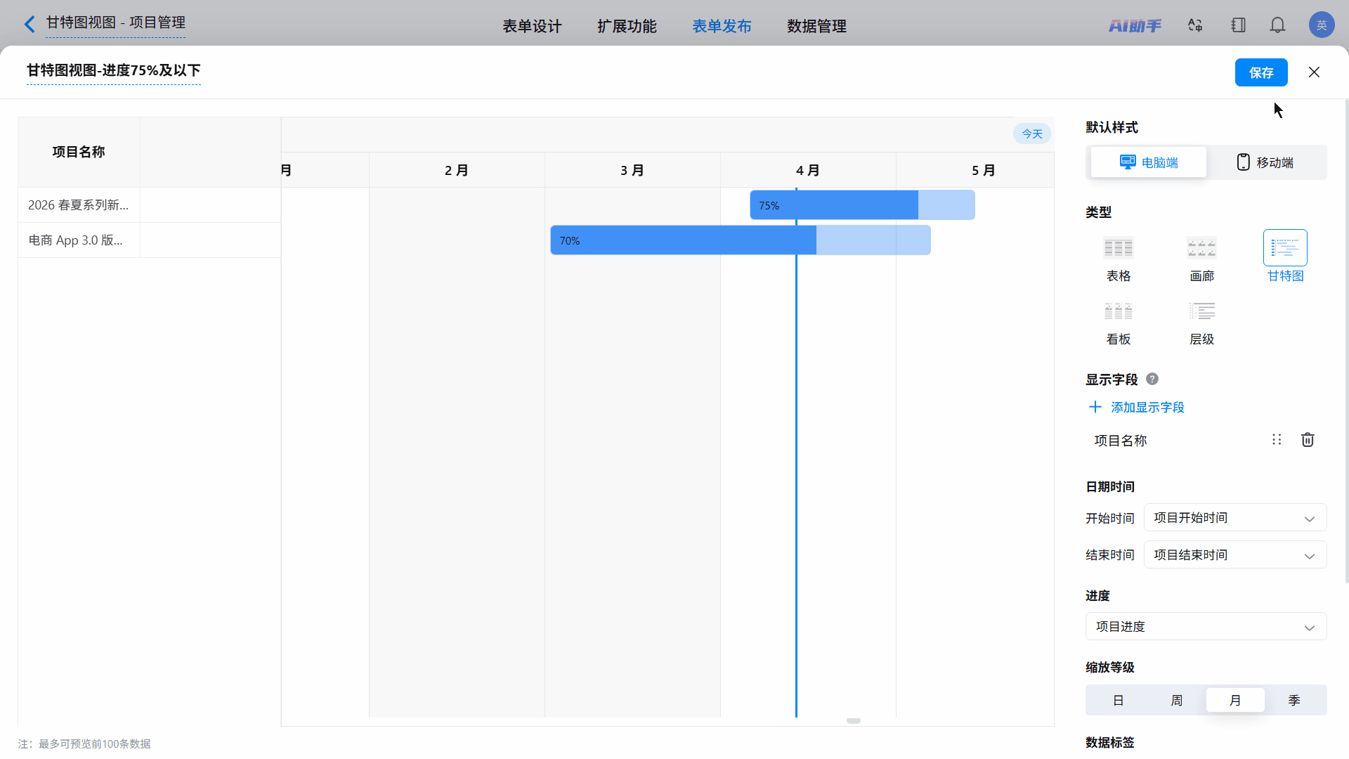 配置完成后,视图将仅展示符合特定业务要求(如:“项目进度小于等于75%”)的数据。
