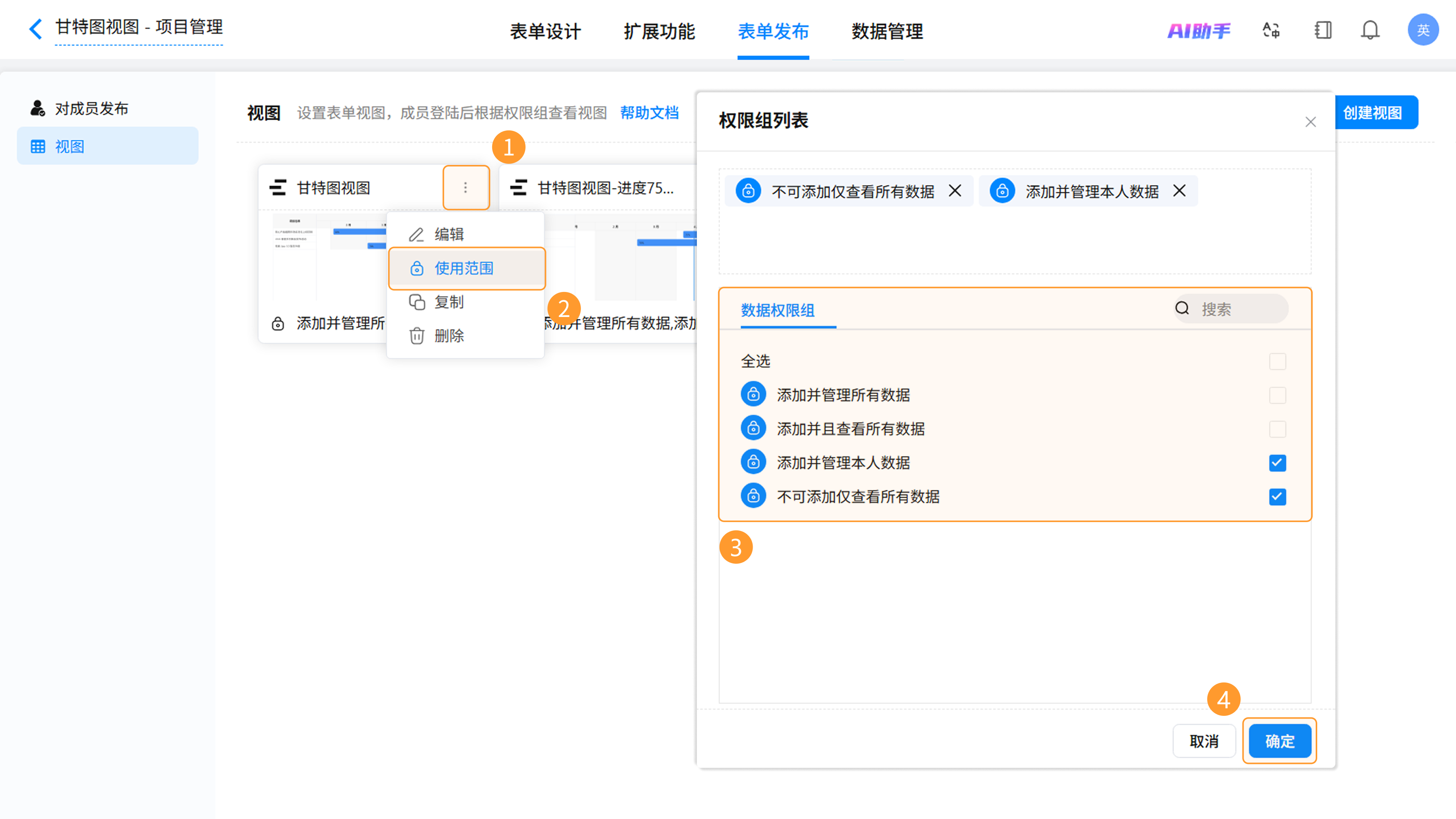 3)配置完成后,返回「表单发布 >> 视图」页面,点击对应视图右上角的「更多 >> 使用范围」,重新勾选权限组并保存。