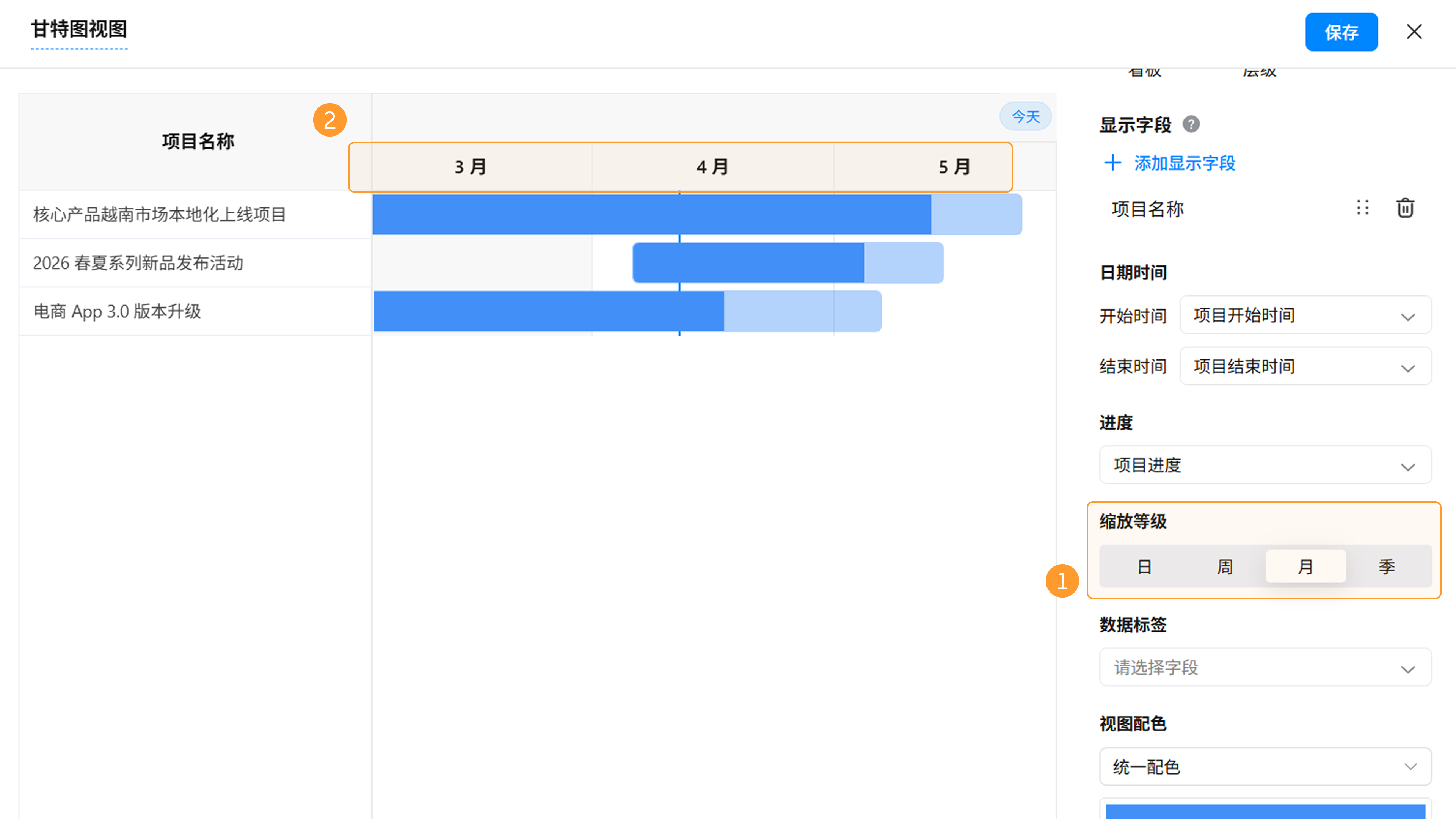 支持预设甘特图的时间轴刻度。系统提供“日”、“周”、“月”、“季”四种缩放等级,便于从不同时间维度审视项目分布。