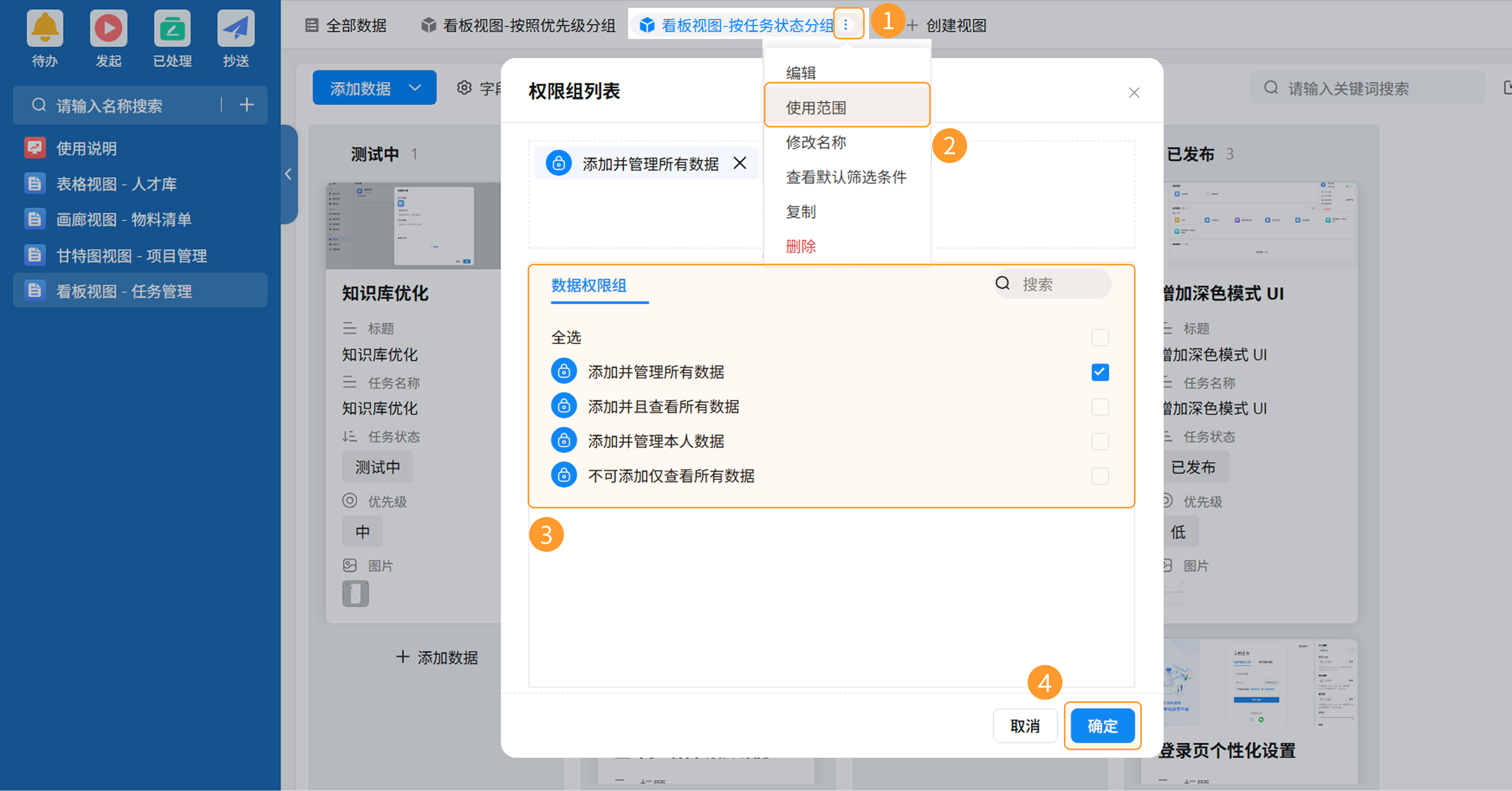 3)配置完成后,返回「表单发布 >> 视图」页面,点击对应视图右上角的「更多 >> 使用范围」,重新勾选权限组并保存。