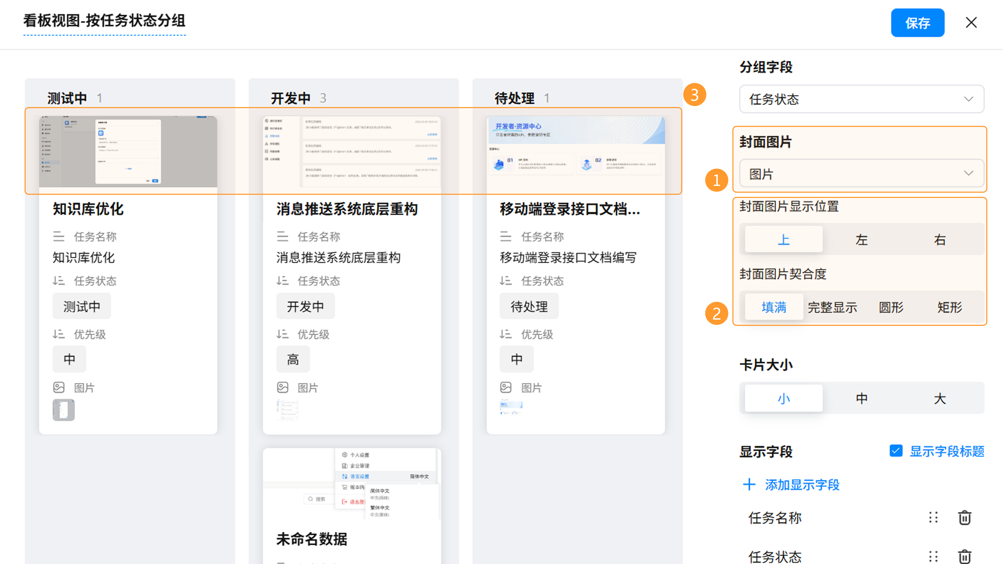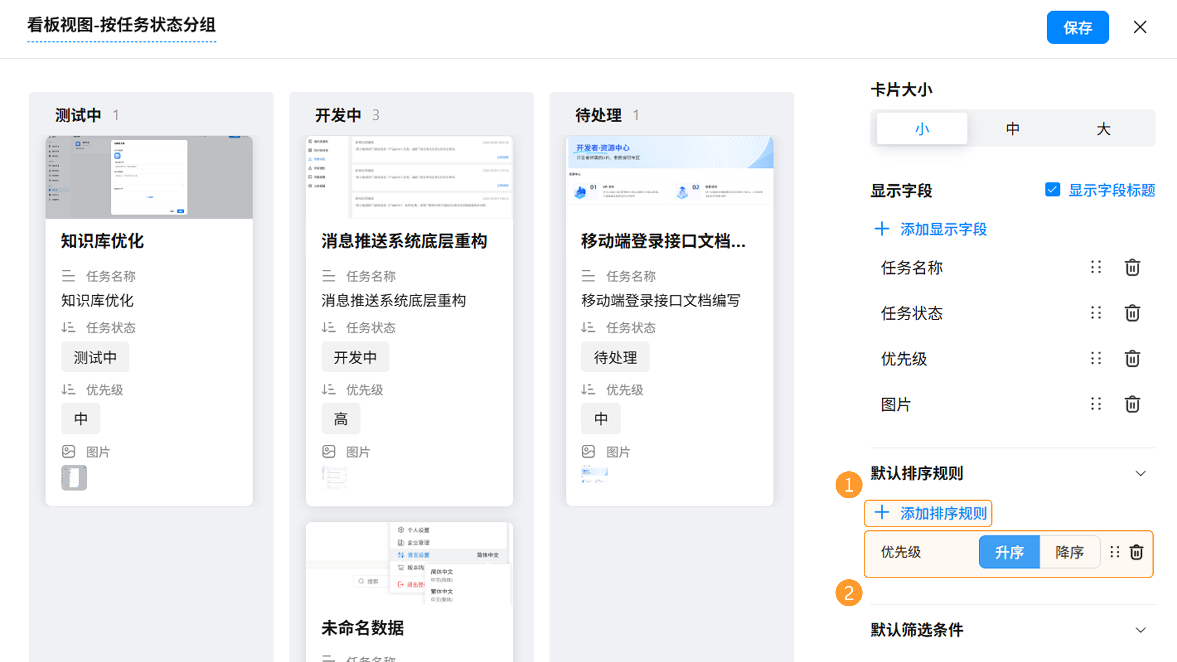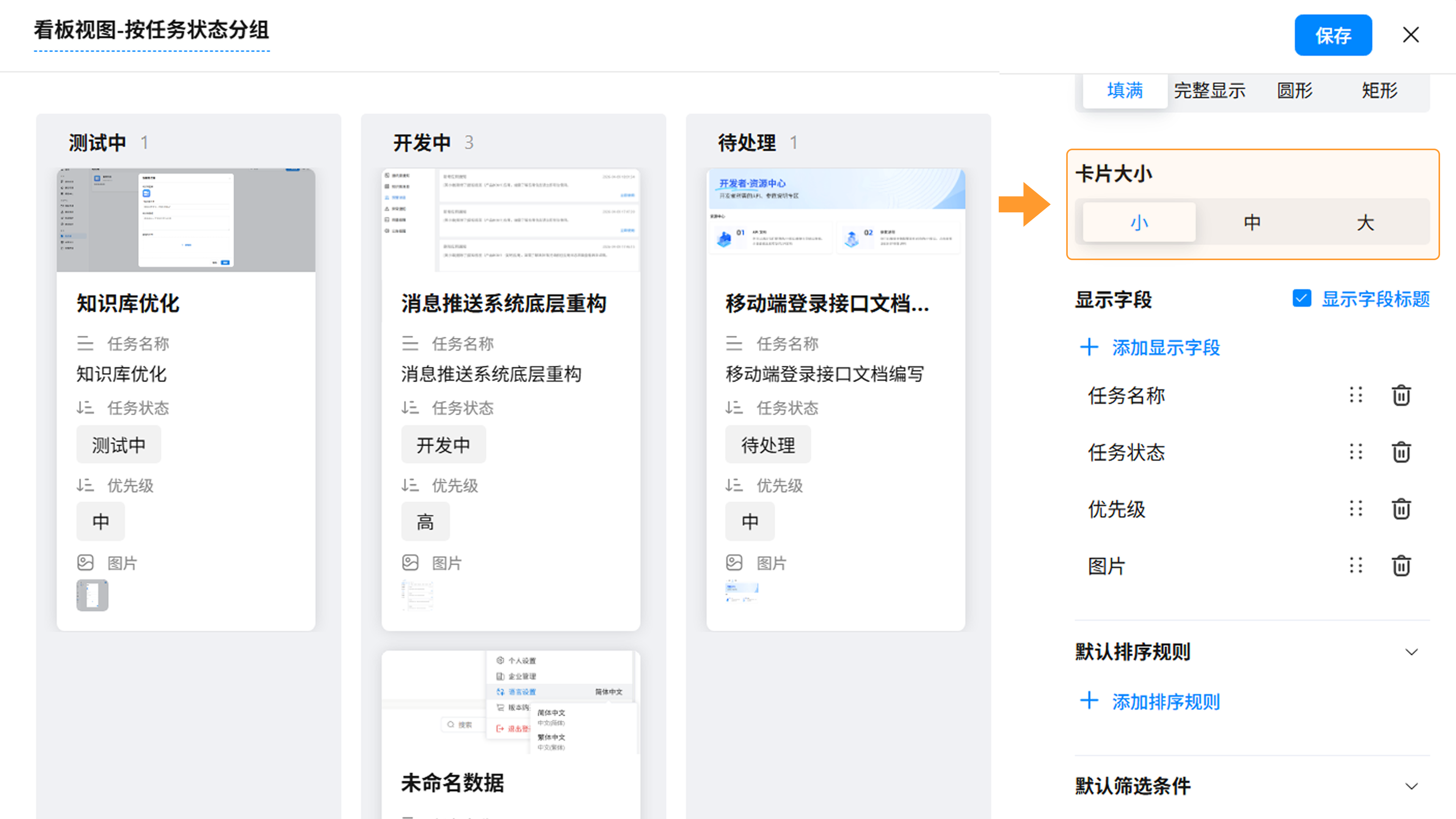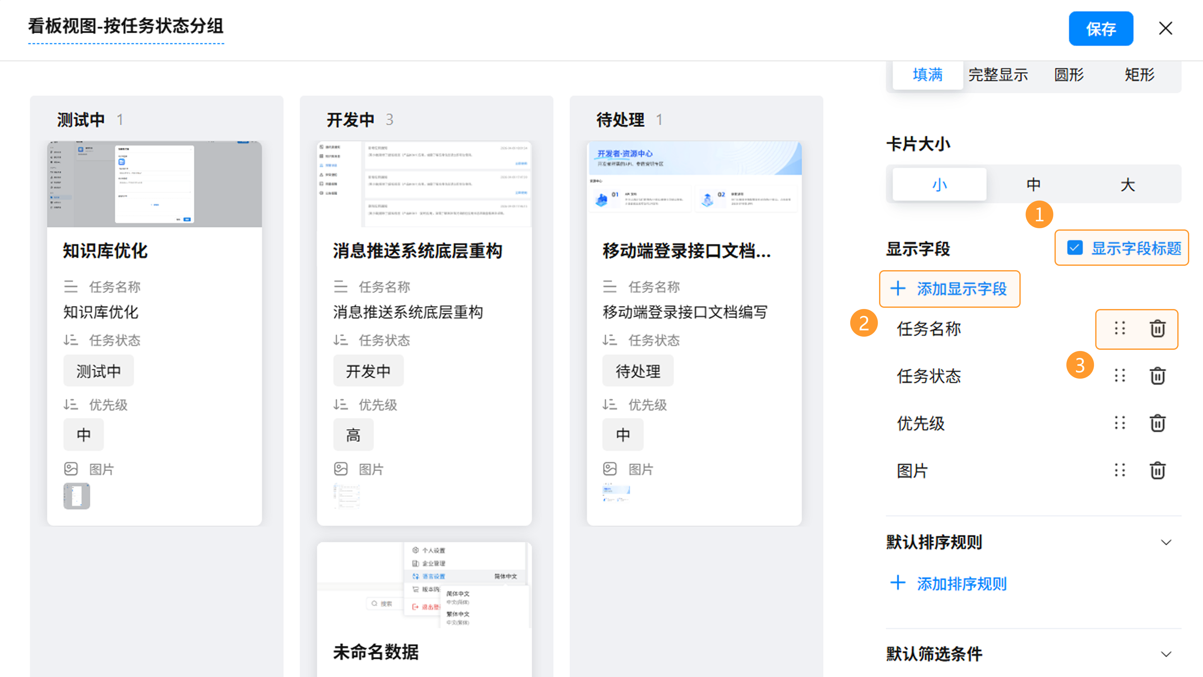 - 标题控制:勾选「显示字段标题」后,卡片将展示“字段名:字段值”(如:“优先级:高”),取消勾选则仅展示字段内容。
