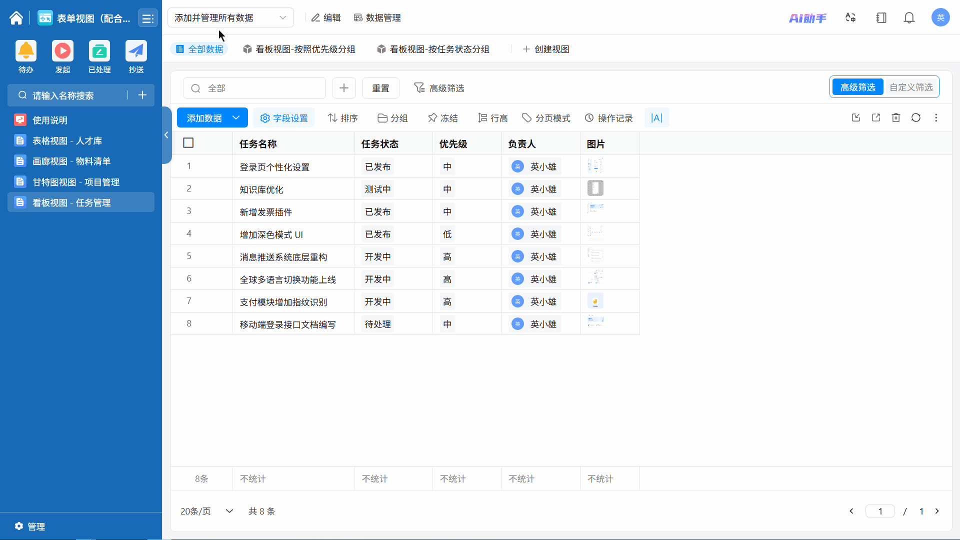 视图使用范围设置完成后,对应成员在表单页面的权限组中可查看该视图。成员在画廊视图下支持进行排序、高级筛选、关键词搜索、数据导入导出等操作。各项操作的具体方法,请参考文档:表单操作。
