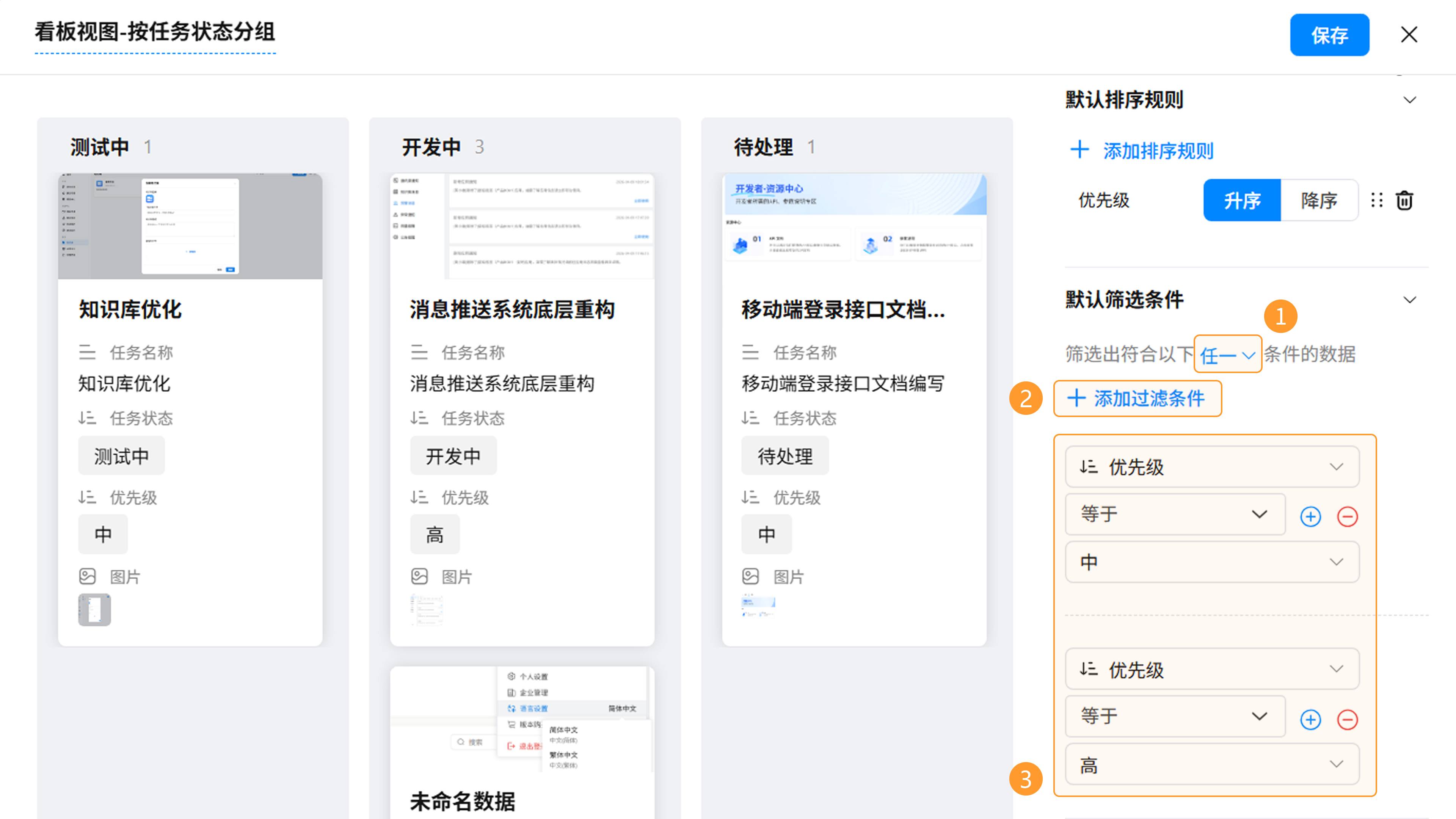 配置完成后,视图将仅展示符合特定业务要求(如:“优先级等于中或者高”)的数据。