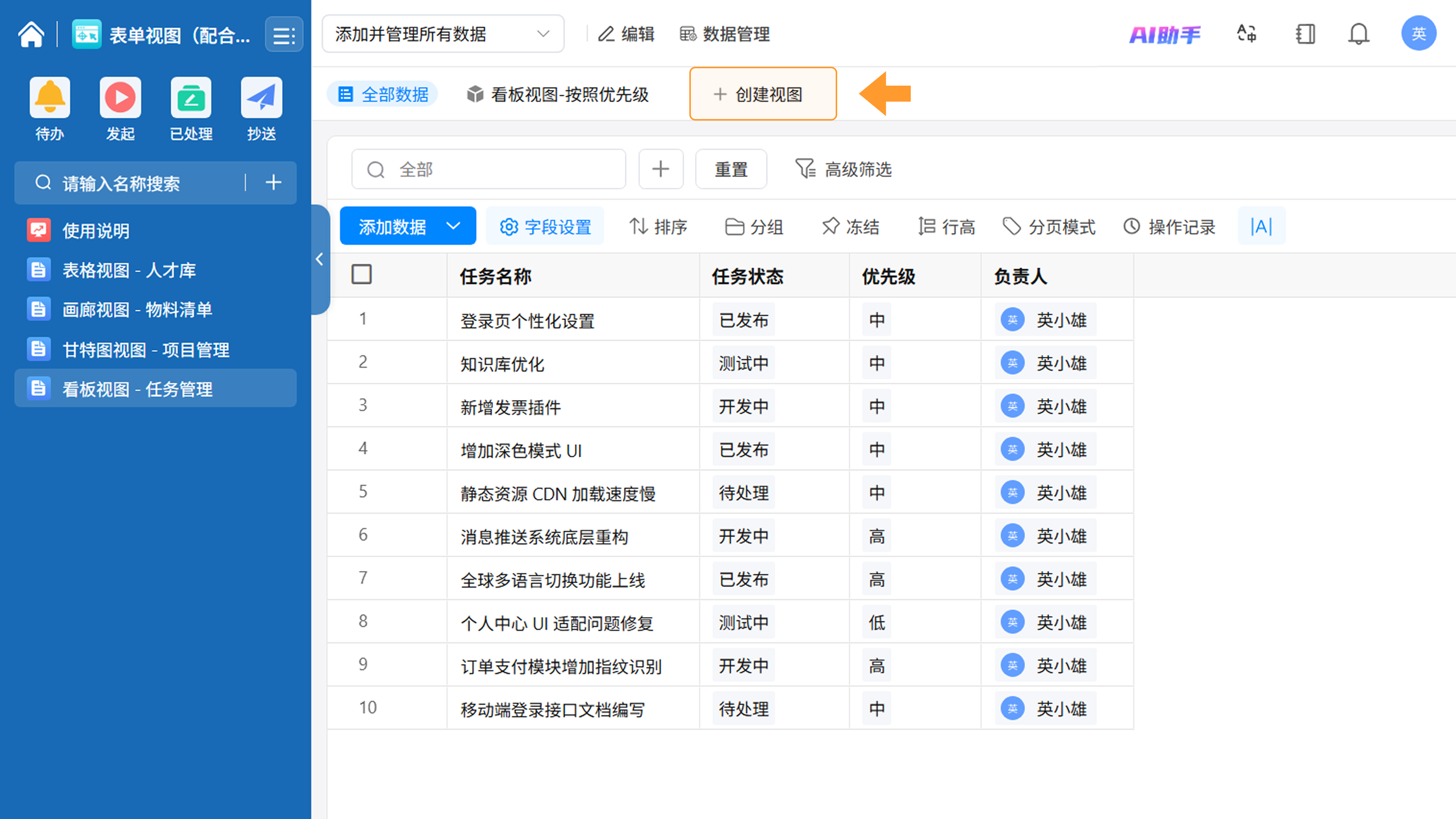 - 方式一:在表单数据页面,点击顶部的「 + 创建视图」。