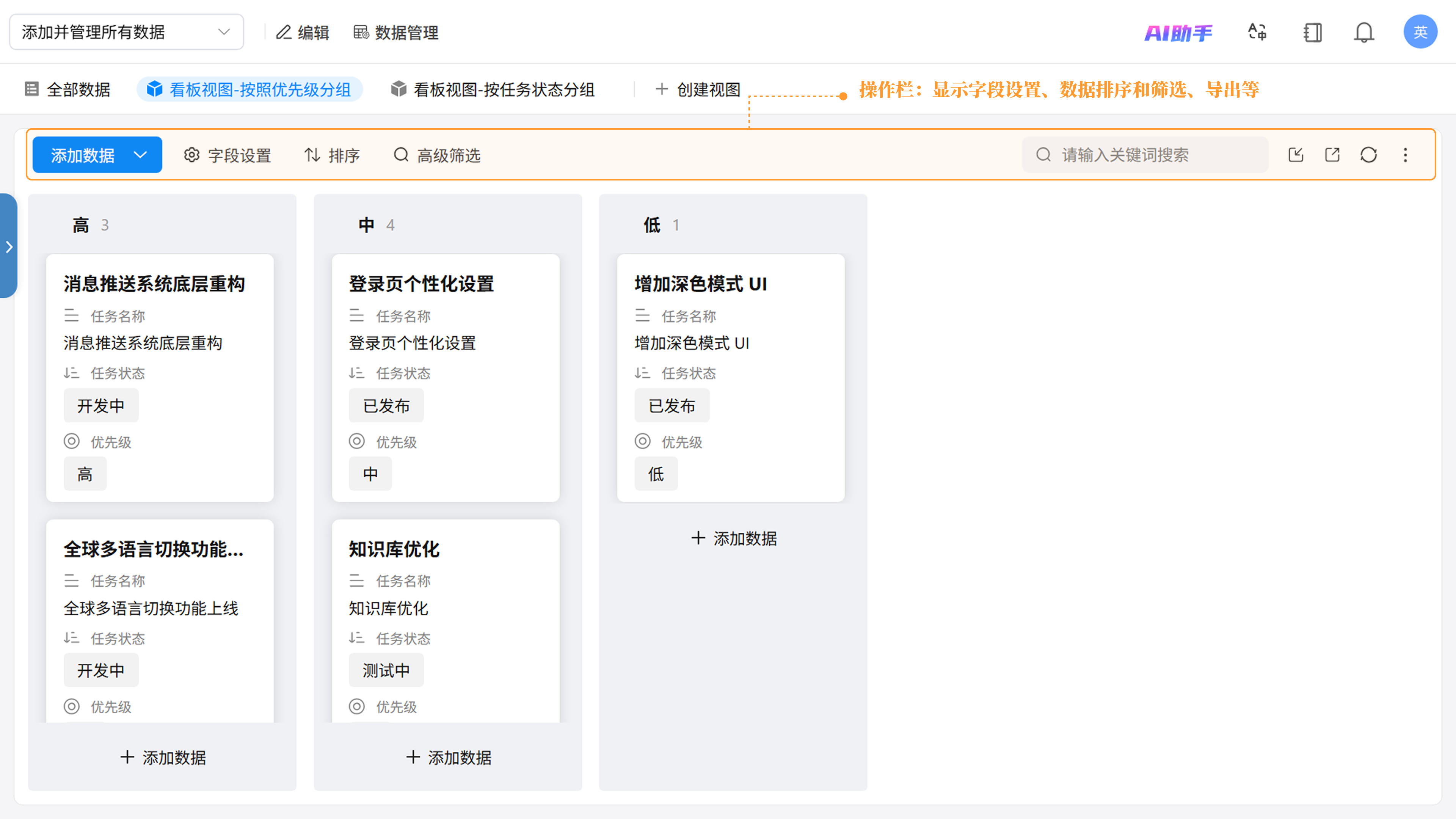 看板视图是以卡片样式展示分组数据的视图模式。它通过直观的列式布局将数据按特定维度归类,每个卡片代表一条数据记录,便于用户快速查看并掌握不同分组下的业务分布状态。