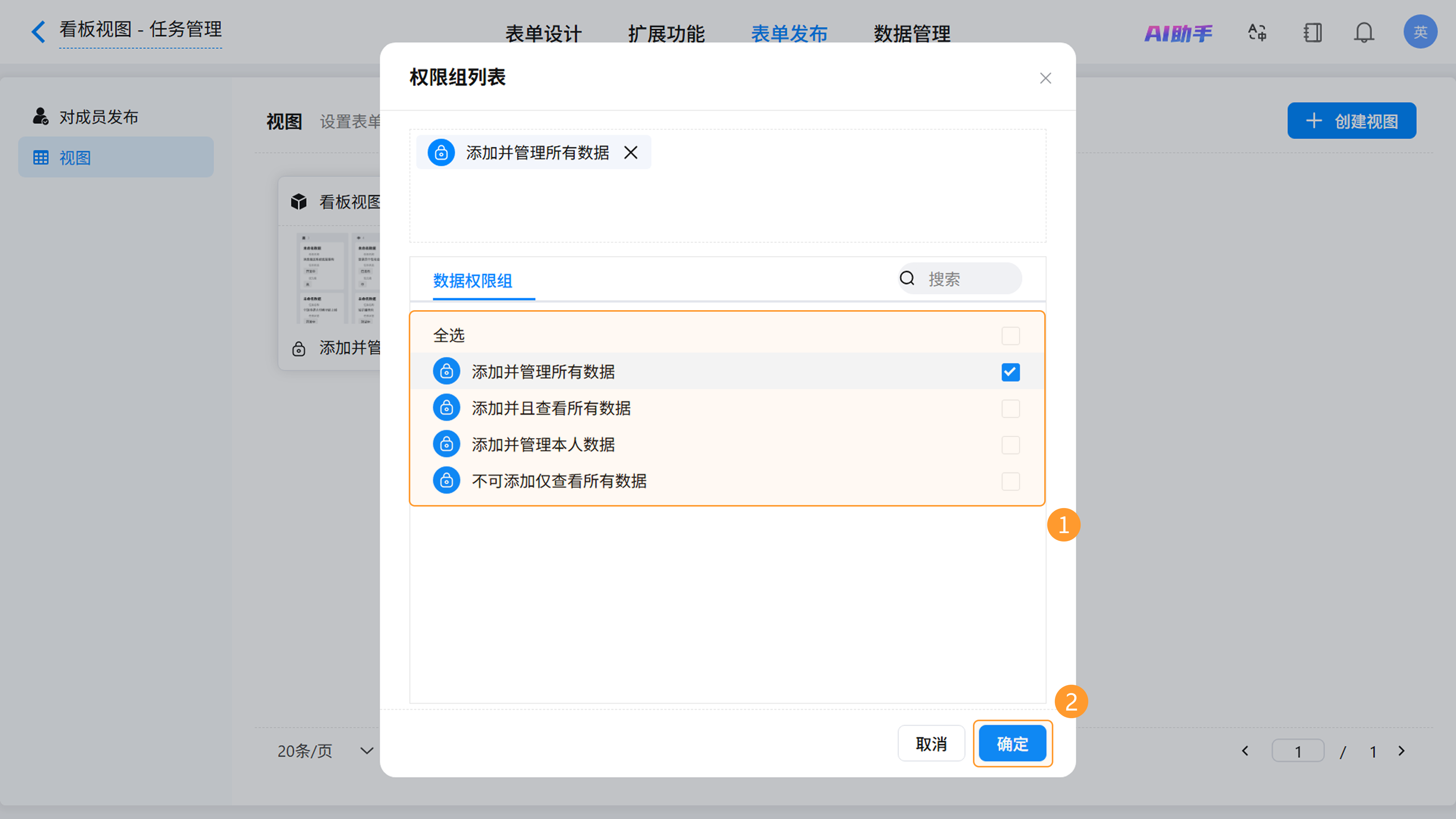 2)点击 「+ 表单权限」进行权限组配置(具体操作可选择查看:对成员发布)。