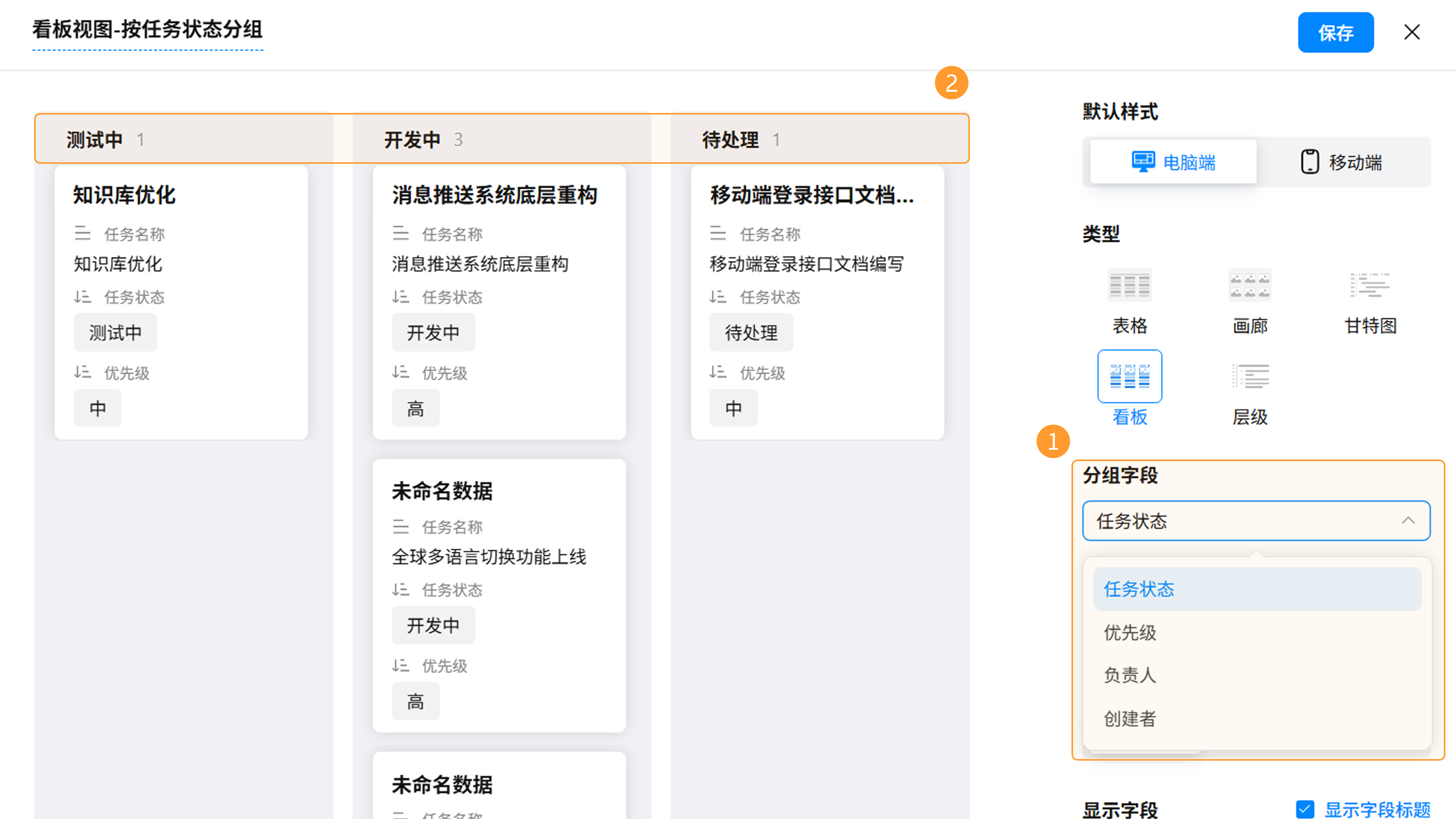 分组字段是看板视图的核心配置,决定了看板中“列”的划分依据。