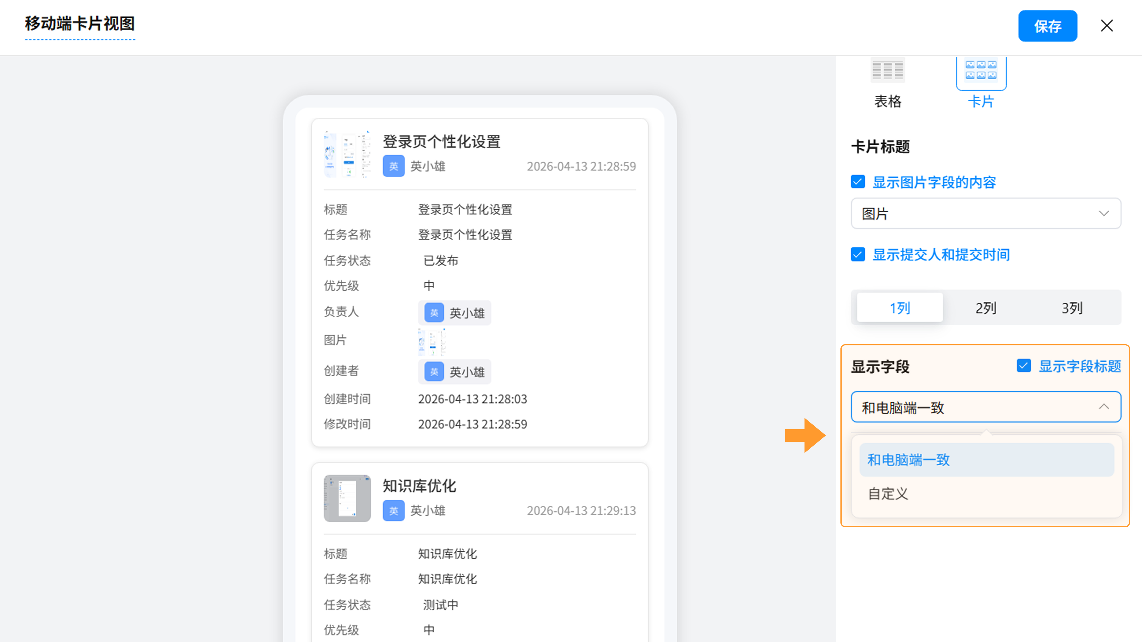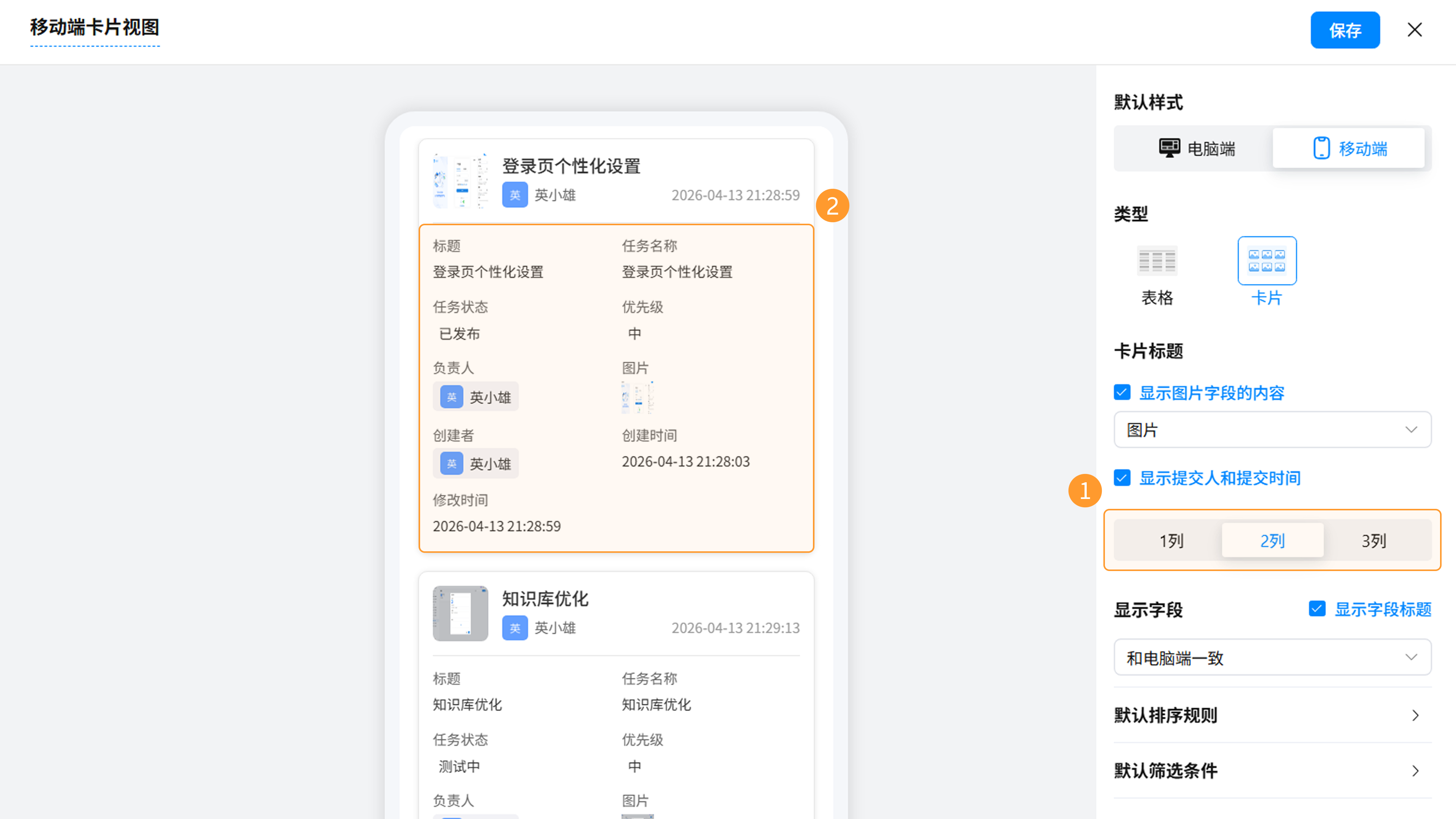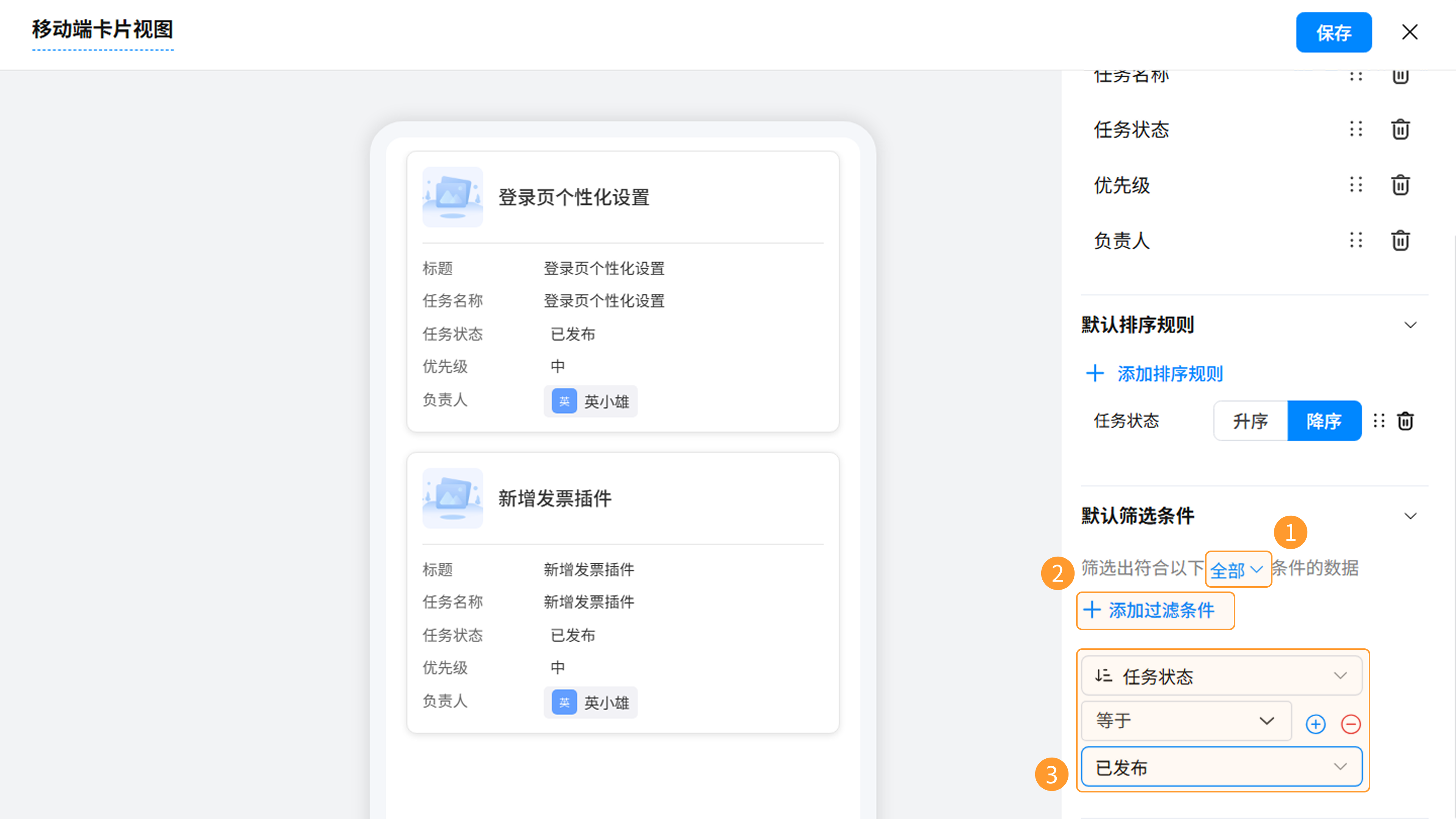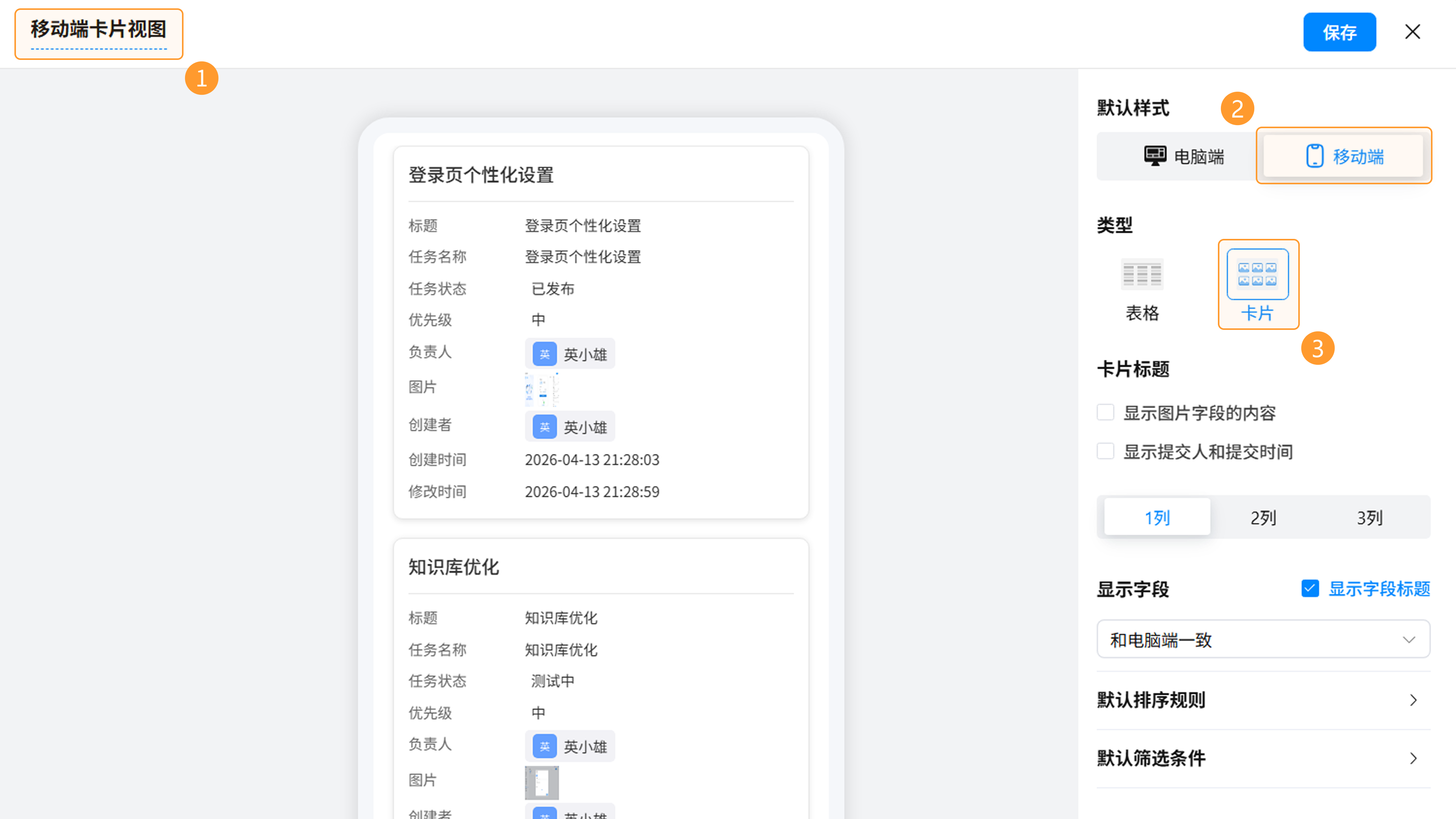 移动端卡片视图设置完成后,点击 「保存」 按钮。